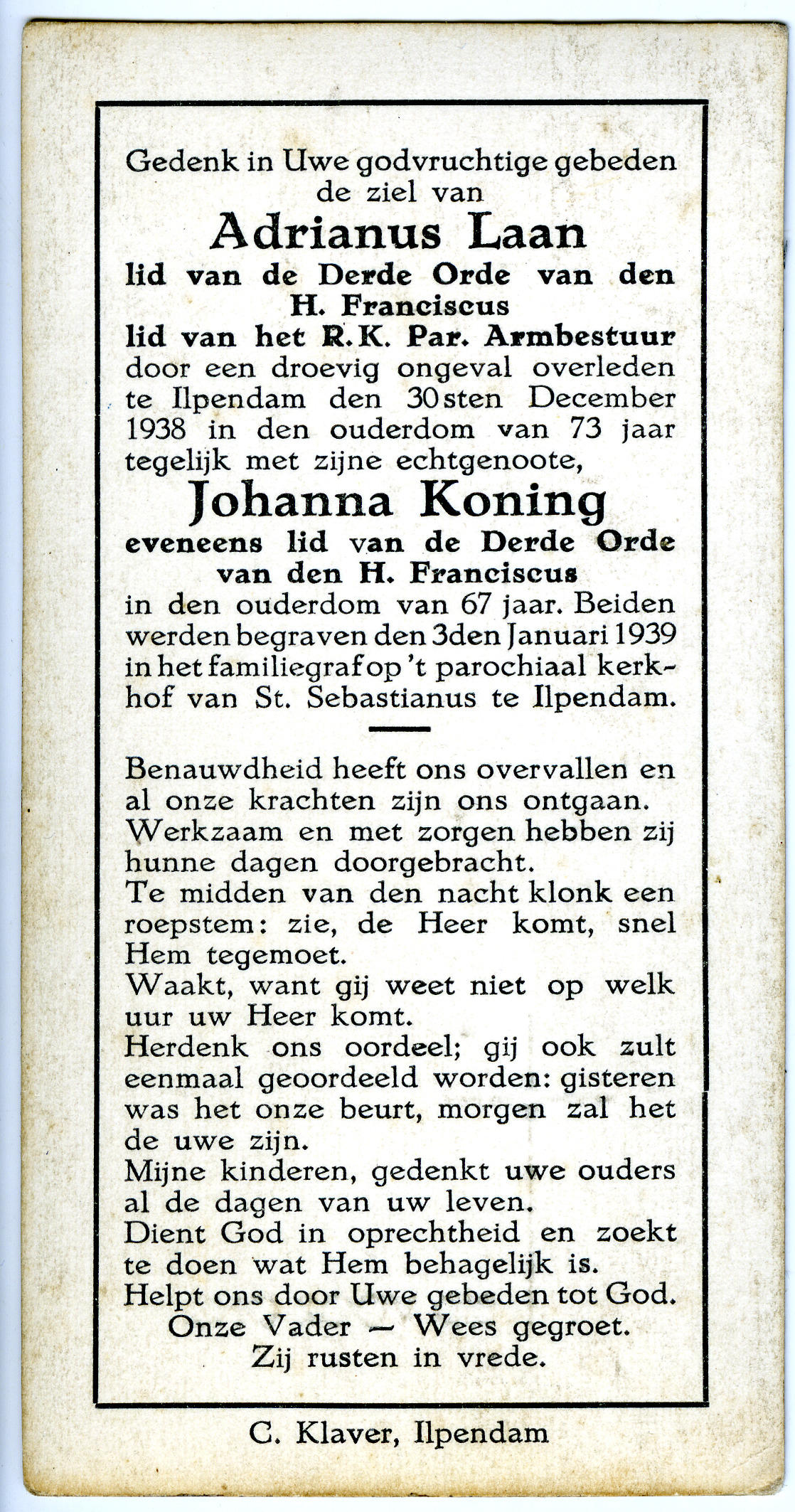 Bidprentje ter gedachtenis aan het echtpaar Johanna (Jantje) Koning en Adrianus (Ariën) Laan. Johanna is geboren op 18 september 1871 in Schagen. Adrianus was landbouwer in de Beemster. Hij is geboren op 8 februari 1865 in Wervershoof. Het echtpaar kwam op 30 december 1938 om bij een noodlottig ongeval in Ilpendam. Johanna draagt de West-Friese ...