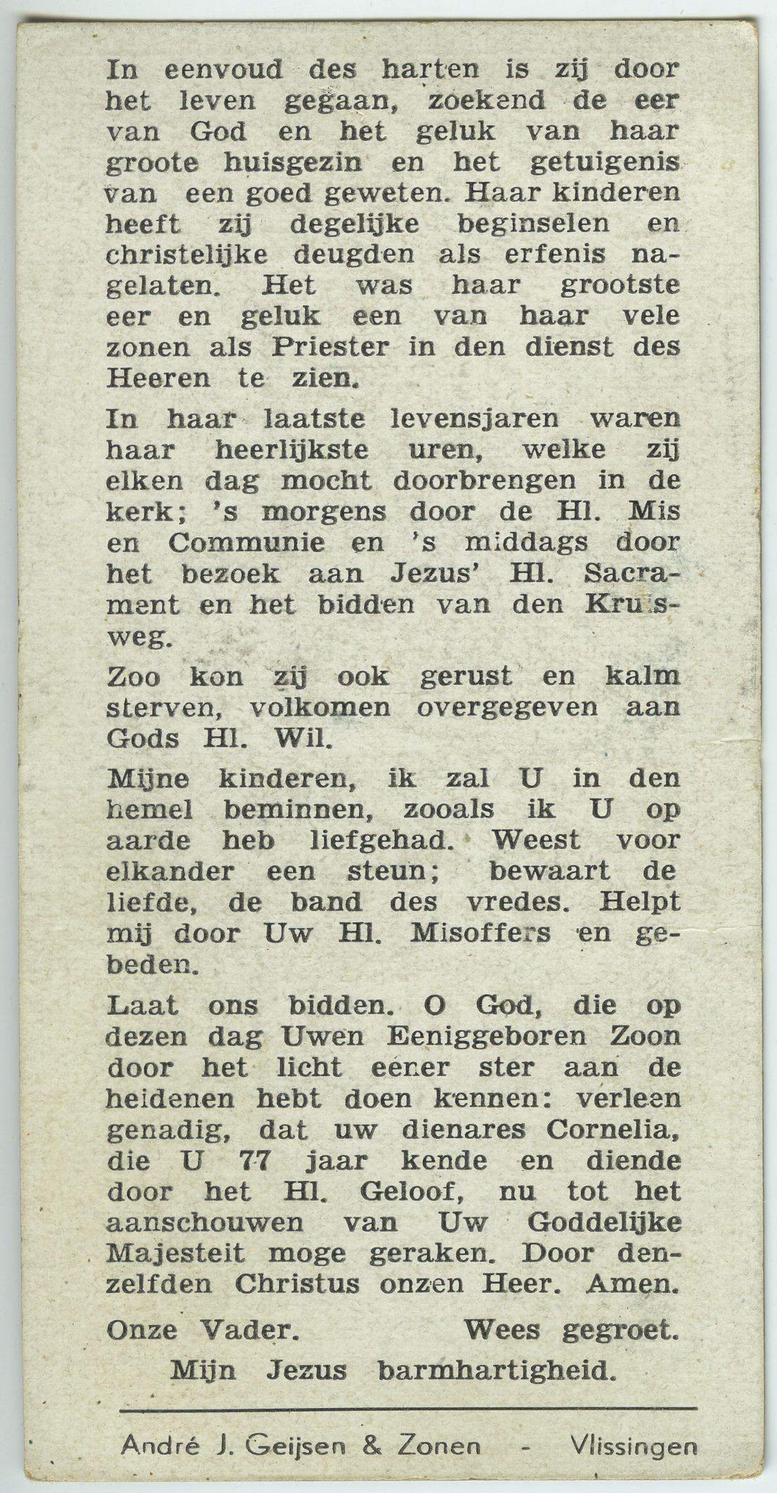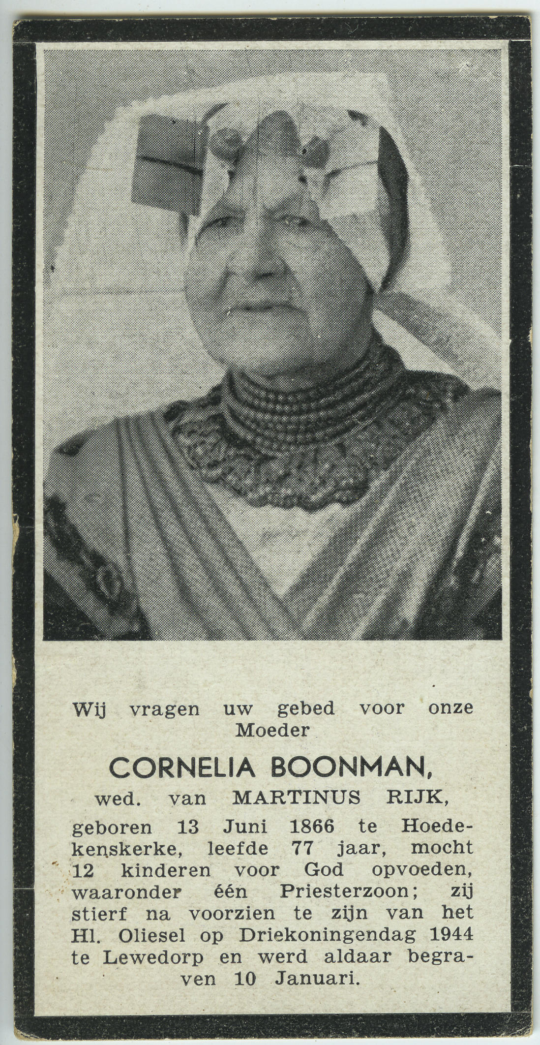 Bidprentje ter gedachtenis aan Cornelia Rijk-Boonman, geboren op 13 juni 1866 in Hoedekenskerke en overleden op 6 januari 1944 in Lewedorp. Cornelia was gehuwd met landbouwer Martinus Rijk. Ze is op de foto gekleed in katholieke Zuid-Bevelandse streekdracht.