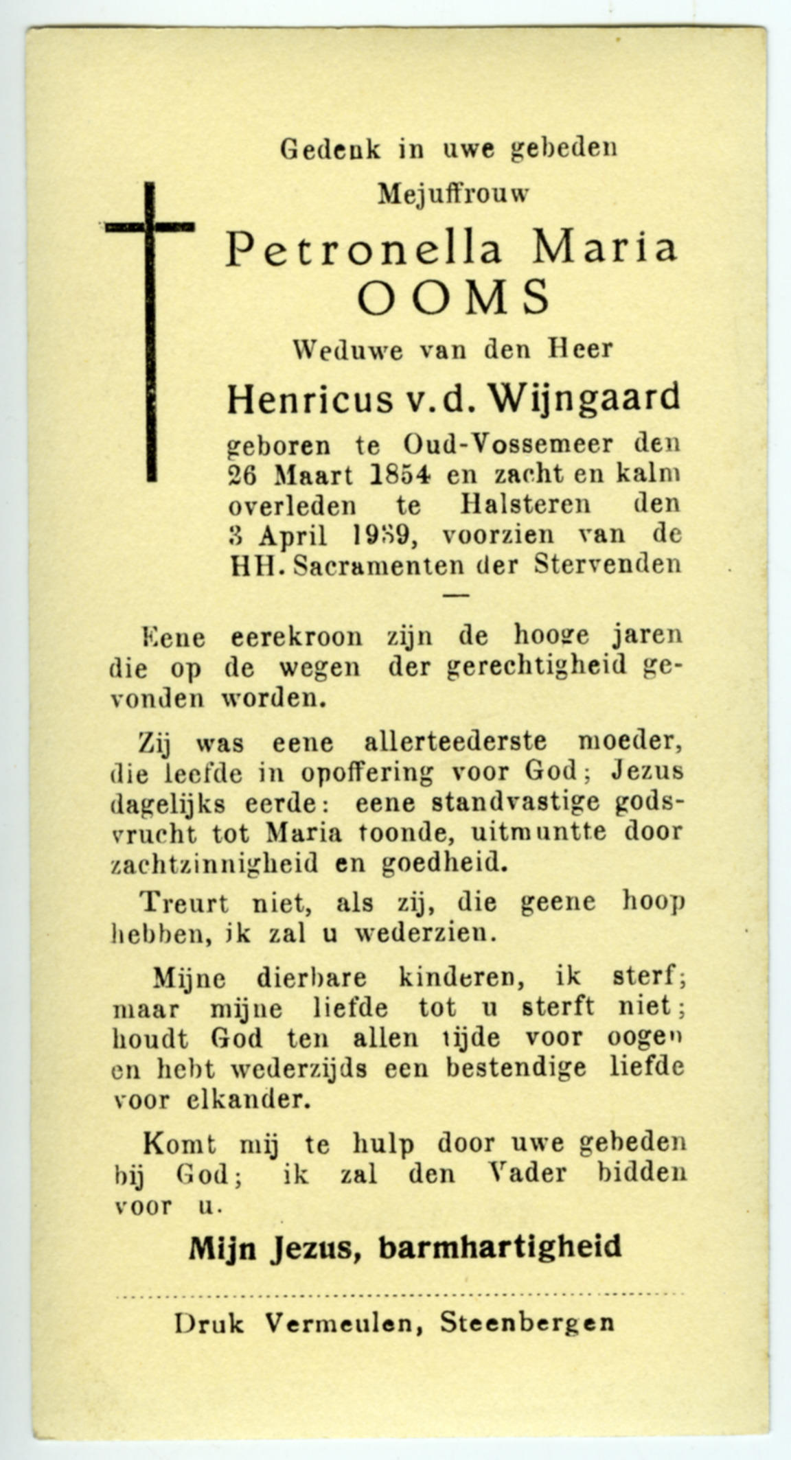 Bidprentje ter gedachtenis aan Petronella Maria van de Wijngaard-Ooms, geboren in Oud-Vossemeer op 26 maart 1854 en overleden op 3 april 1939 in Halsteren. Petronella Maria is gekleed in West-Brabantse streekdracht.