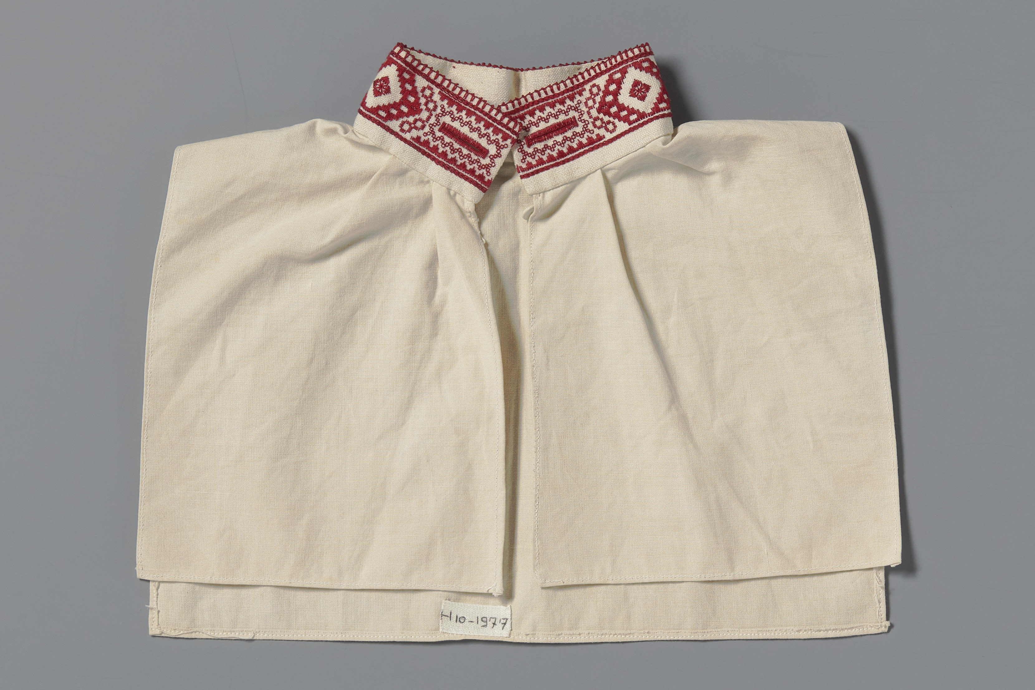Losse halsboord, gedragen door een jongen in Marker streekdracht. Door de beide knoopsgaten wordt een keelknoop gestoken.