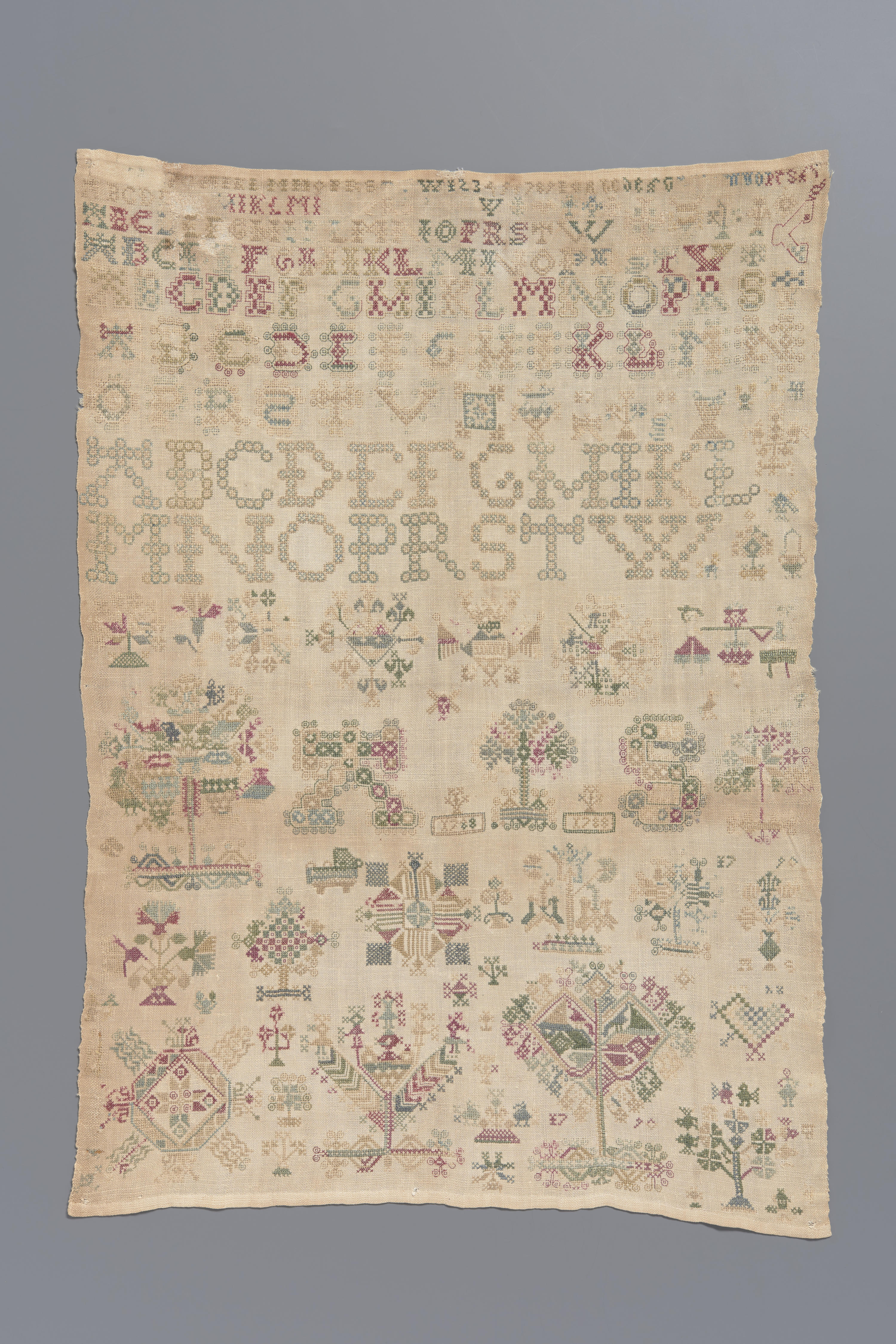 Op deze merklap staan zeven alfabetten, waarvan de laatste twee alfabetten over twee rijen zijn verdeeld. De alfabetten gaan van boven naar beneden, van klein naar groot. Ze zijn in verschillende lettertypes geborduurd en aangevuld met kleine motiefjes en het jaartal ‘1788’. Verder is de grote letter ‘A’ en ‘S’ geborduurd en staat het jaartal ...
