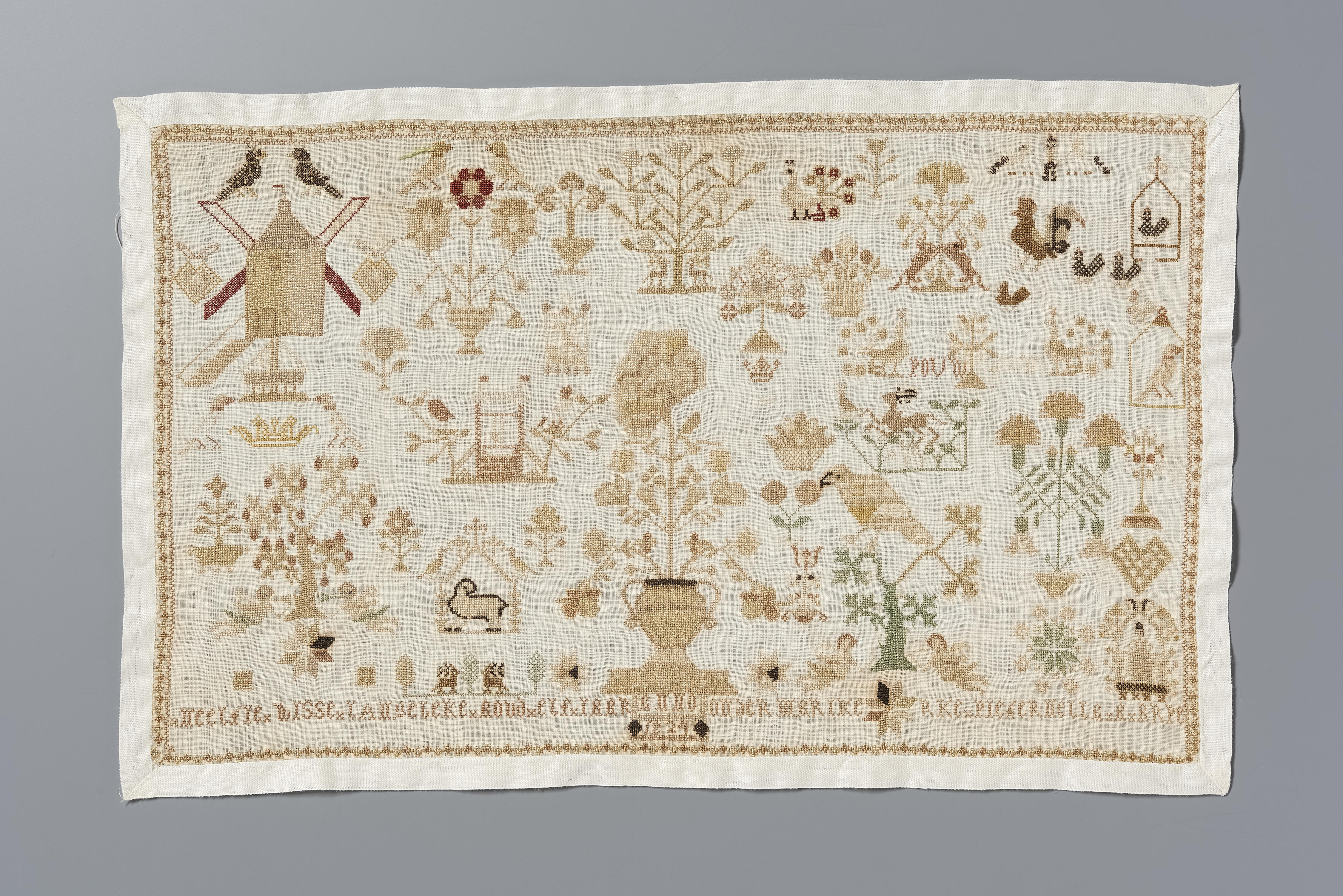 Op de merklap is onderaan van links naar rechts geborduurd: 'NEELTJE x WISSE x BANGEBEKE x AOUD x ELF x JAAR ANNO', met daaronder ‘1824’, 'x ONDER MARIKE' (stermotief) 'RKE x PIETERNELLA x A x ARPE'. Deze tekst is in Gotisch lettertype gemaakt. In de lap staan ook de initialen ‘POVW’ geborduurd.