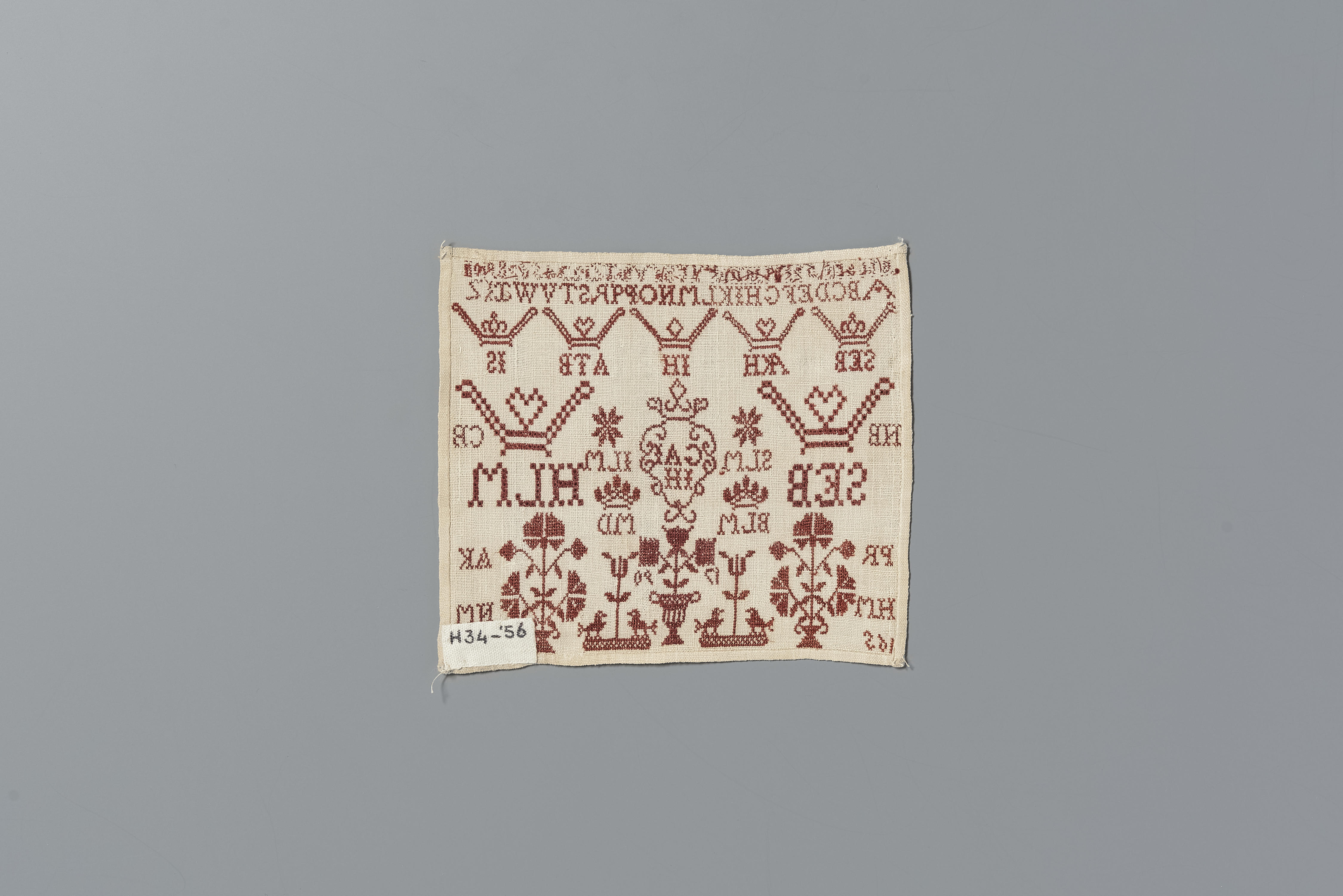 Merklap van linnen, in kruissteektechniek geborduurd. Deze merklap is gemaakt in het Diaconieweeshuis in Amsterdam. Na opname in het weeshuis kreeg een weeskind een nummer. De maakster van deze merklap had nummer 165. Dit nummer komt ook voor op de merklap met objectnummer H.35-56, de stoplap van Ageta Litman. De initialen SEB zijn van Sophia ...