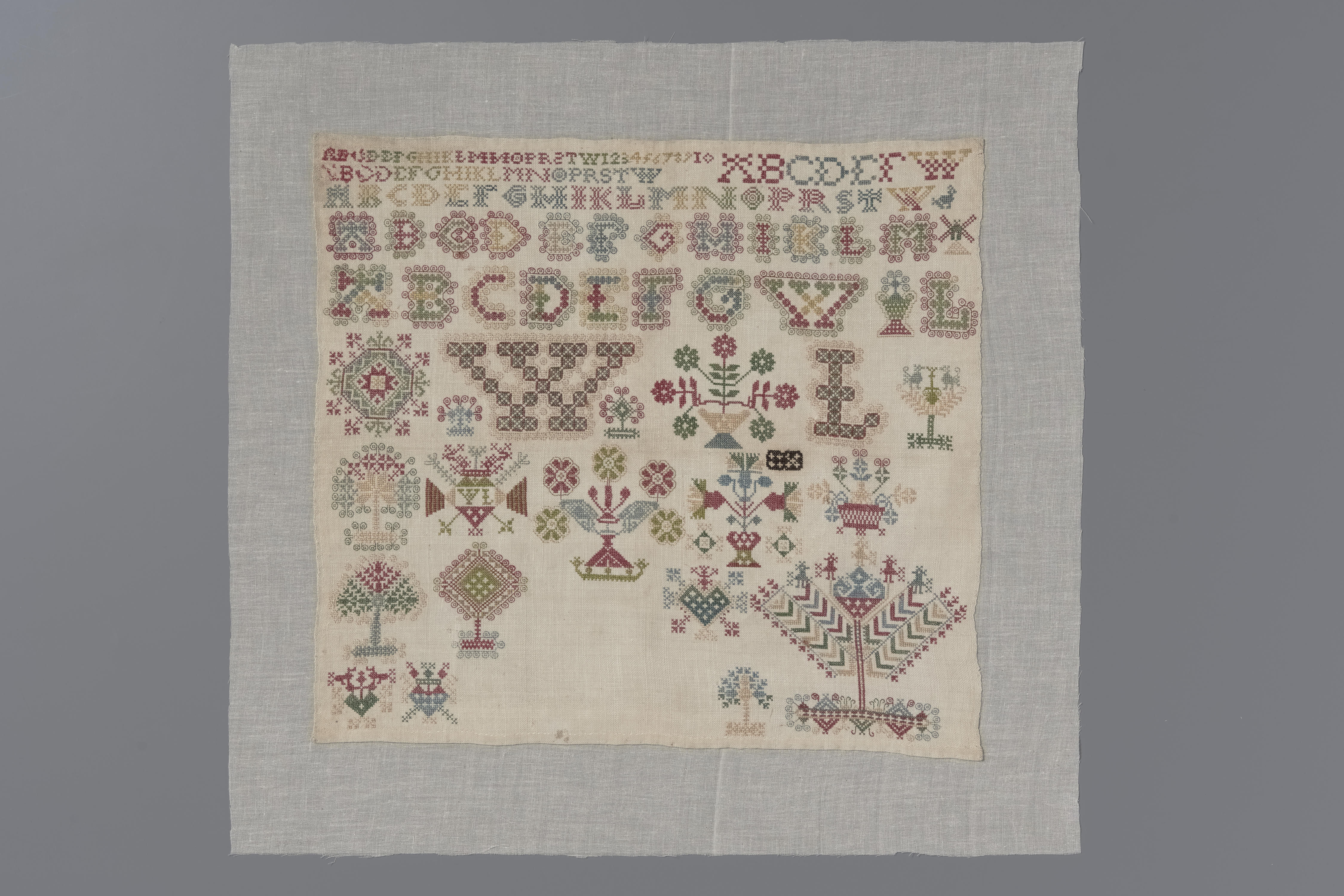 Het bovenste gedeelte van deze letterlap is gevuld met alfabetten in verschillende stijlen. Daarnaast staat er één rij met de cijfers 1 tot en met 10. Het laatste alfabet wordt afgesloten met de initialen ‘W’ en ‘L’, waartussen een bloempotmotief geborduurd is. Onder de alfabetten staan nogmaals de letters ‘W’ en ‘L’, met gekroonde en ...