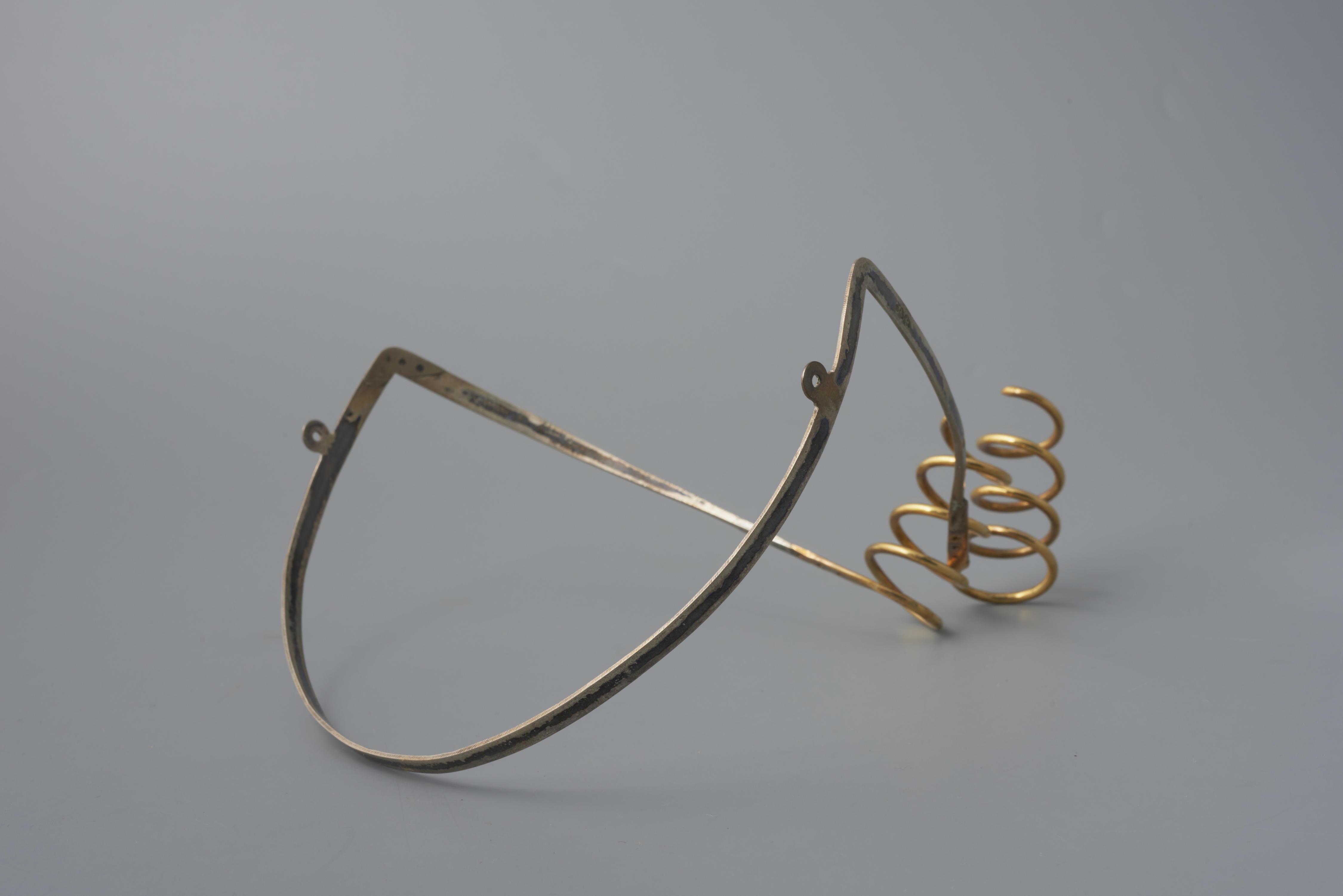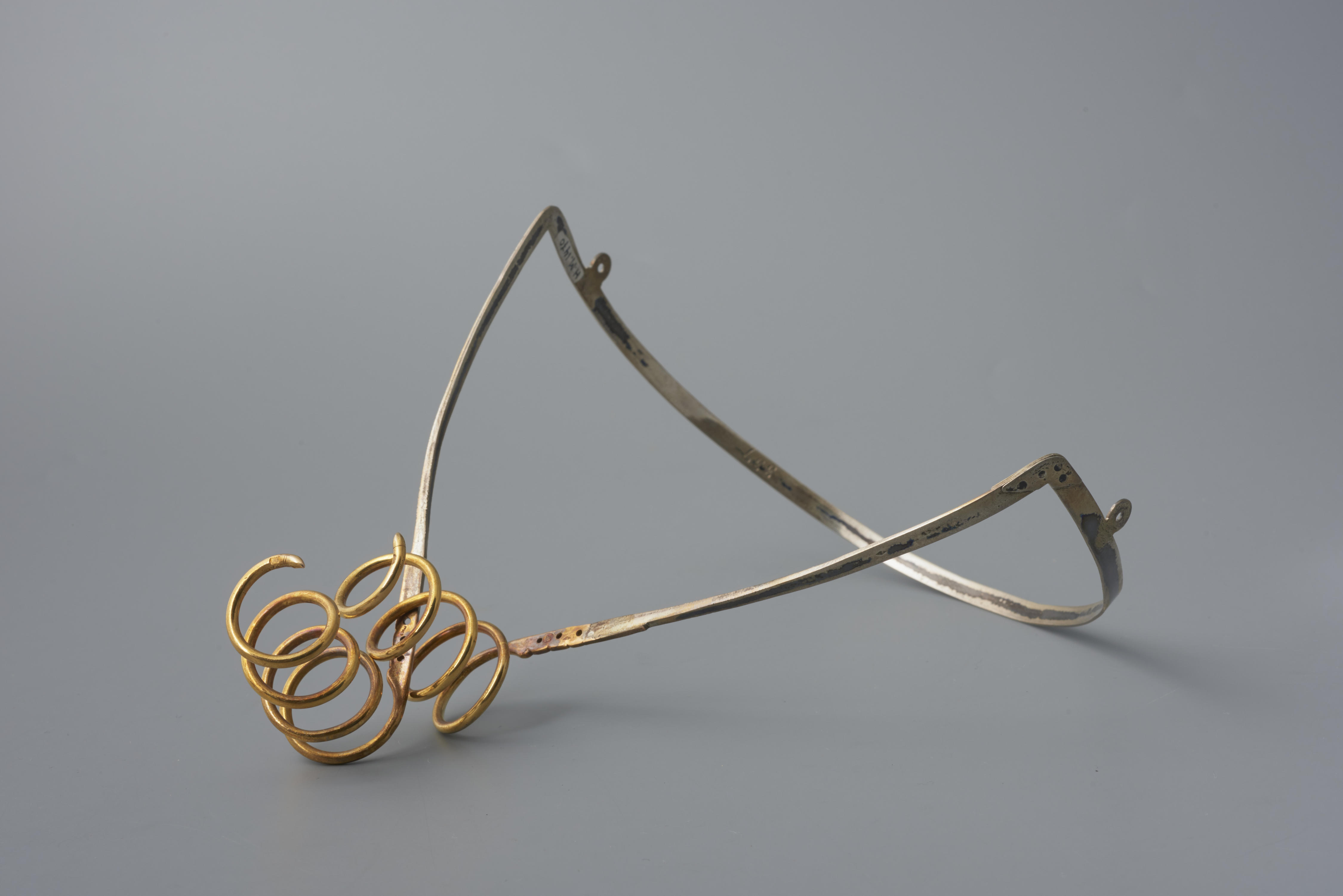 Oorijzer, gedragen door een vrouw in streekdracht uit Nieuw- en Sint Joosland. Het oorijzer bestaat uit een zilveren beugel en twee gouden krullen. De krullen hebben vier windingen. In de aanzet van de krullen zitten drie gaatjes. Door deze gaatjes kunnen spelden worden gestoken om het oorijzer en de muts aan elkaar vast te maken. ...