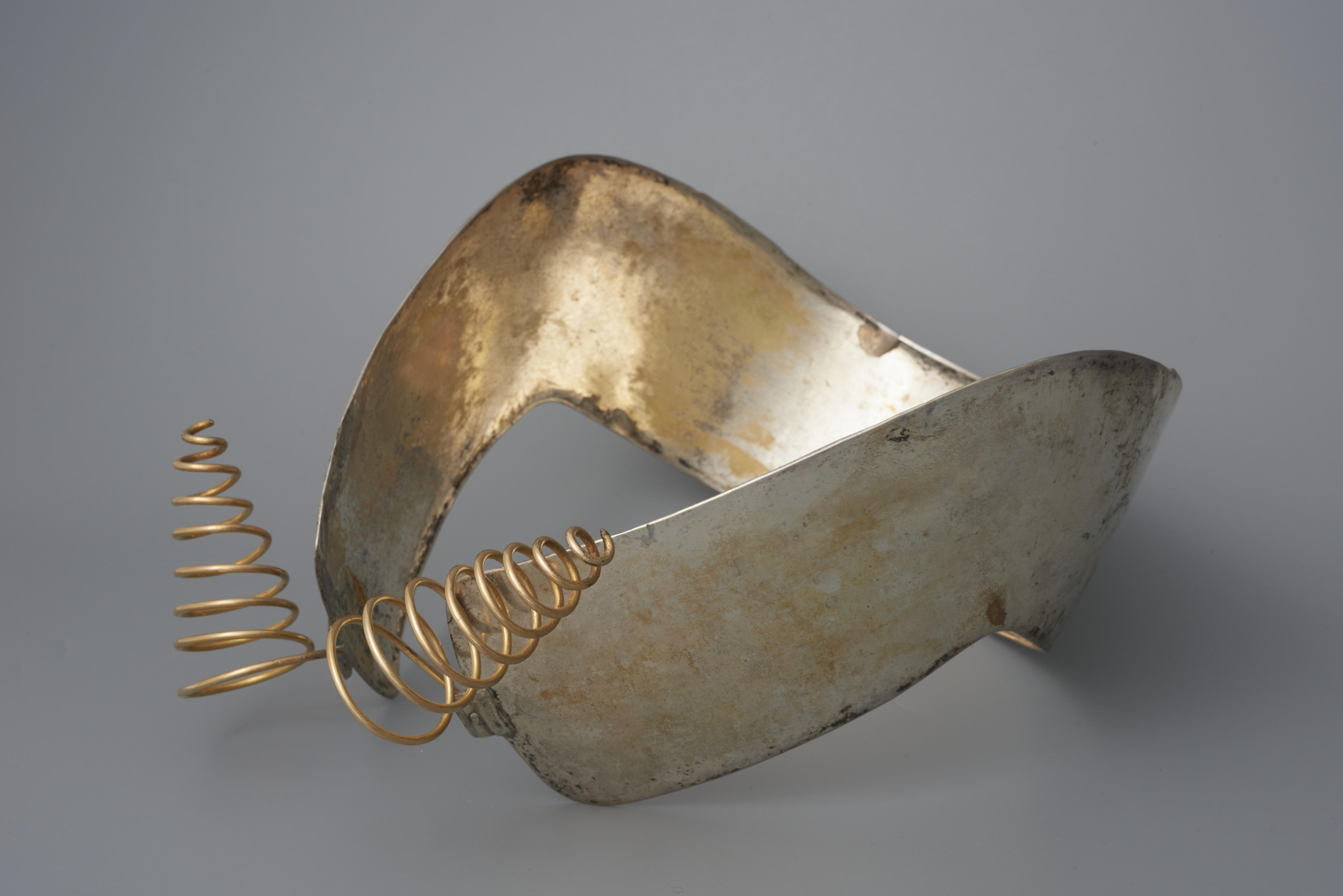 Zilveren oorijzer met spiraalvormige gouden uiteinden of krullen in acht windingen. Aan het aantal windingen, dat kon variëren van zes tot acht, was de welstand van de familie af te lezen. Hoe meer windingen en hoe dikker het gouddraad, hoe meer bezit de familie van de draagster had. In de binnenzijde van de oorijzerband is ...