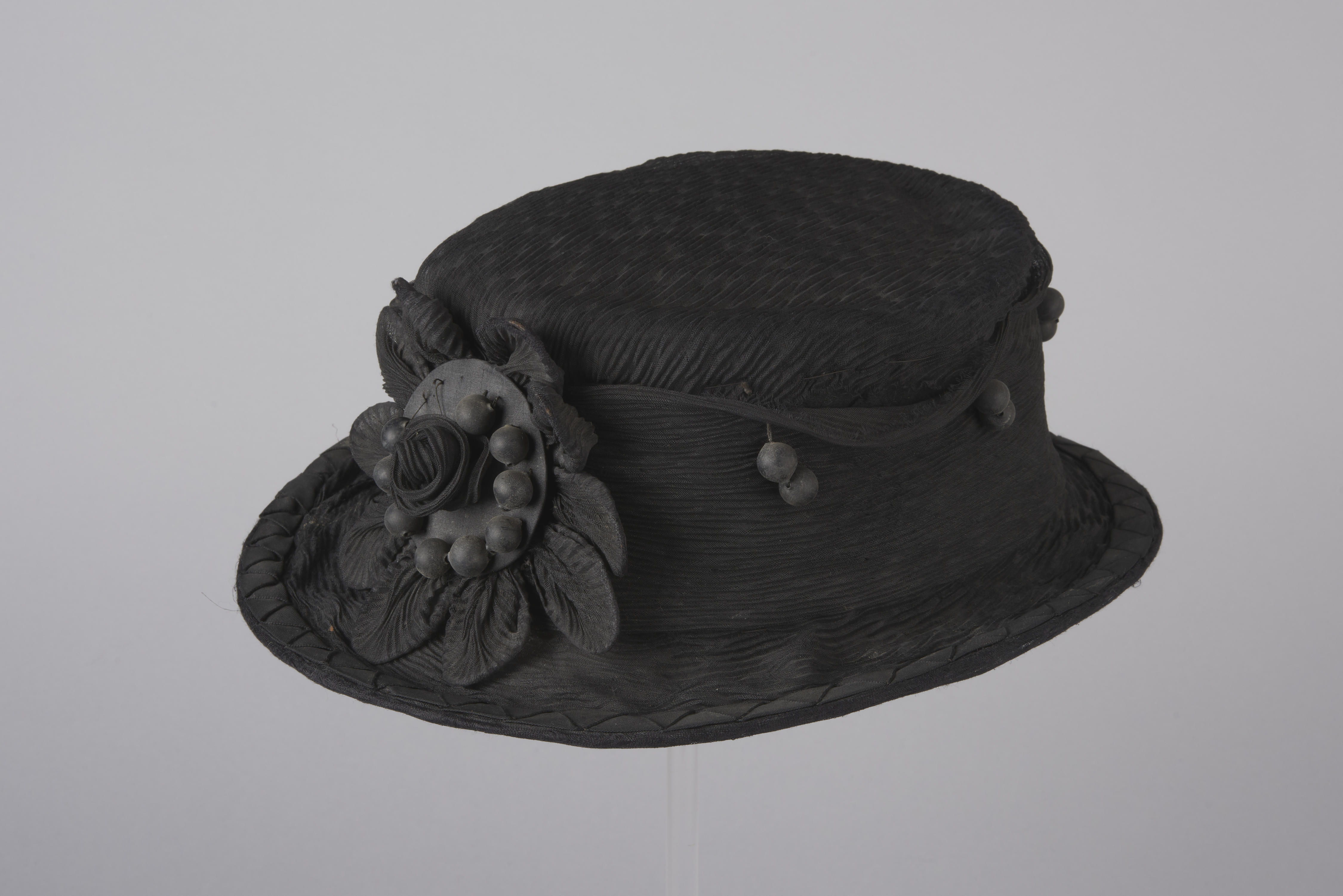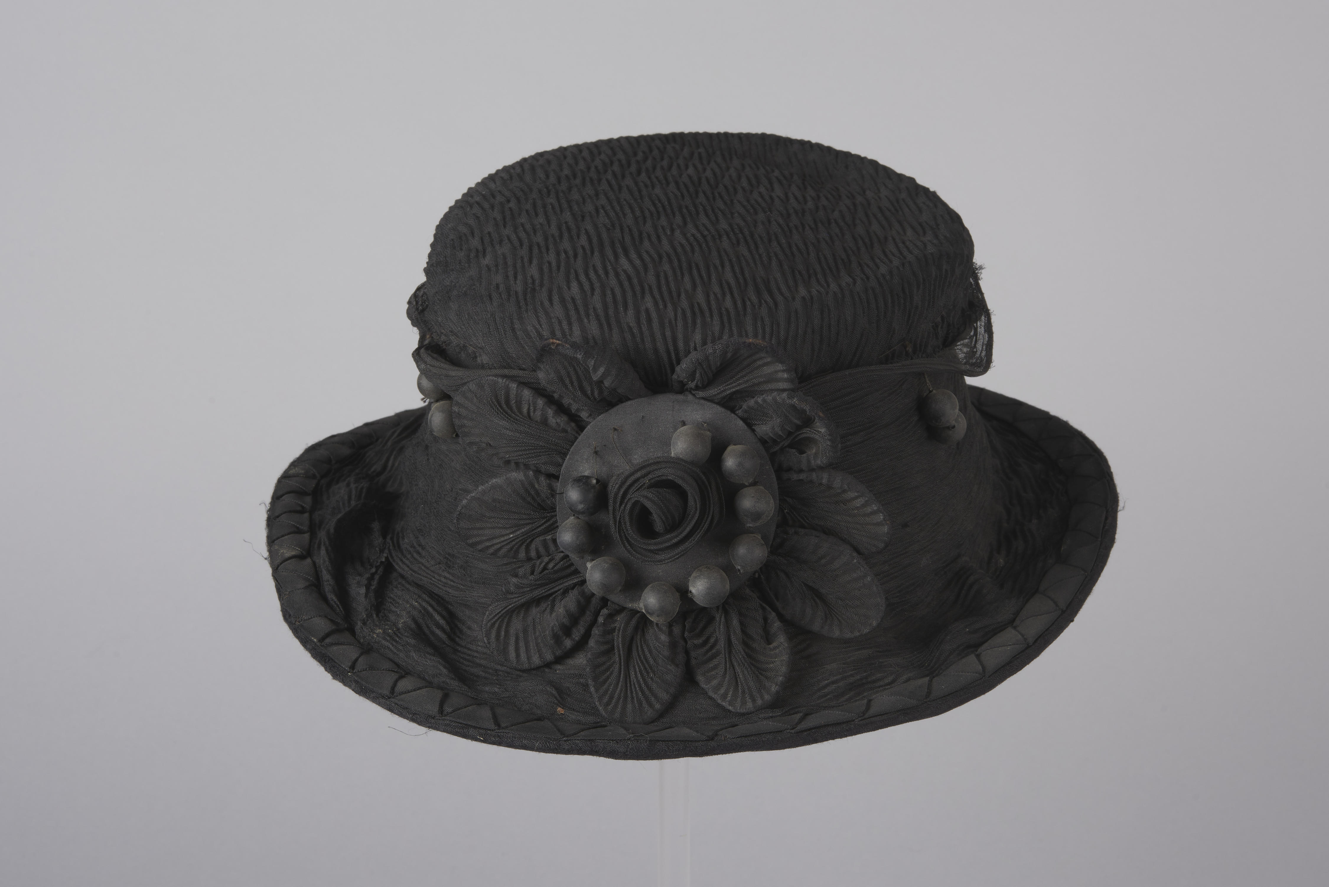 Modieuze, met zwarte rouwcrêpe overtrokken hoed die in de rouw werd gedragen op de sluiermuts. De kralen van de decoratie zijn dofzwart. De dofzwarte kleur is een teken van rouw.
