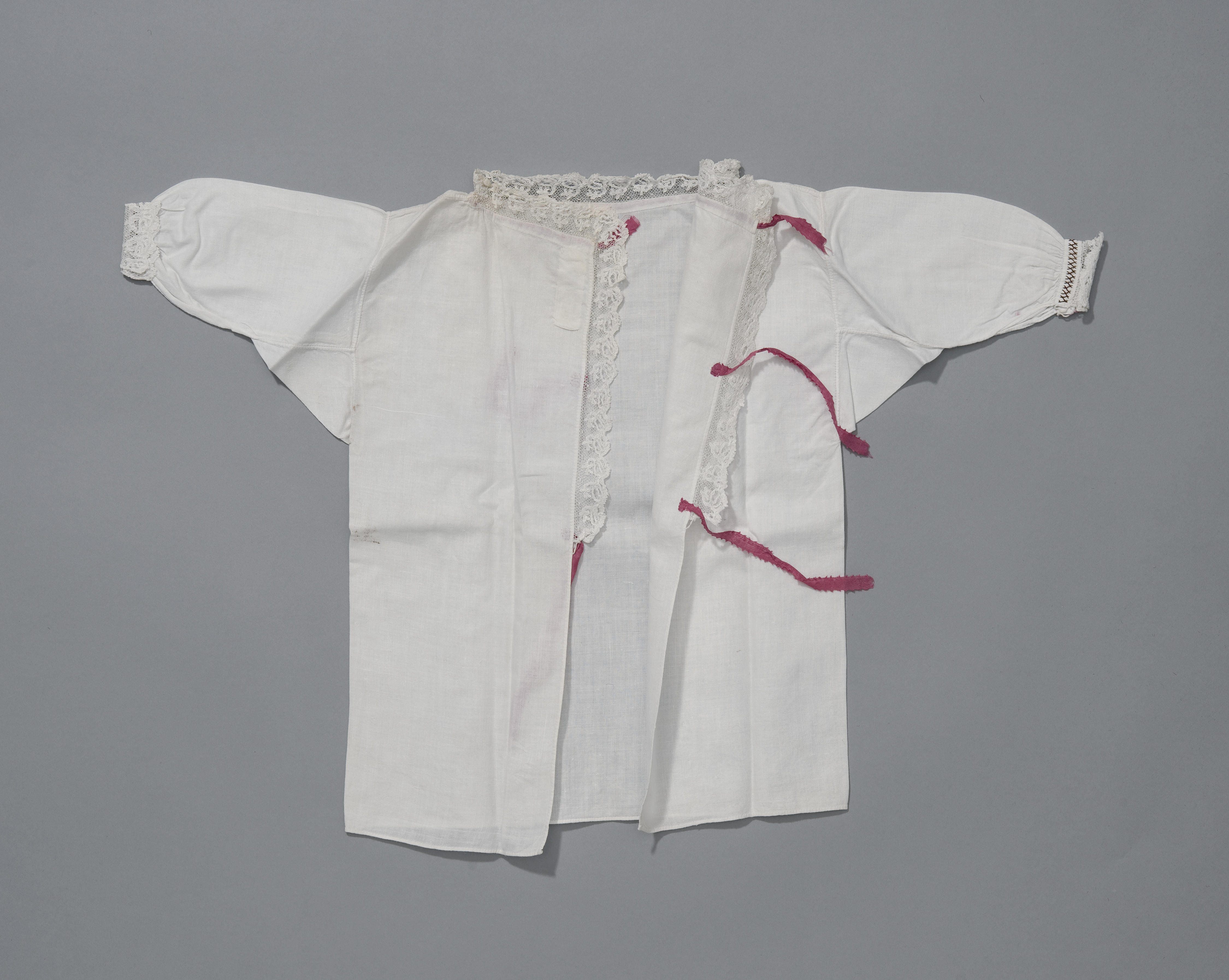 Batisten babyhemdje, afgewerkt met kant langs de hals en de mouwtjes. In Brabant en Zeeland komt vaak een afwerking voor met rozerode accenten, zoals hier de zijden sluitlintjes.