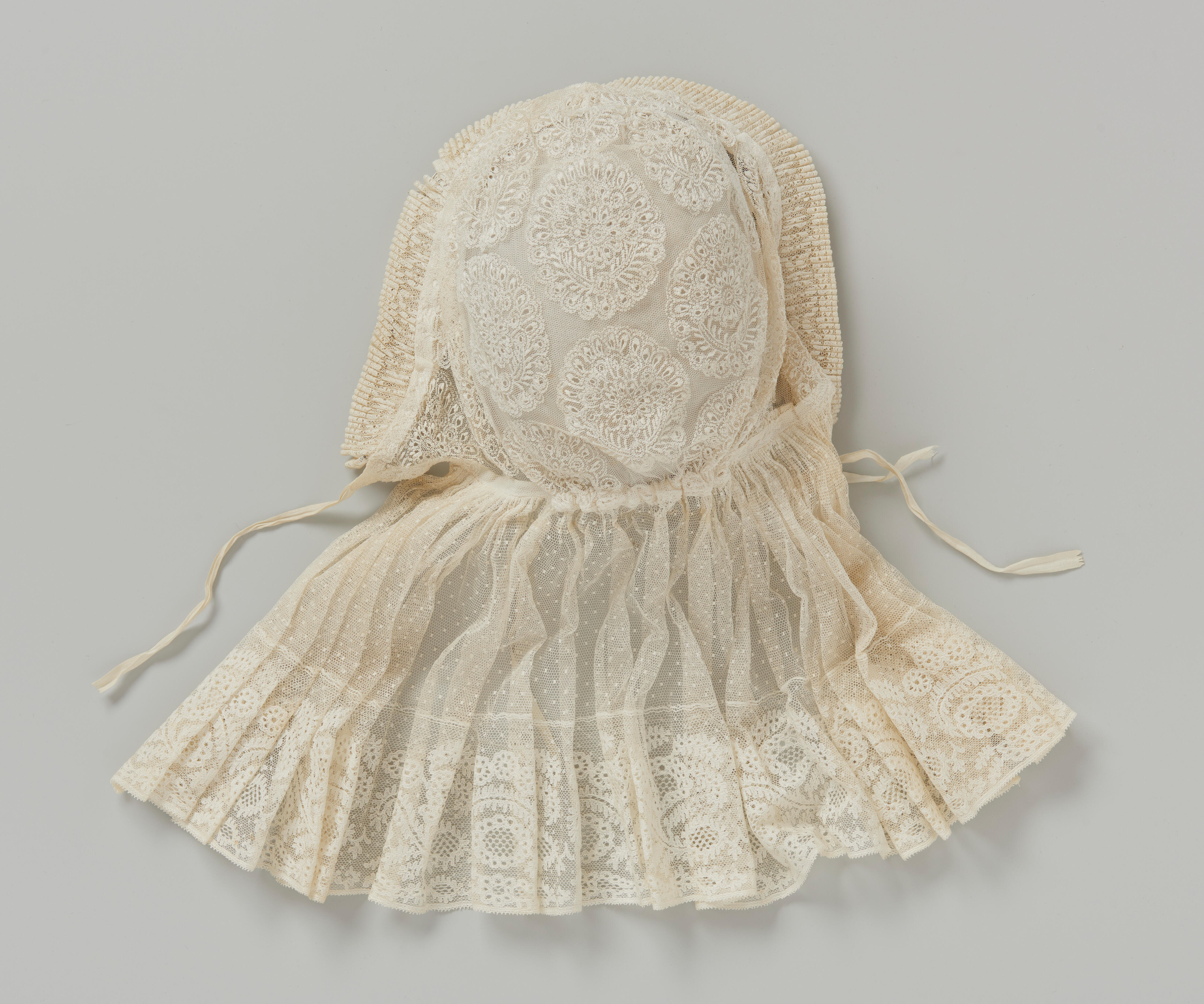 Knipmuts met een bol van geborduurde tule en een gepijpte voorstrook die door laitondraad in model wordt gehouden. De staart is van gemoeste tule en een 9,5 centimeter brede kant. De muts is afkomstig uit De Steeg.