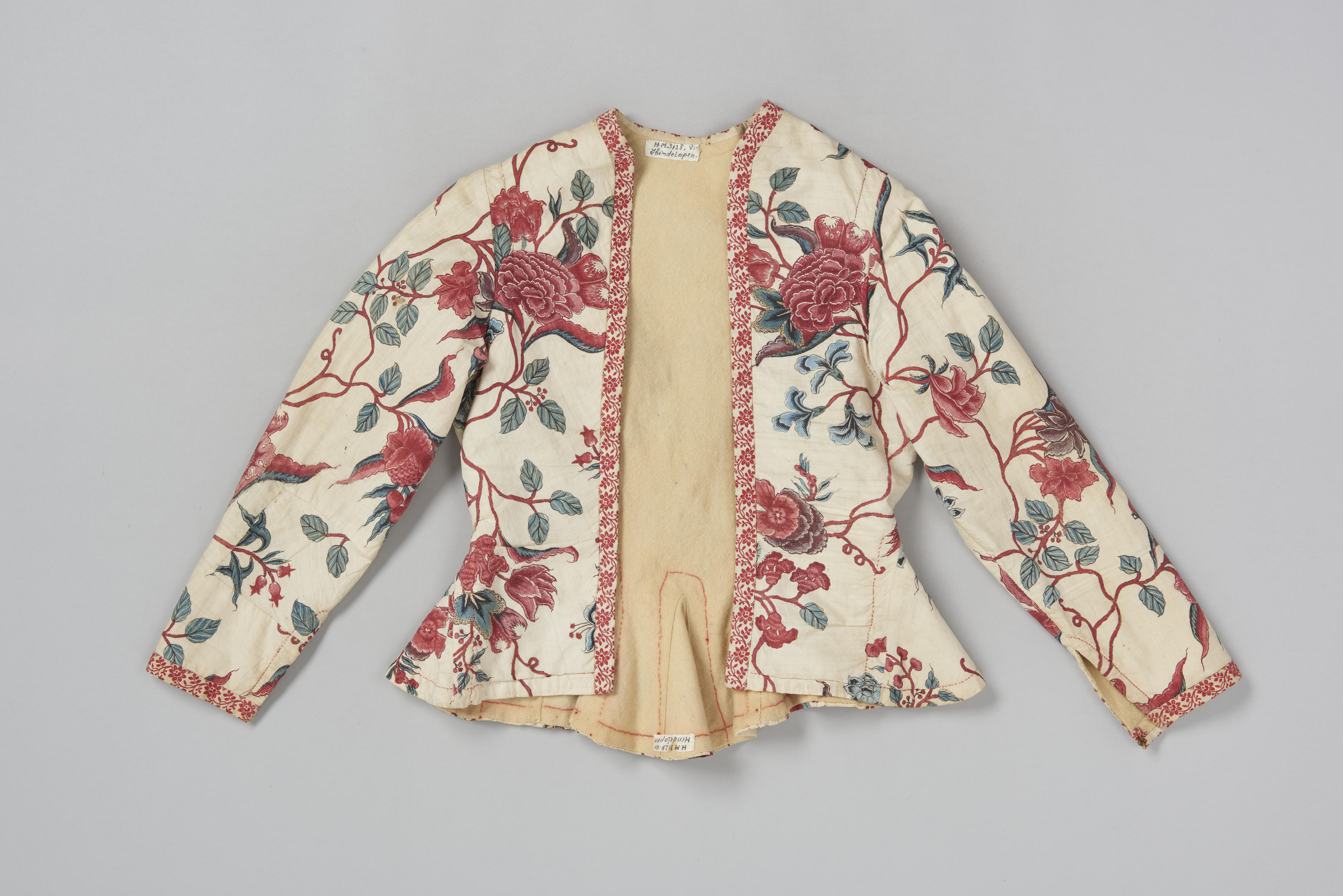 Handgenaaid kort jak van Indiase sits, afgezet met langetband en gevoerd met een moltonachtige stof. Het jak is afkomstig uit Hindeloopen.