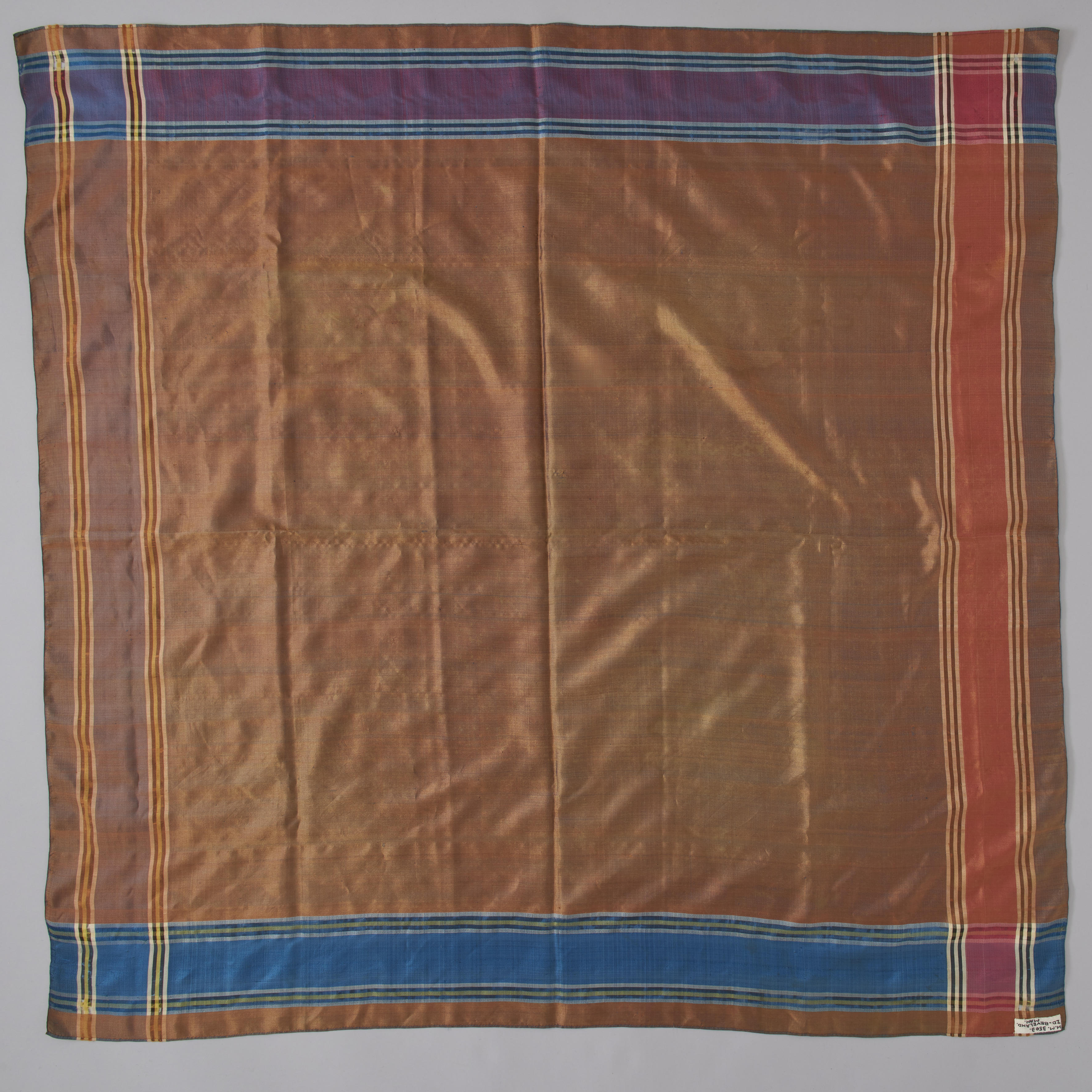Vierkante, changeant geweven zijden halsdoek, afkomstig van Zuid-Beveland. Bij changeant geweven stoffen zijn de ketting- en de inslagdraden verschillend van kleur. Bij verandering van lichtval lijken de kleuren van het weefsel te veranderen.
