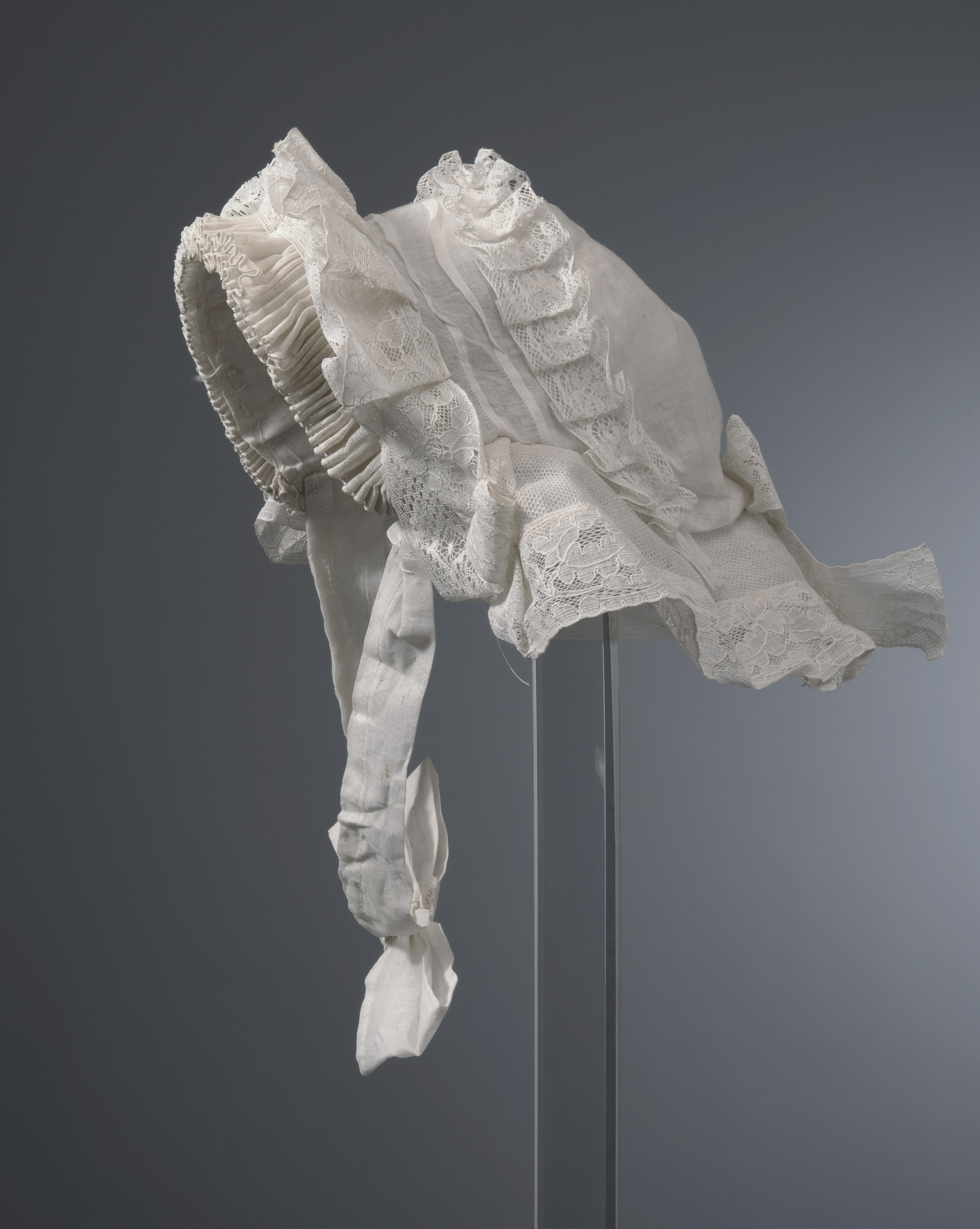 'Morgenmuts' van wit neteldoek, tule en kant. De muts is afkomstig uit Noord-Brabant.