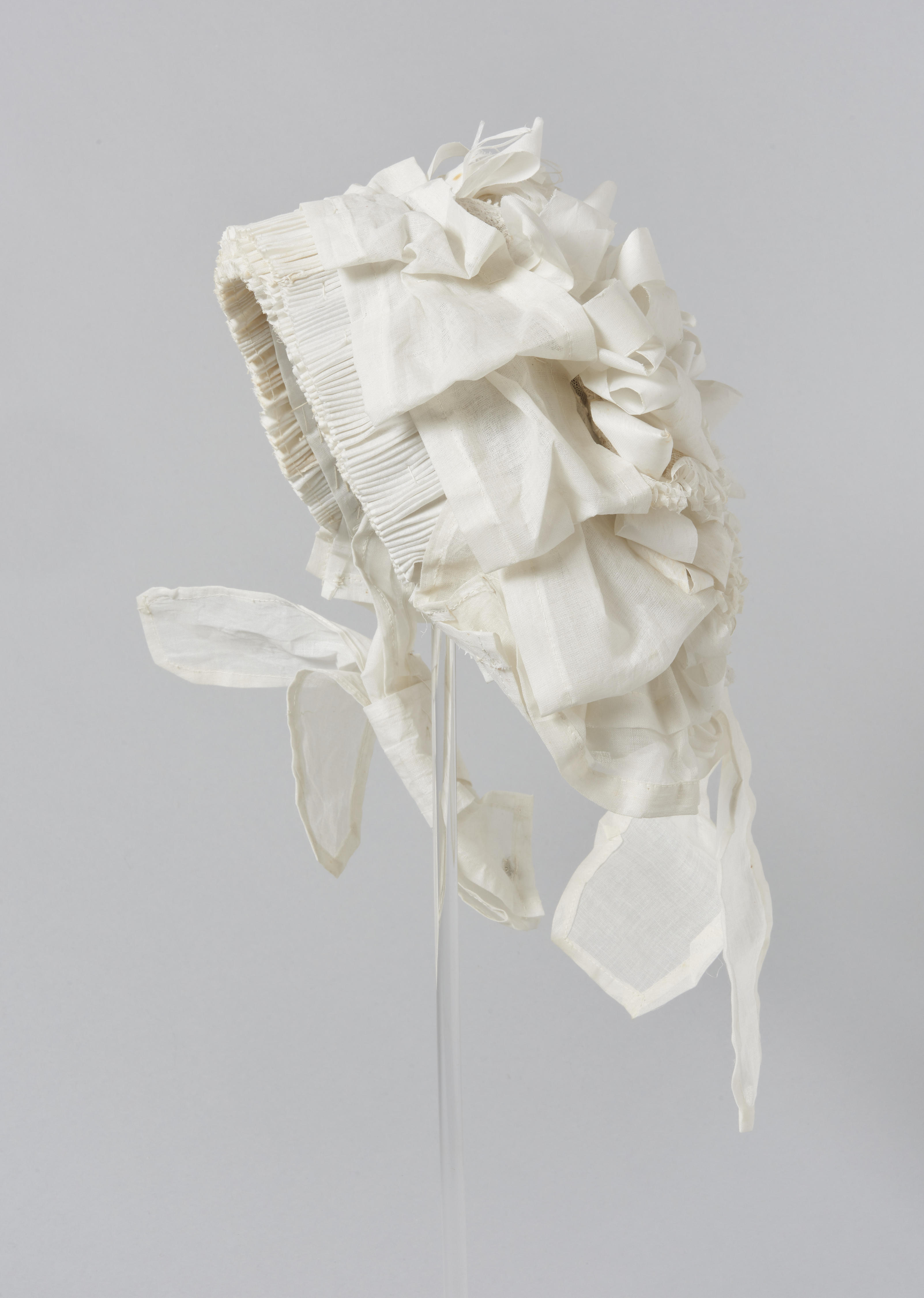 Vrouwenmuts met tulen bol en stroken van neteldoek, afkomstig uit Noord-Brabant.