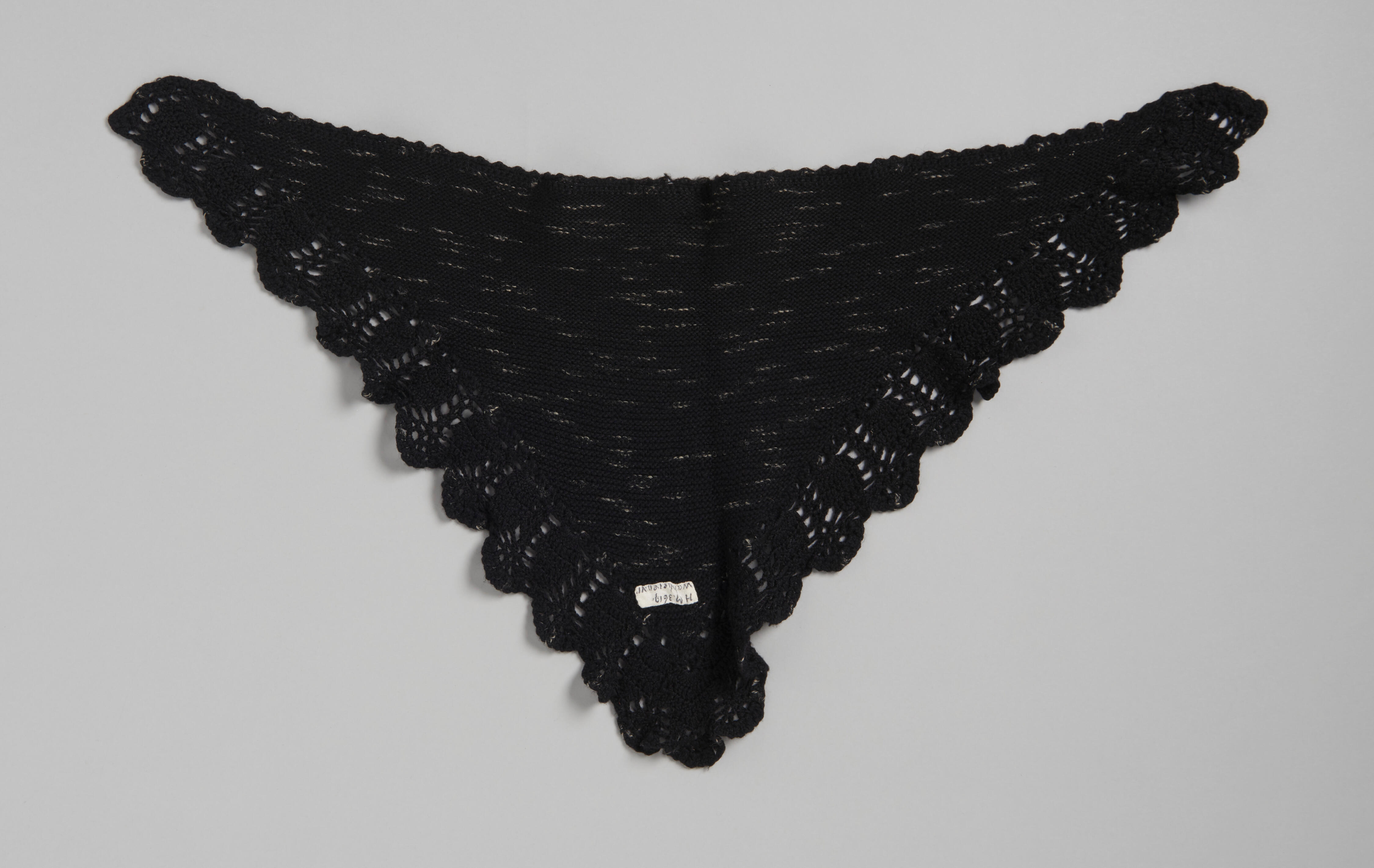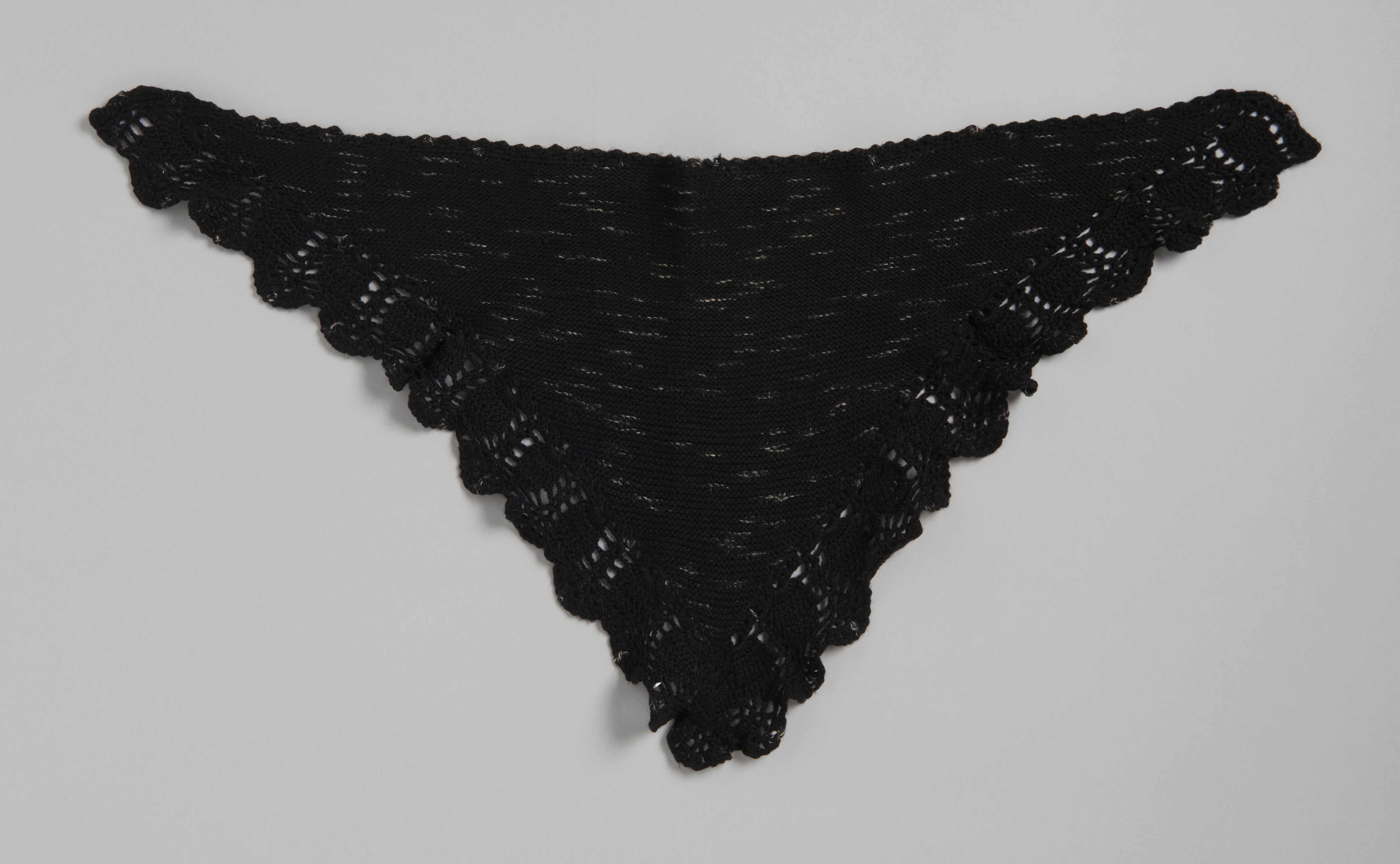 Wollen omslagdoek, gedragen door een vrouw in Walcherse streekdracht. Het driehoekige middendeel is gebreid van zwart-wit gemêleerde wol. Langs de drie zijden is een rand gehaakt.