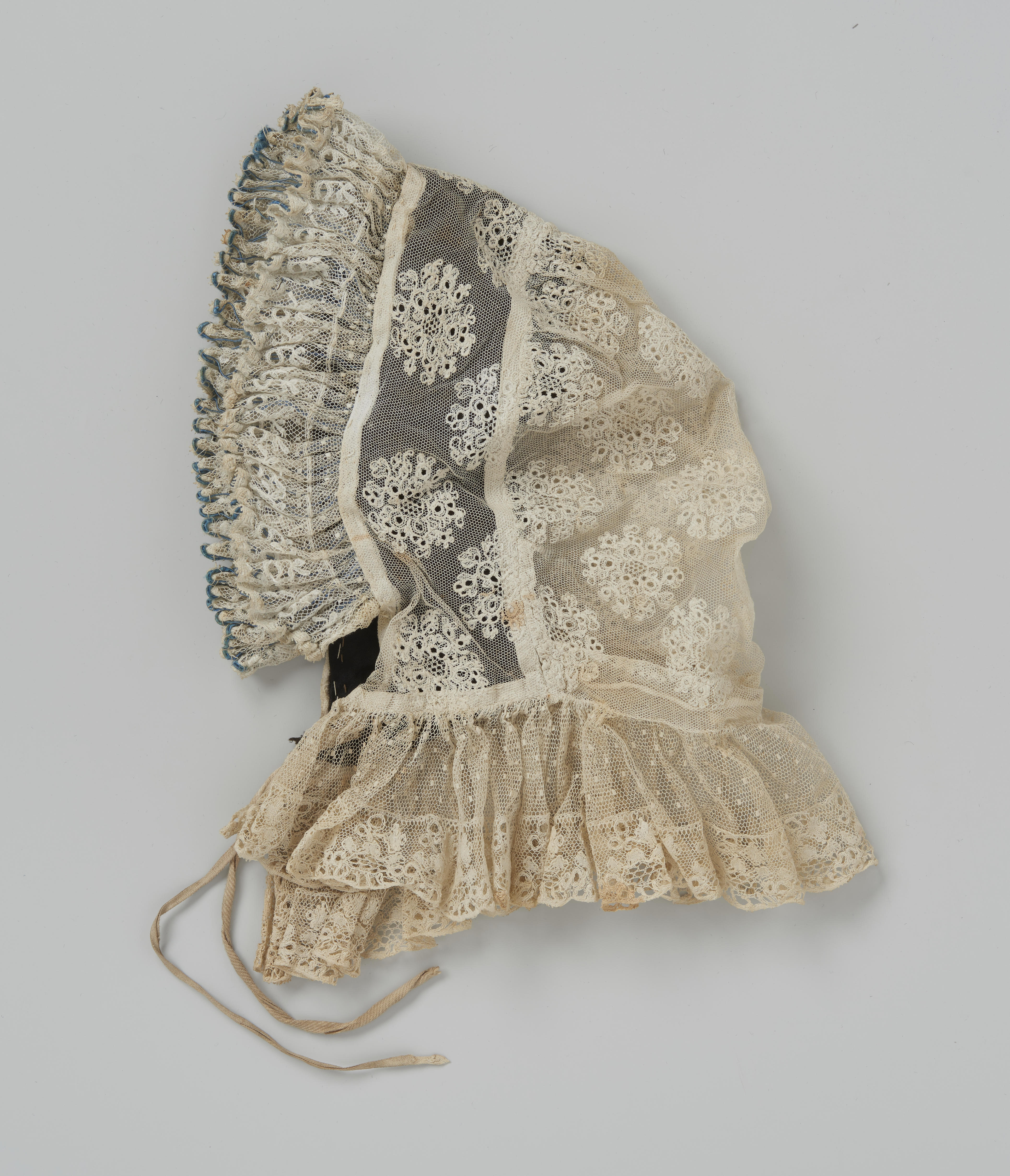 Kornetmuts met een bol van doorgestopte tule. De voorstrook en achterstrook zijn van gemoeste tule met daaraan een vier centimeter breed kloskantje. De voorstrook is verstevigd met blauw laitondraad. In de muts is een dubbelgenomen strook zwarte katoen genaaid.