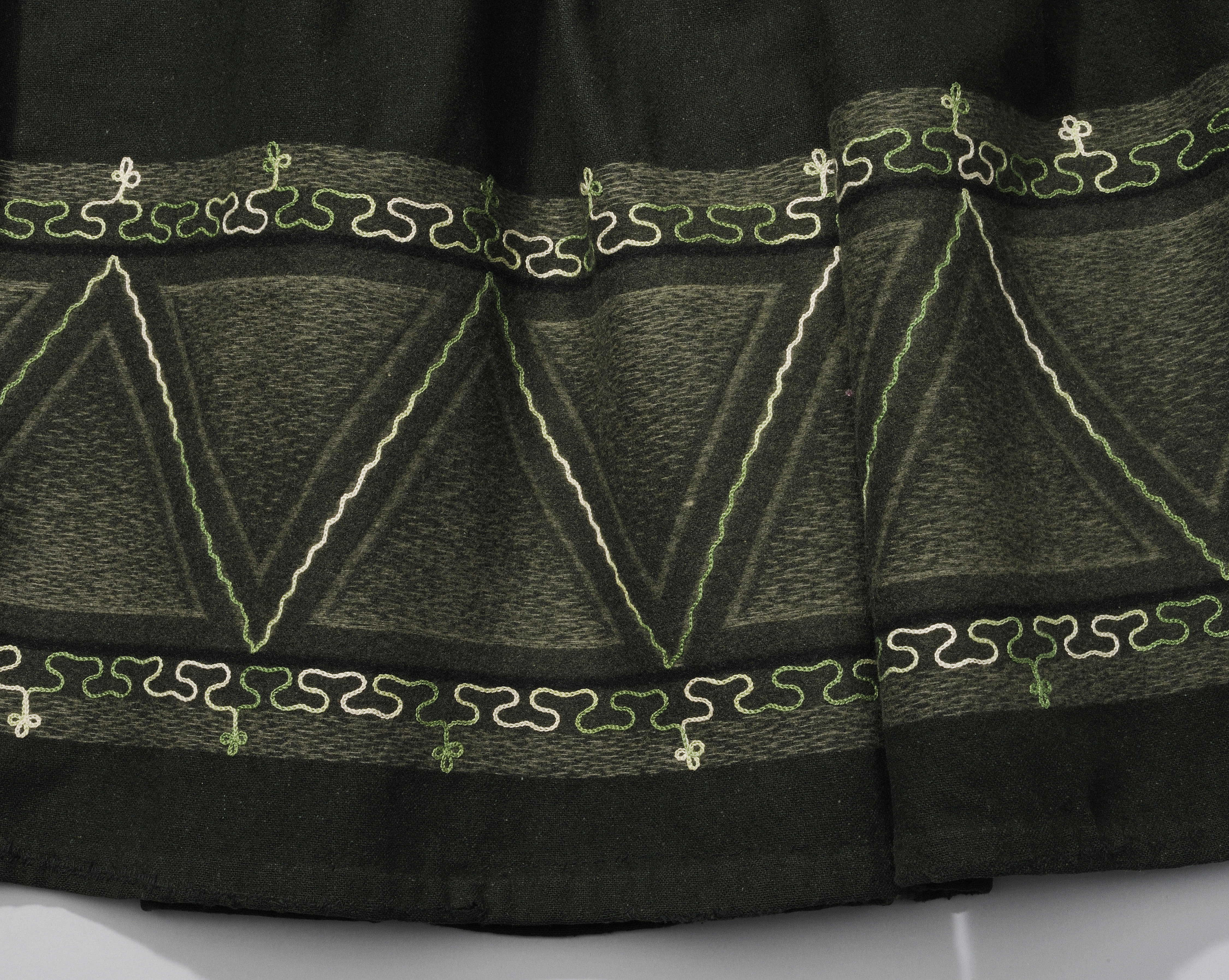 'Randkeus' of 'slikkeus' uit Wemeldinge. Keus is de Zeeuwse benaming voor rok. Een randkeus is een gekleurde molton onderrok met aan de onderkant een versierde, meestal machinaal geborduurde bloemenrand.