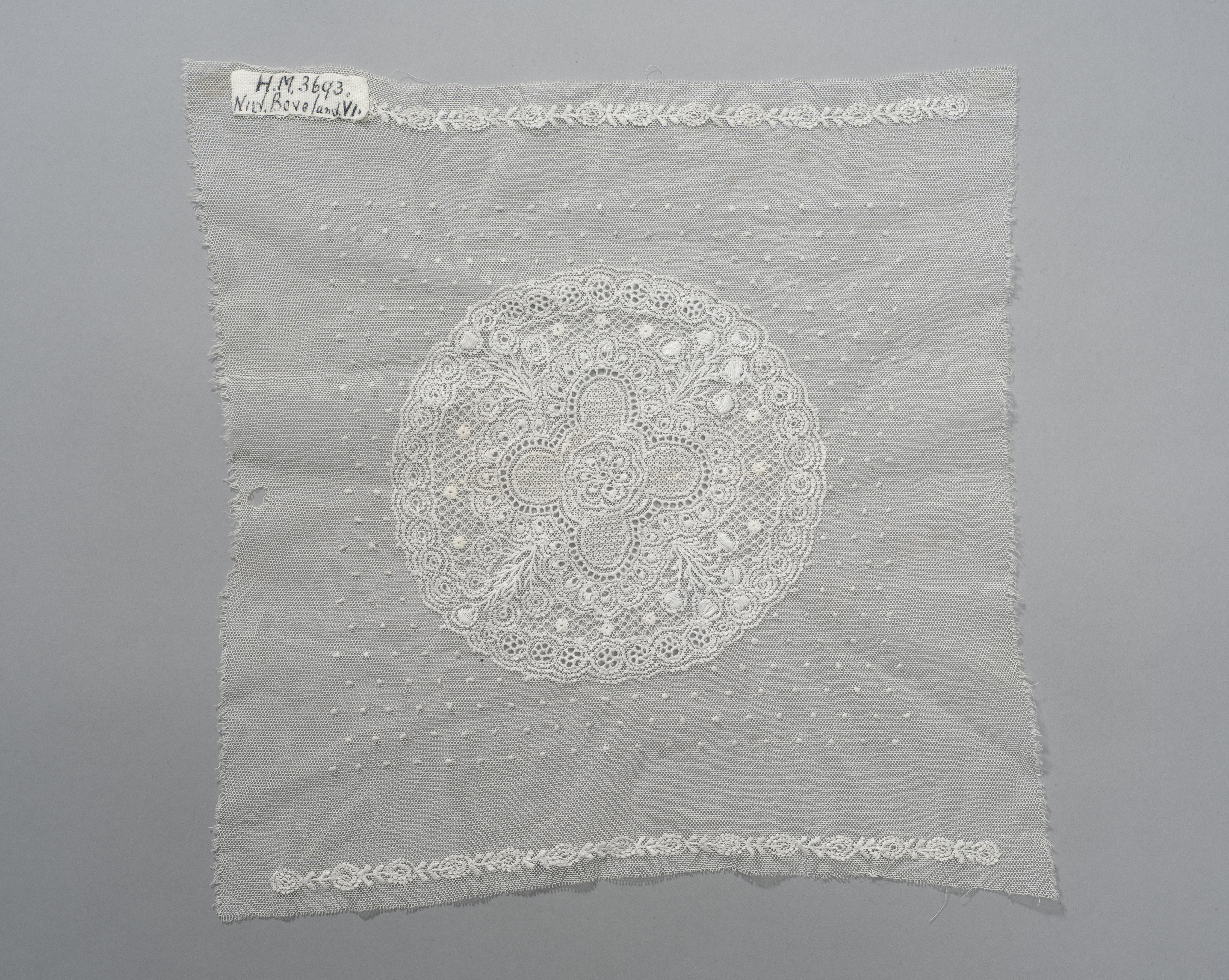 Lap fijne, witte tule met motieven in doorstopwerk. De lap is bedoeld voor de vervaardiging van een mutsenbodem, de bol van een (sluier)muts.