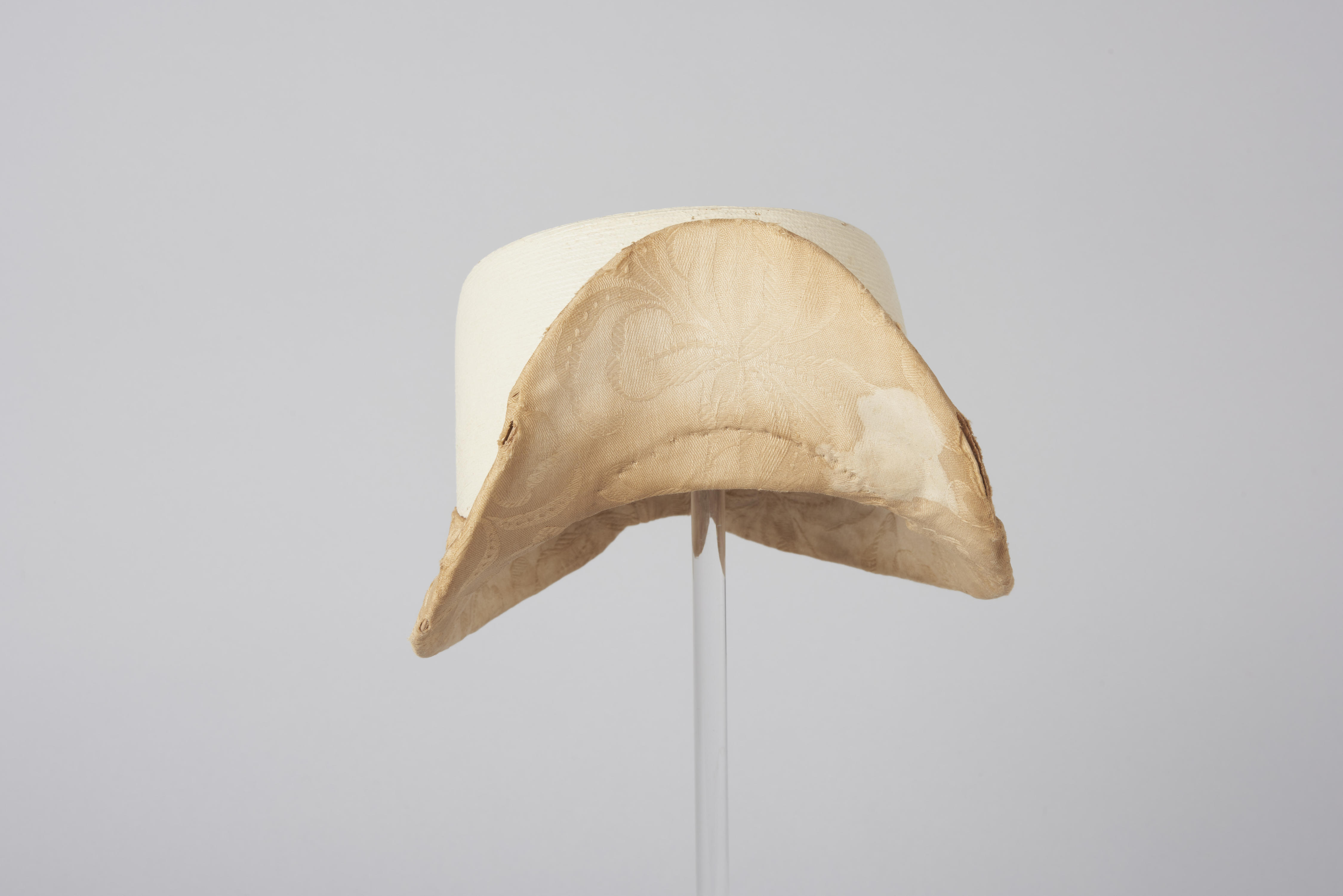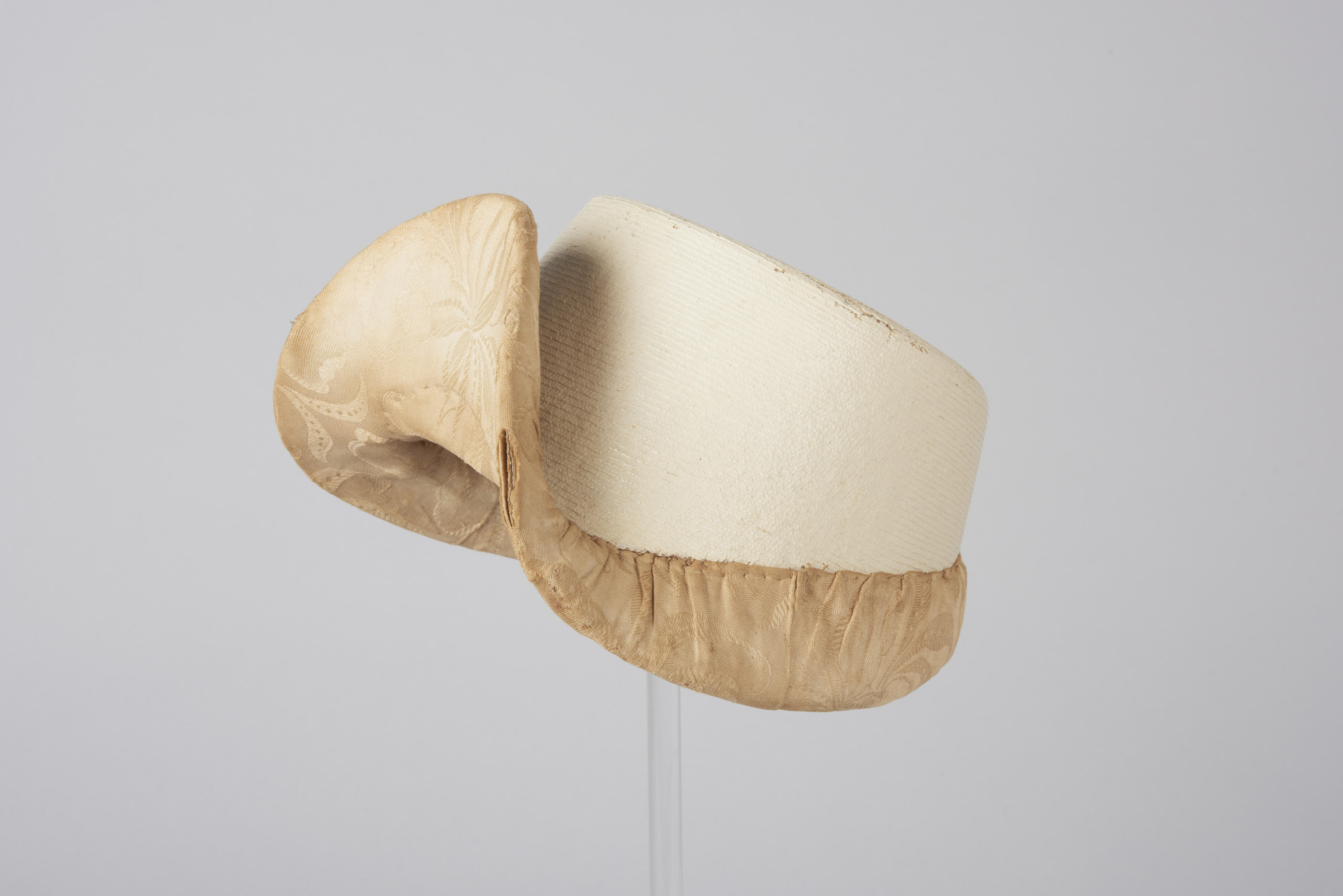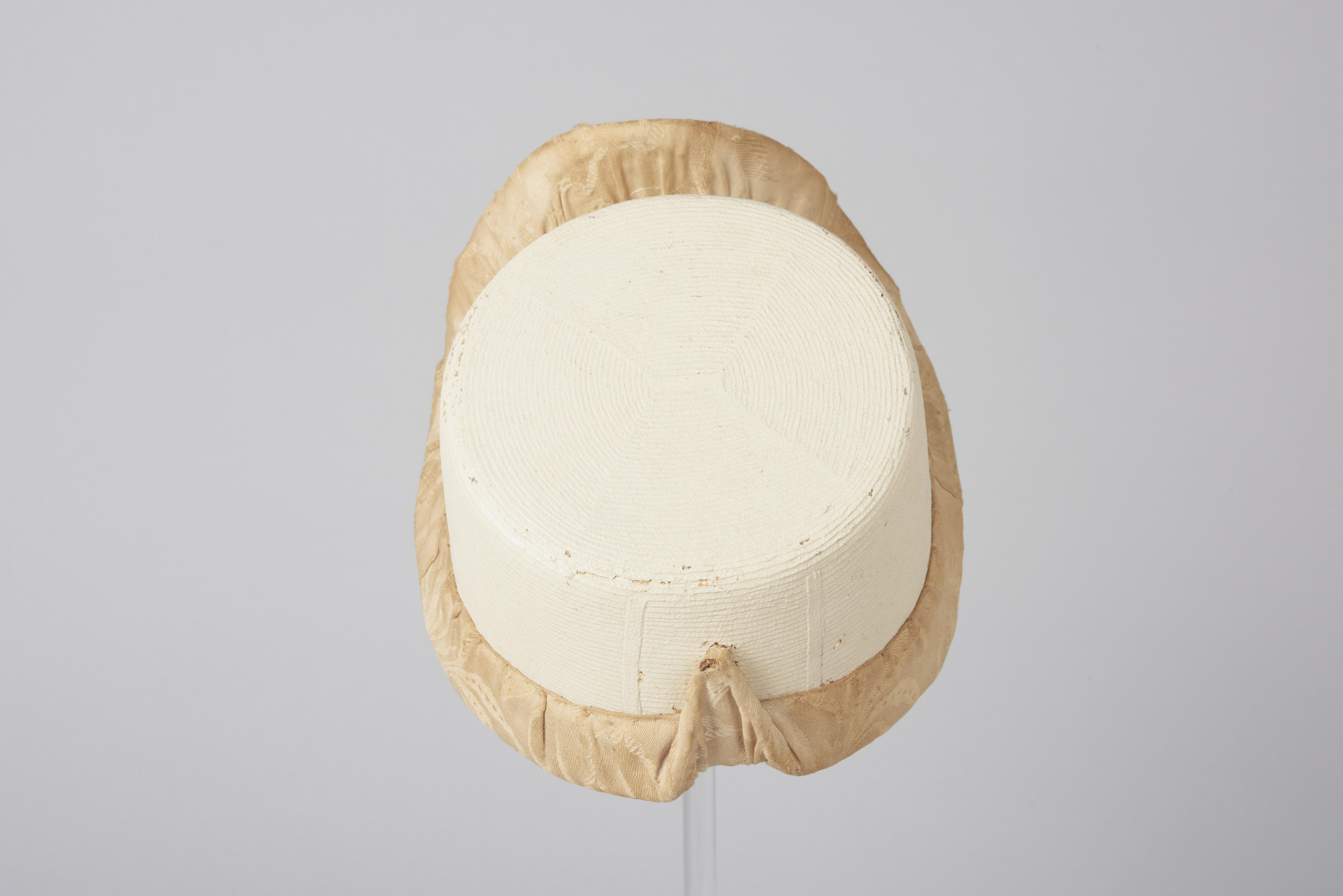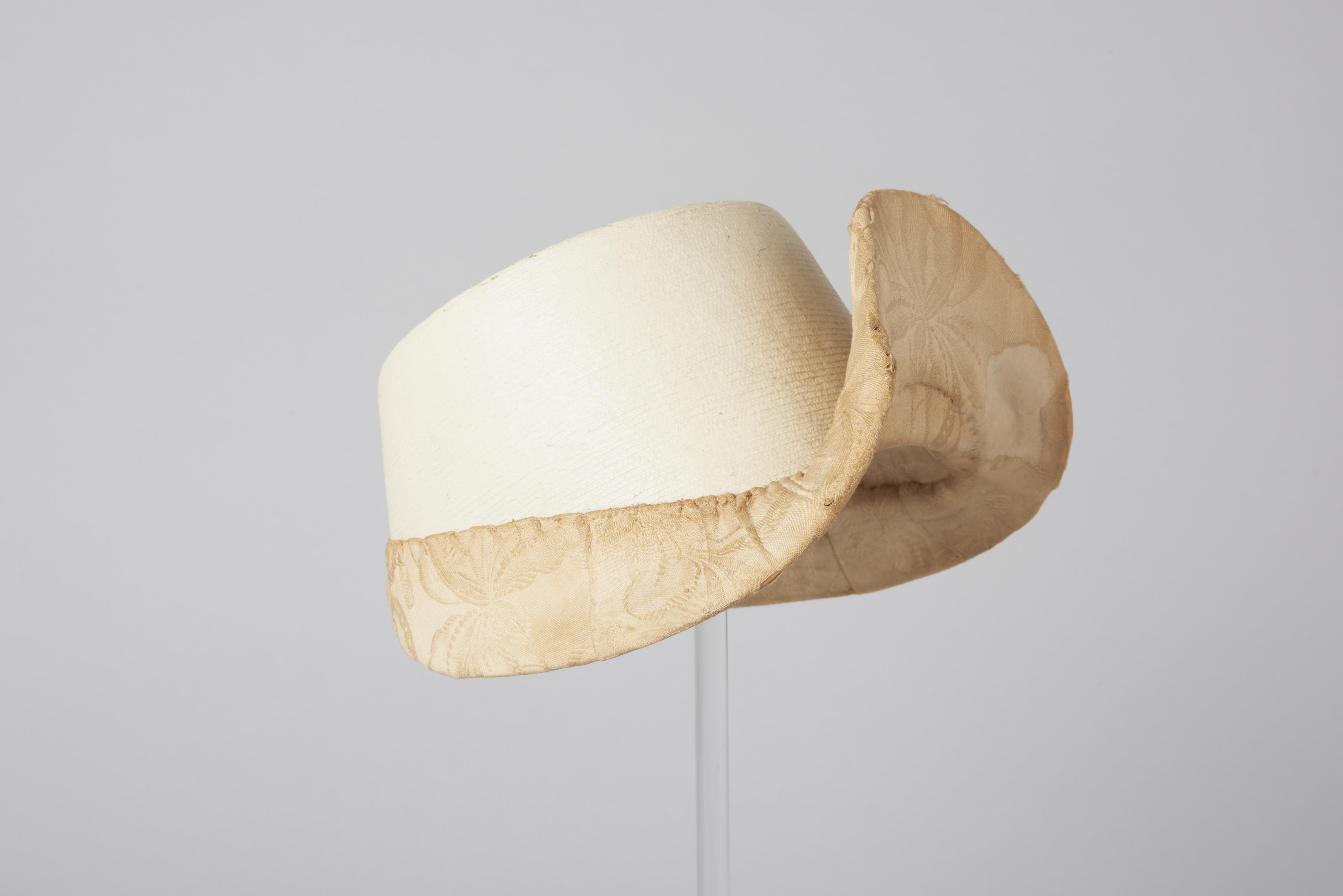 Hullehoed van gewit, gevlochten stro, gevoerd met een crèmekleurige stof met ingeweven motieven. De hoed is afkomstig uit Noord-Holland.