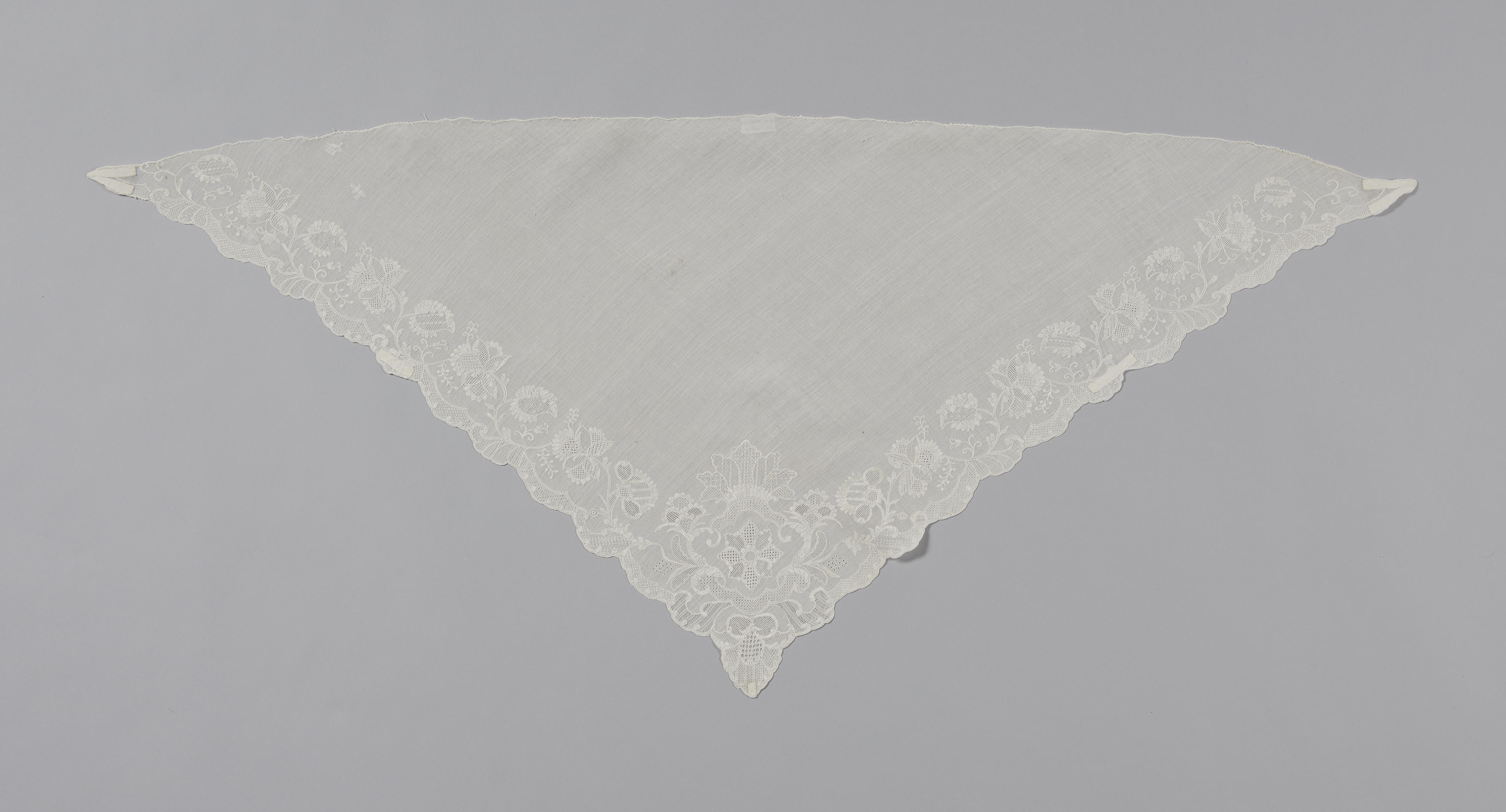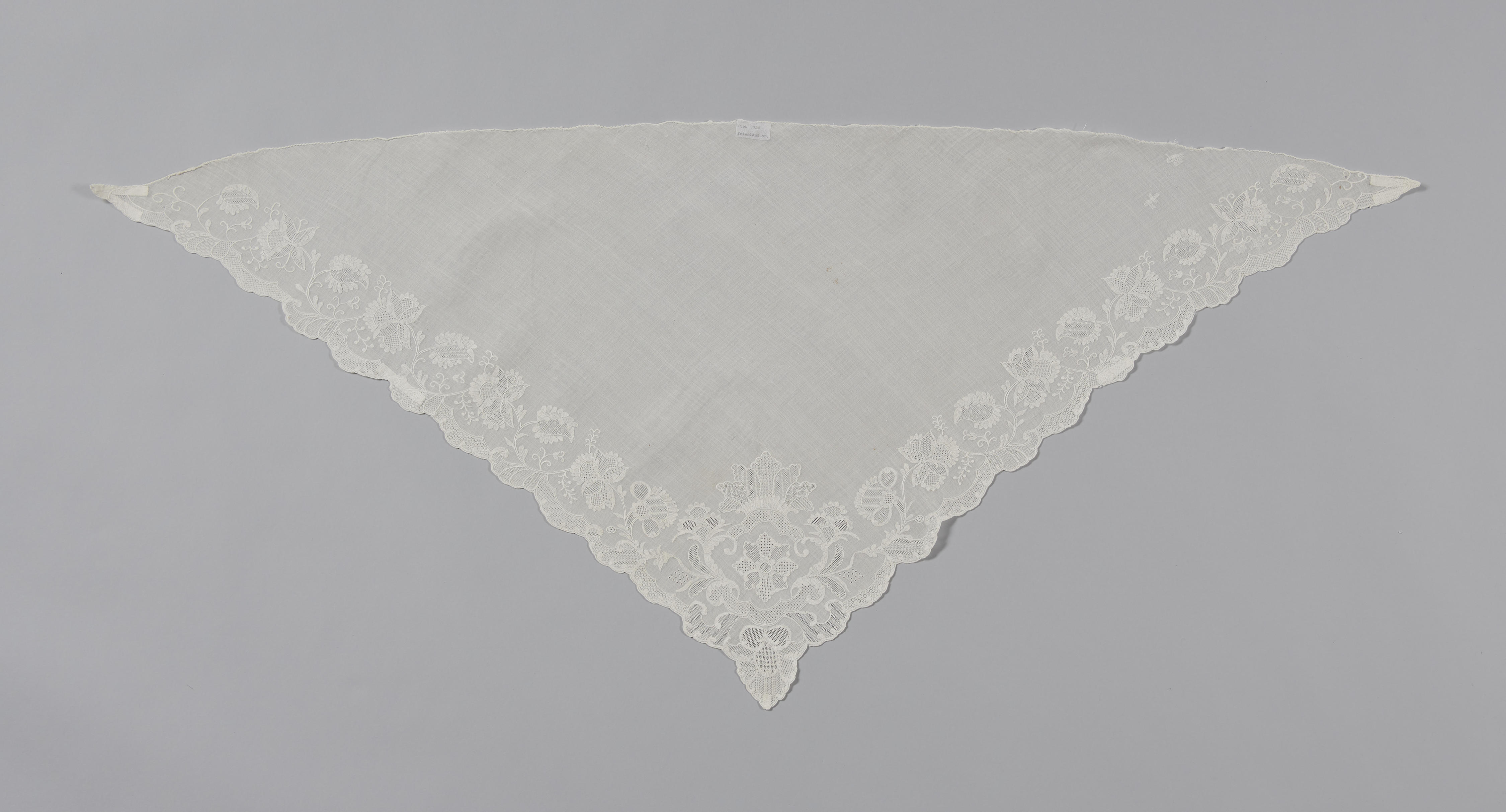 Driehoekige fichu van fijne, witte batist, waarvan de korte, geschulpte zijden geborduurd zijn met bloem-, blad- en rankmotieven in schaduwwerk. De hoek is versierd met een palmetmotief.
