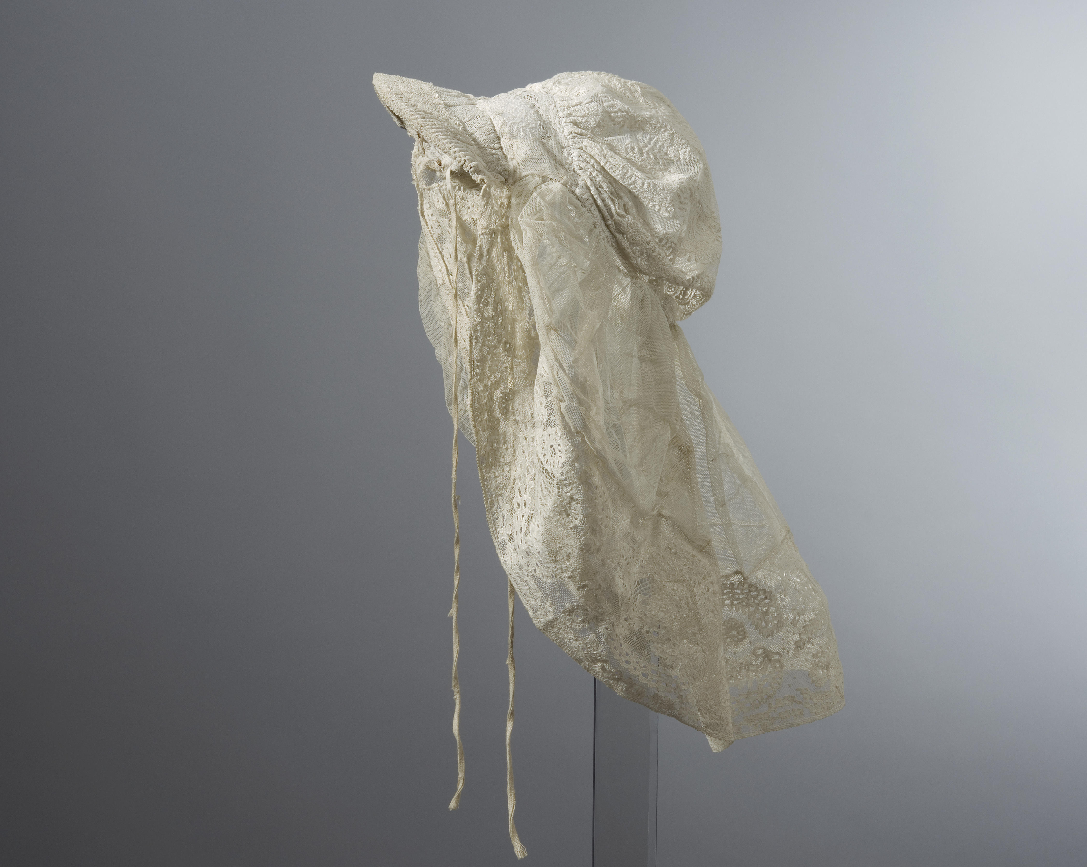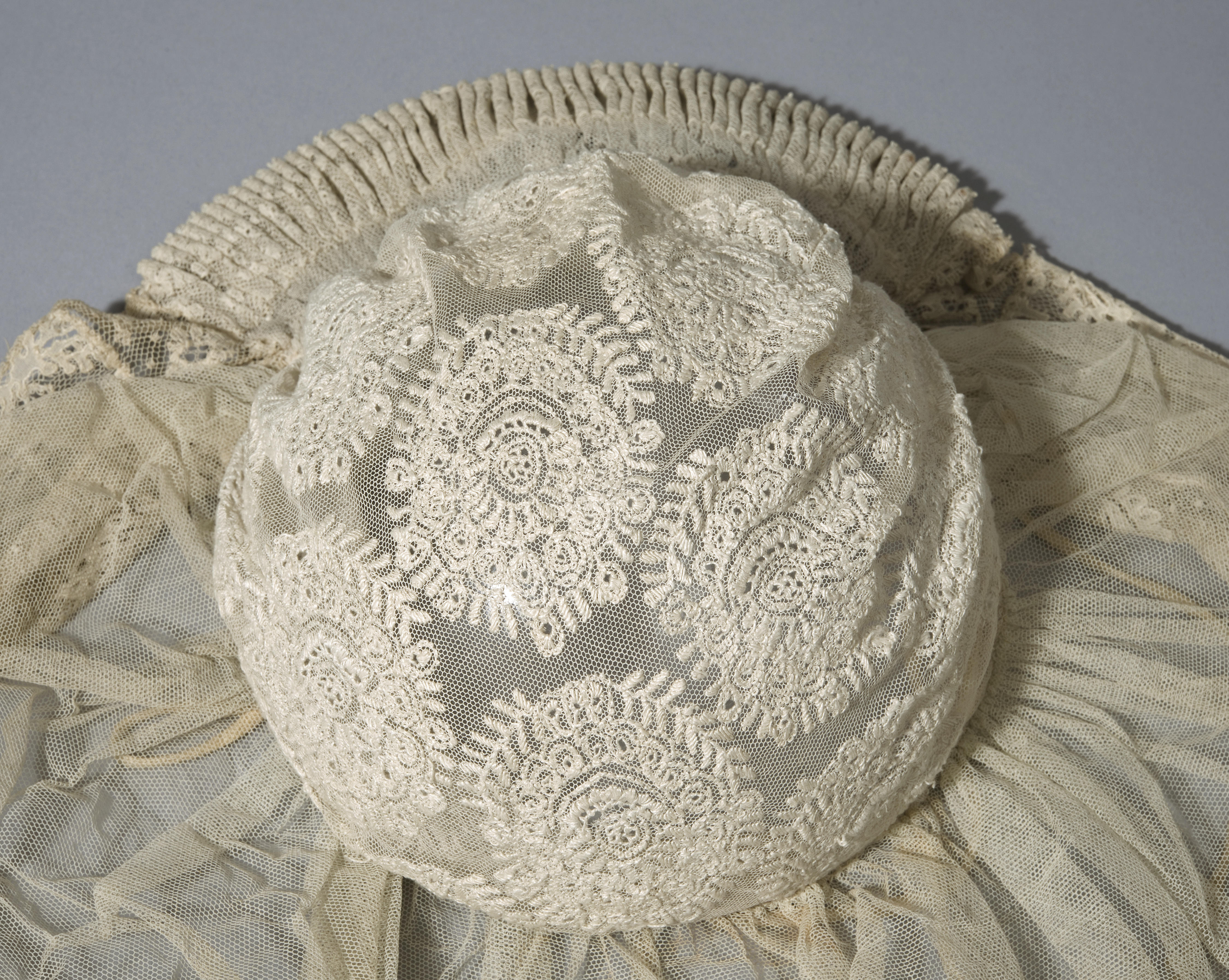 Zondagse muts met een bol van geborduurde tule en een strook met machinale kant. De muts werd gedragen met een poffer en is afkomstig uit Horssen.