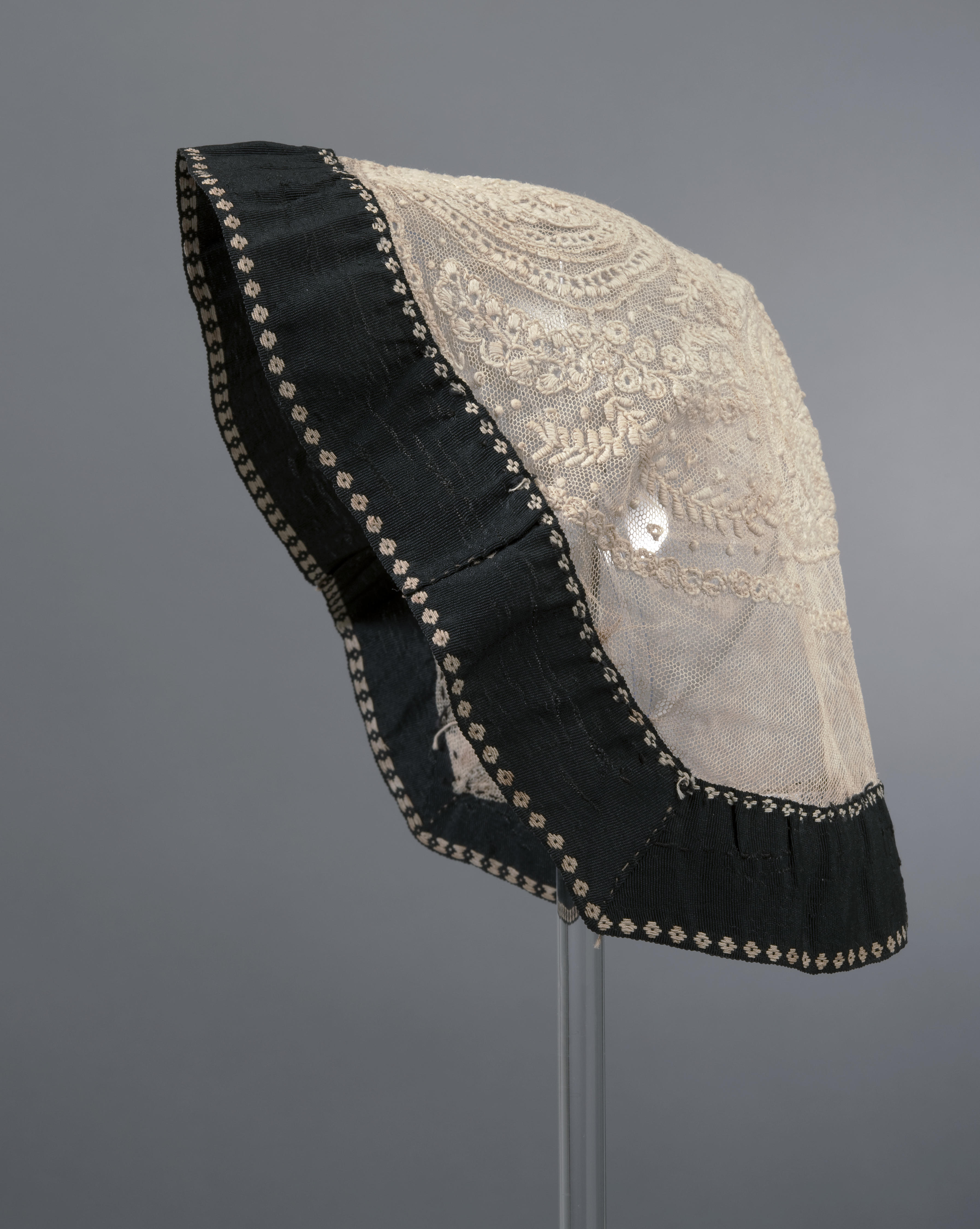 Tussenmuts van geborduurde tule, afkomstig uit West-Friesland. De muts is afgezet met een 3 centimeter breed lint van zwarte ripszijde met wit 'spiegeltje', ingeweven witte motieven langs de kanten.