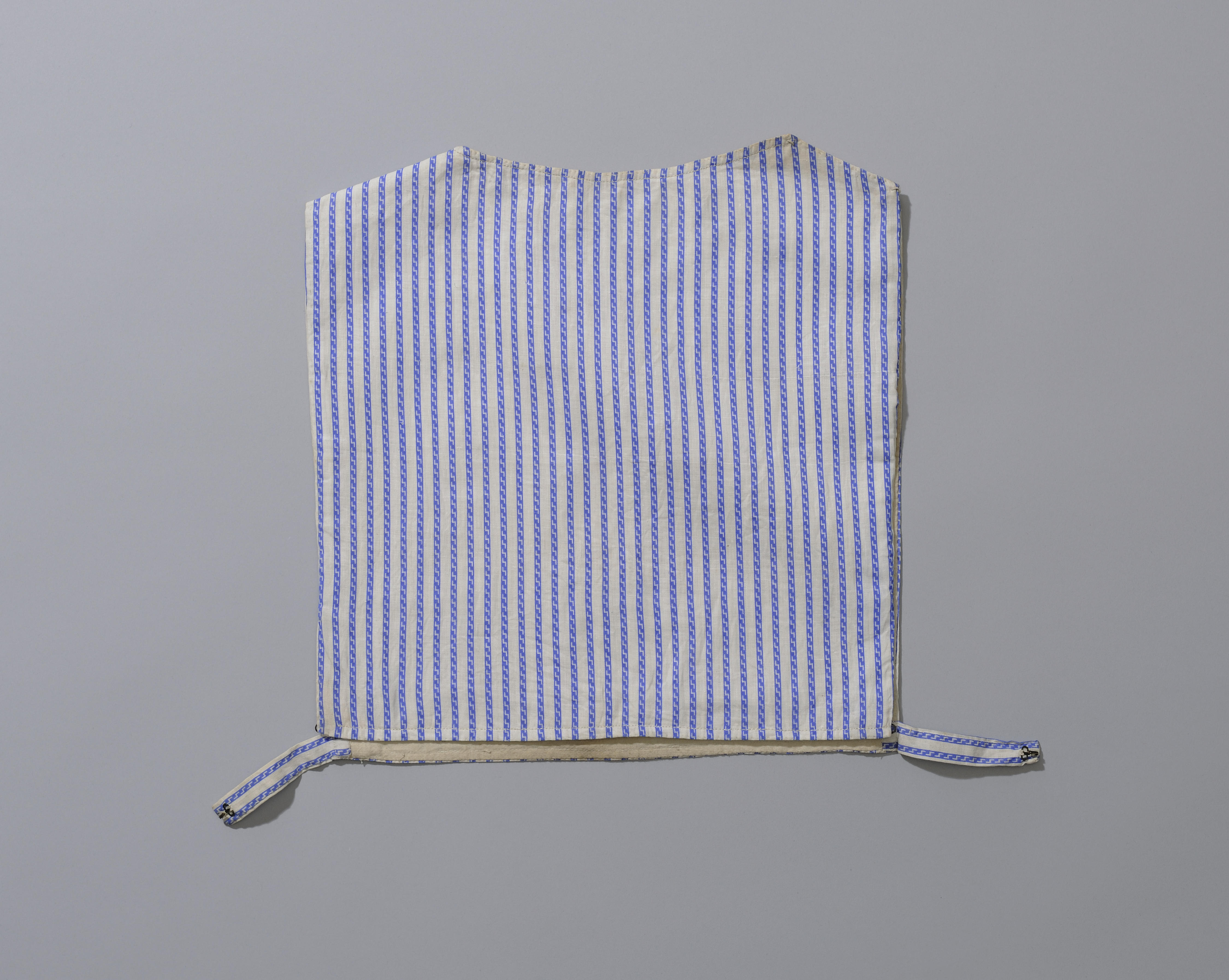 Gestreepte katoenen kroplap met een voering van ongebleekte katoen, afkomstig uit Noord-Holland. De kroplap heeft een ongebruikelijke sluiting onder de armen.