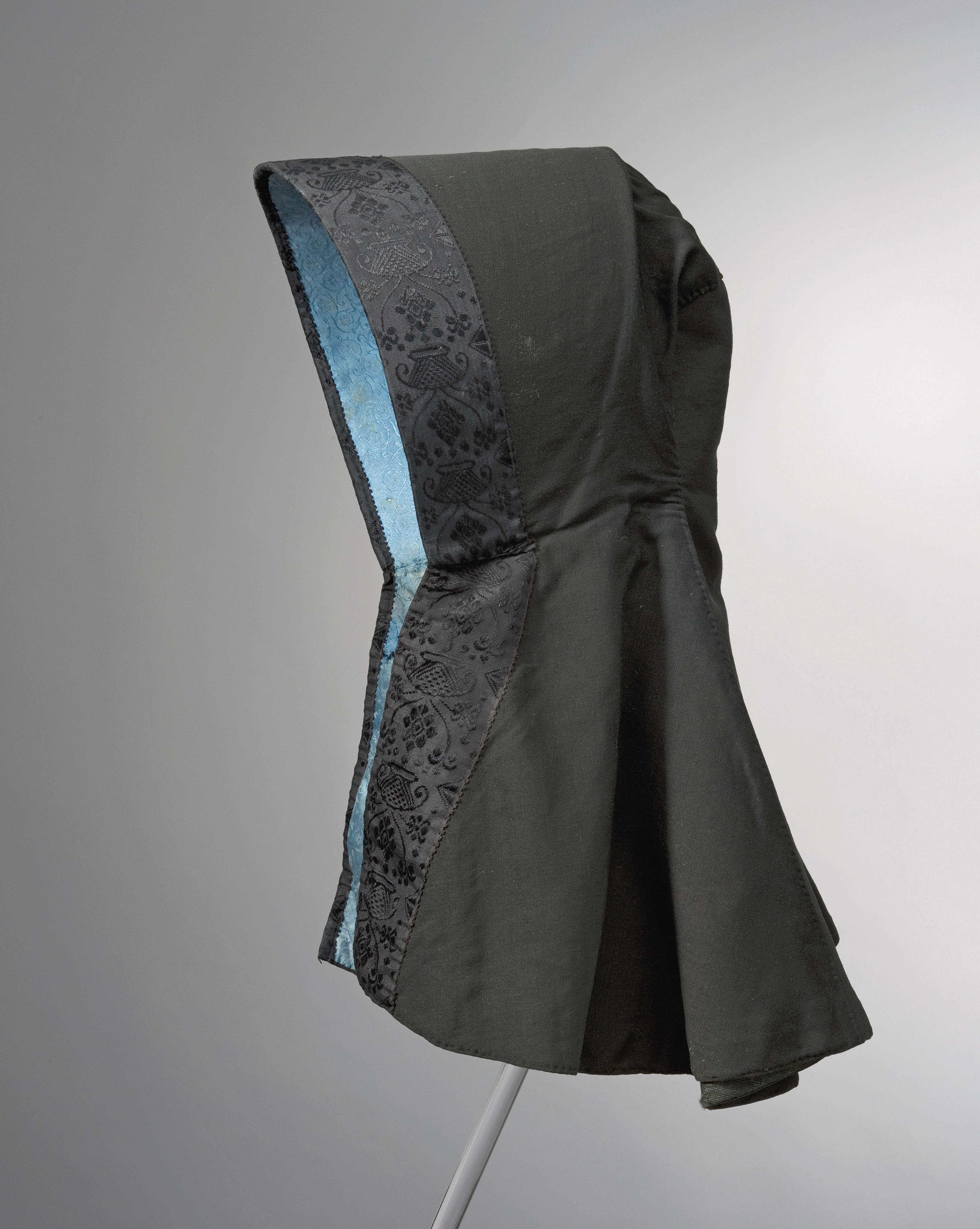 Kaper van zwarte tibet, afgezet met gefigureerd ripszijden lint langs de rand van de kap. De kaper is deels gevoerd met lichtblauwe, gefigureerde zijde. Tussen de binnen- en buitenkant houdt een kartonnen vorm de kaper in model.