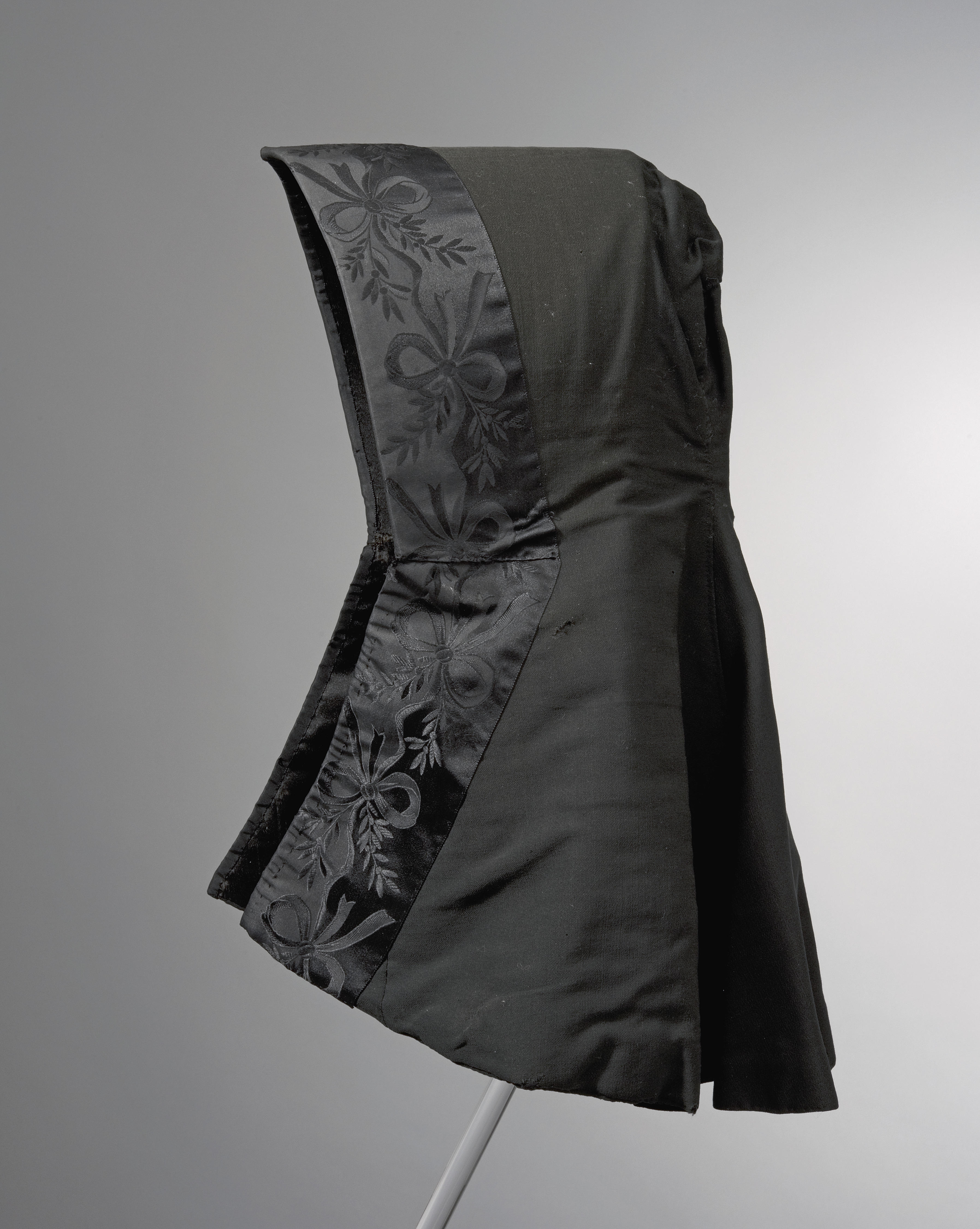 Kaper van zwarte tibet over een kartonnen vorm, afgezet met zijden lint met ingeweven motieven en gevoerd met glimmende zwarte zijde. De kaper is afkomstig uit Hippolytushoef.