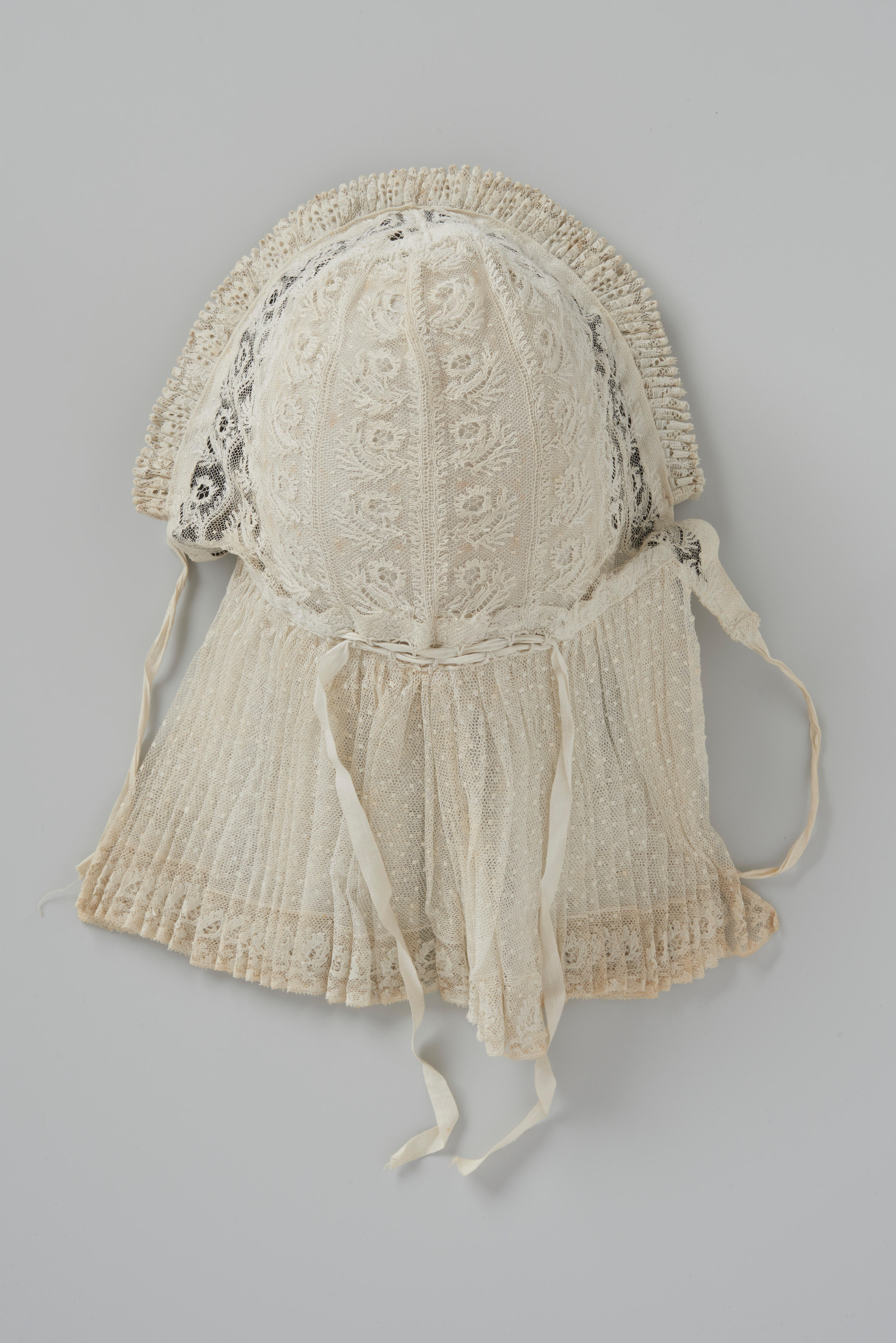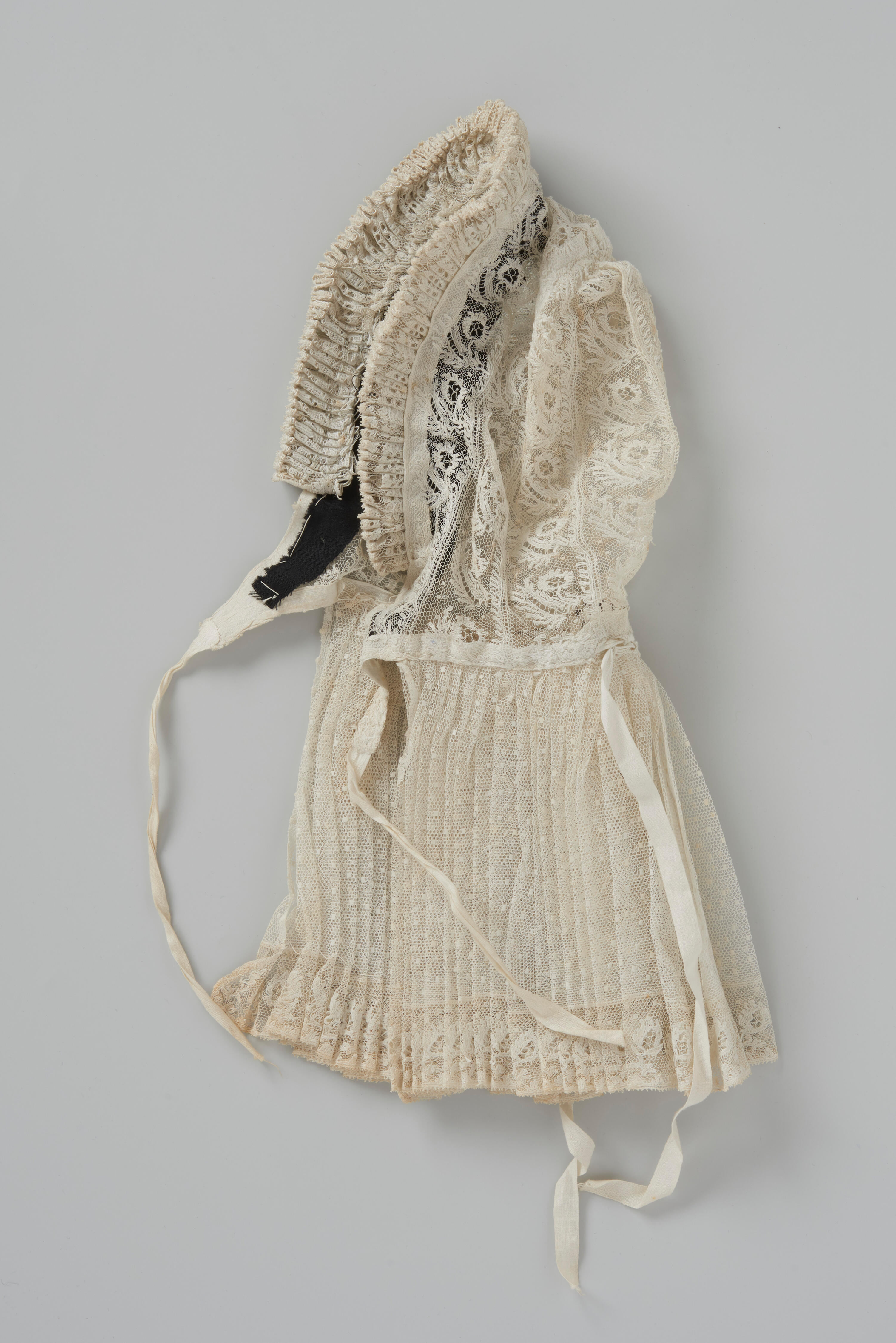 Knipmuts met een bol van stroken Rijselse kloskant, een voorstrook van machinale kant en een staart van gemoeste tule met een 3 centimeter brede strook Rijselse kloskant en een picotrandje.