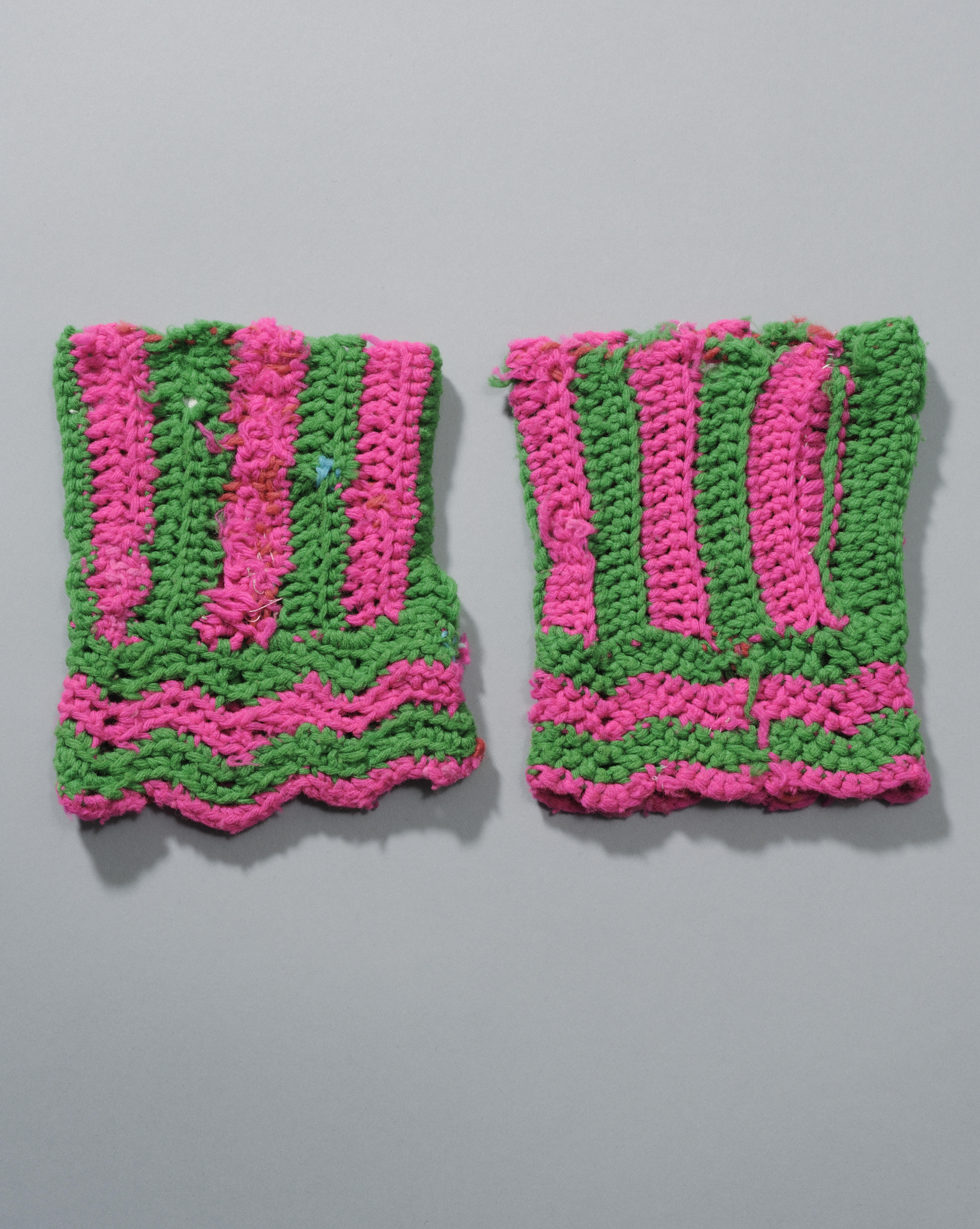 Gehaakte polsmofjes met verticale en horizontale strepen in fel groen en fel roze, afkomstig uit Limburg.