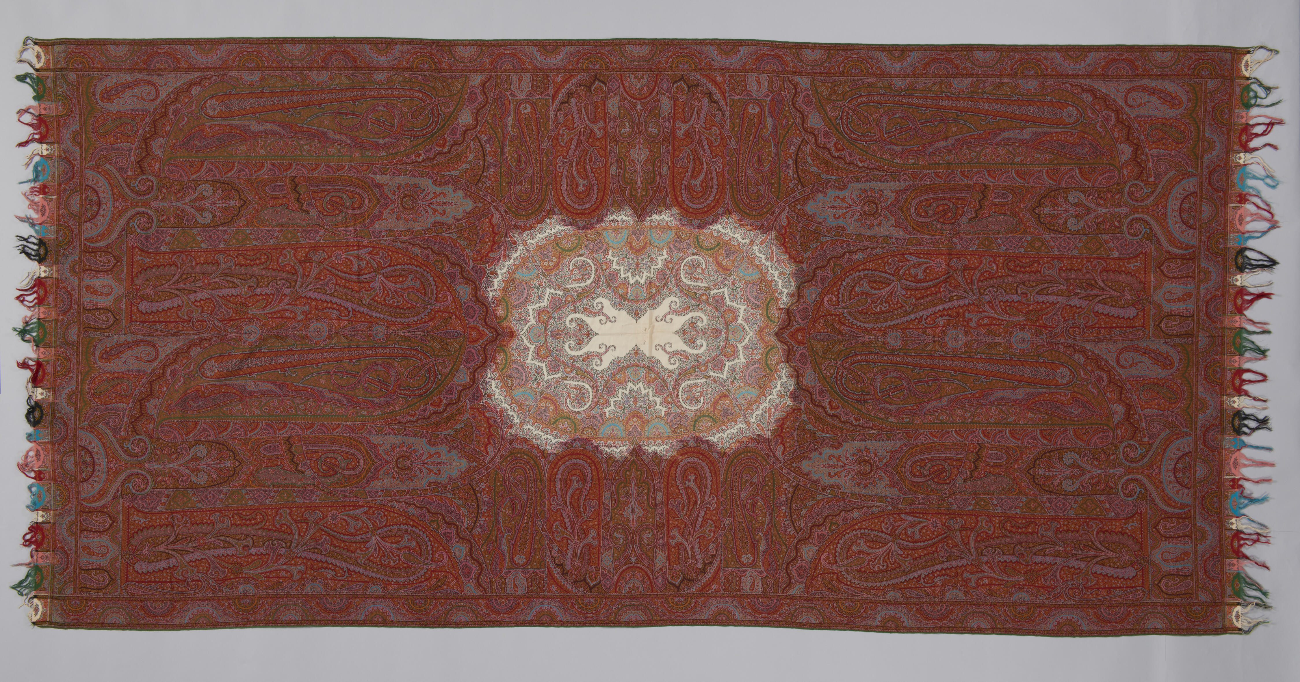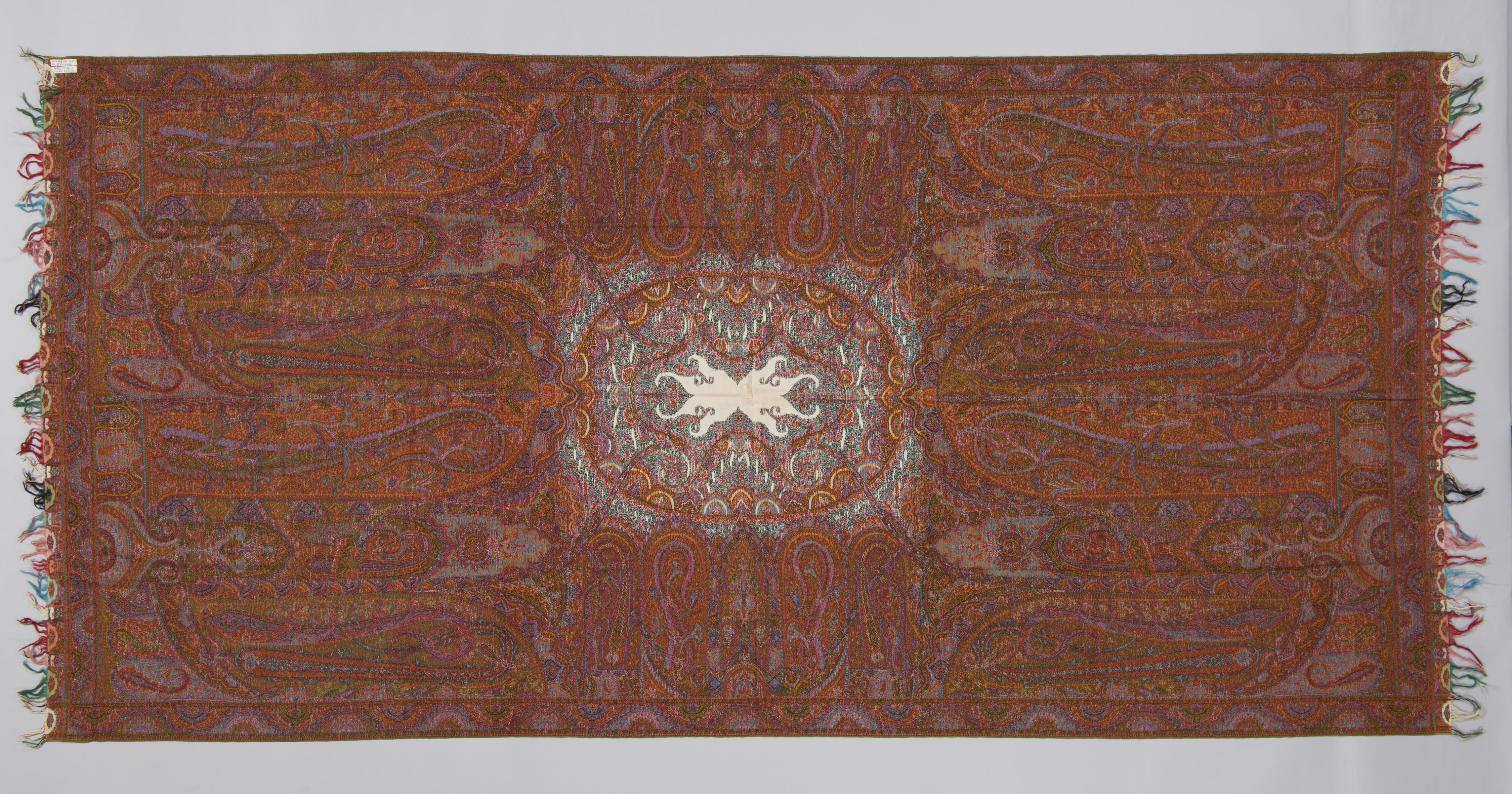 Langwerpige kasjmier sjaal in overwegend bruin-rode tinten, met een kleine lichte spiegel. De sjaal komt uit een erfenis van of via notaris Leuken in Weert.