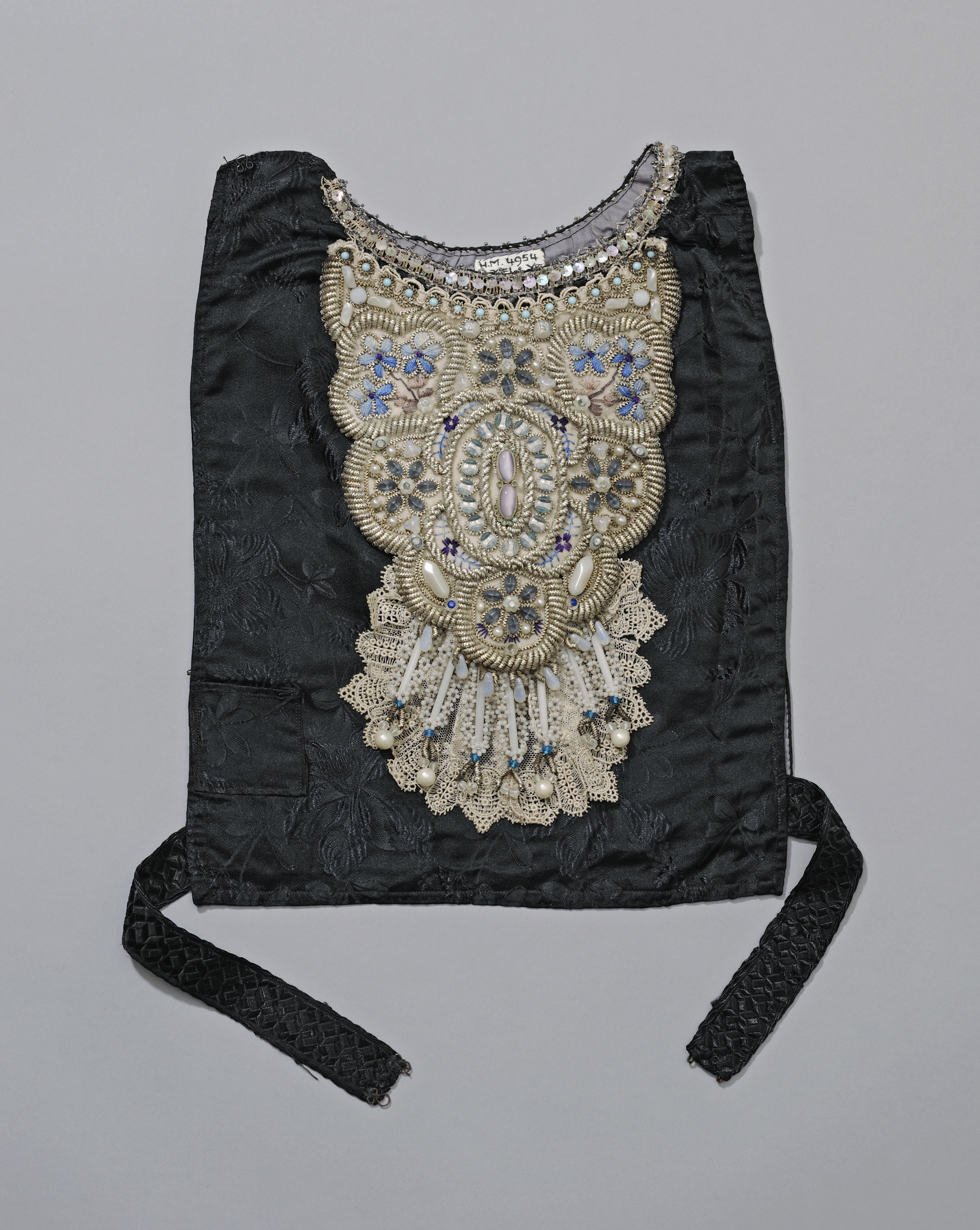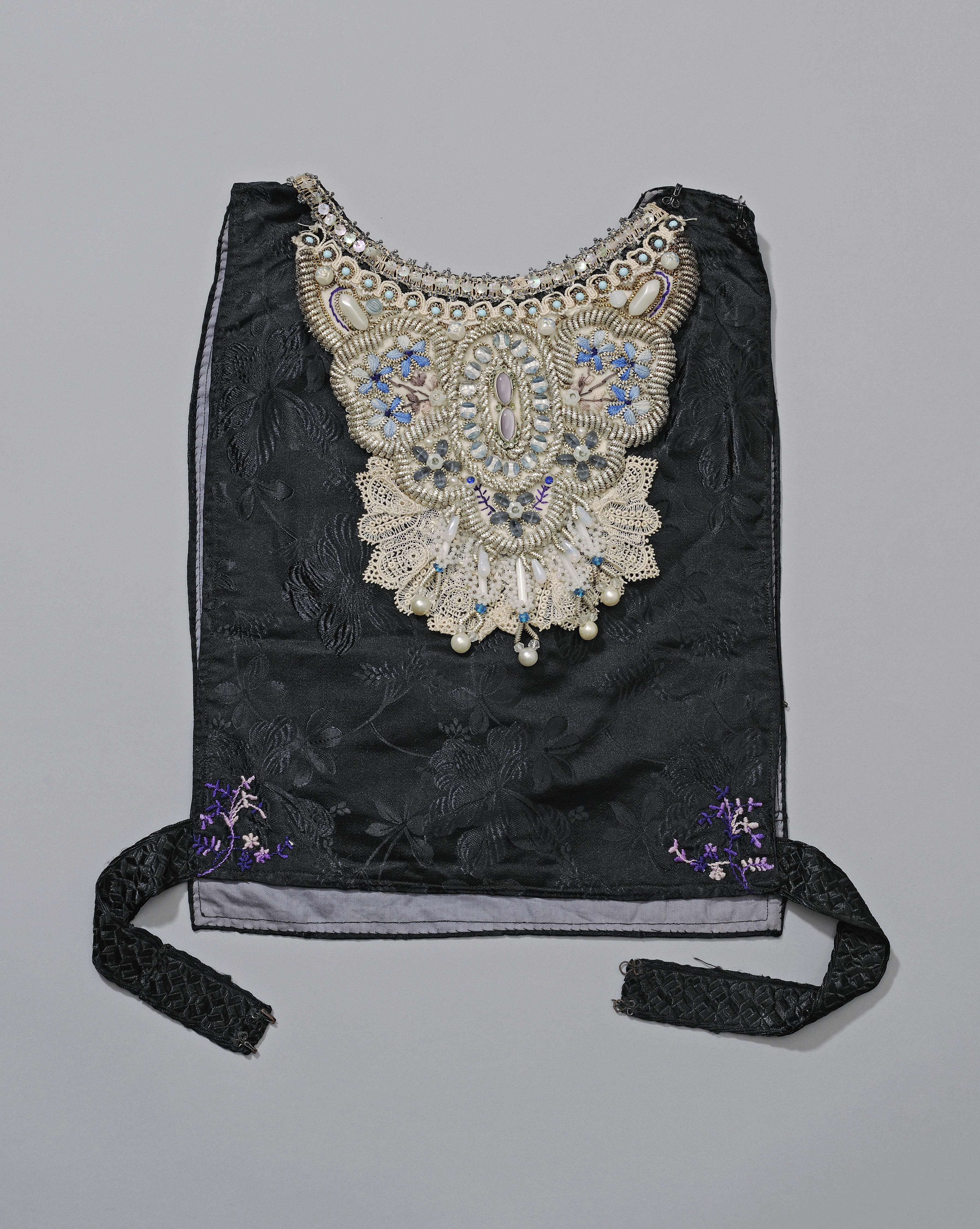 Zondagse beuk met kraalstukken voor de lichte rouw. De beuk heeft een horlogezakje op het voorpand. Dit horloge werd aan een ketting om de hals gedragen en in het zakje opgeborgen. De beuk is afkomstig uit Axel.