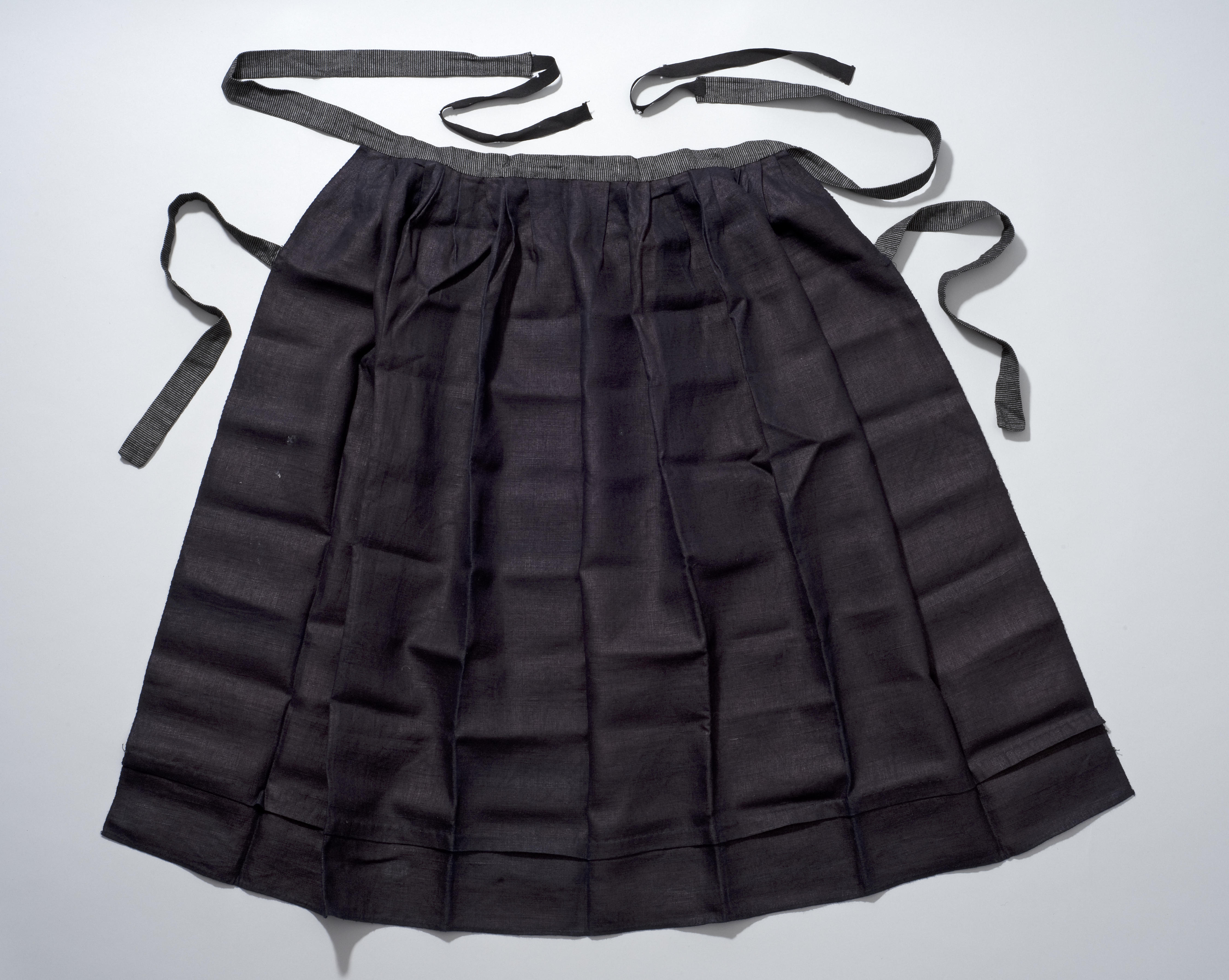 Werkschort van eigengereide, donkerblauw-paarse stof. De taille- en gatbanden zijn van zwart-wit gestreept linnen. Het schort is afkomstig uit Rijssen.