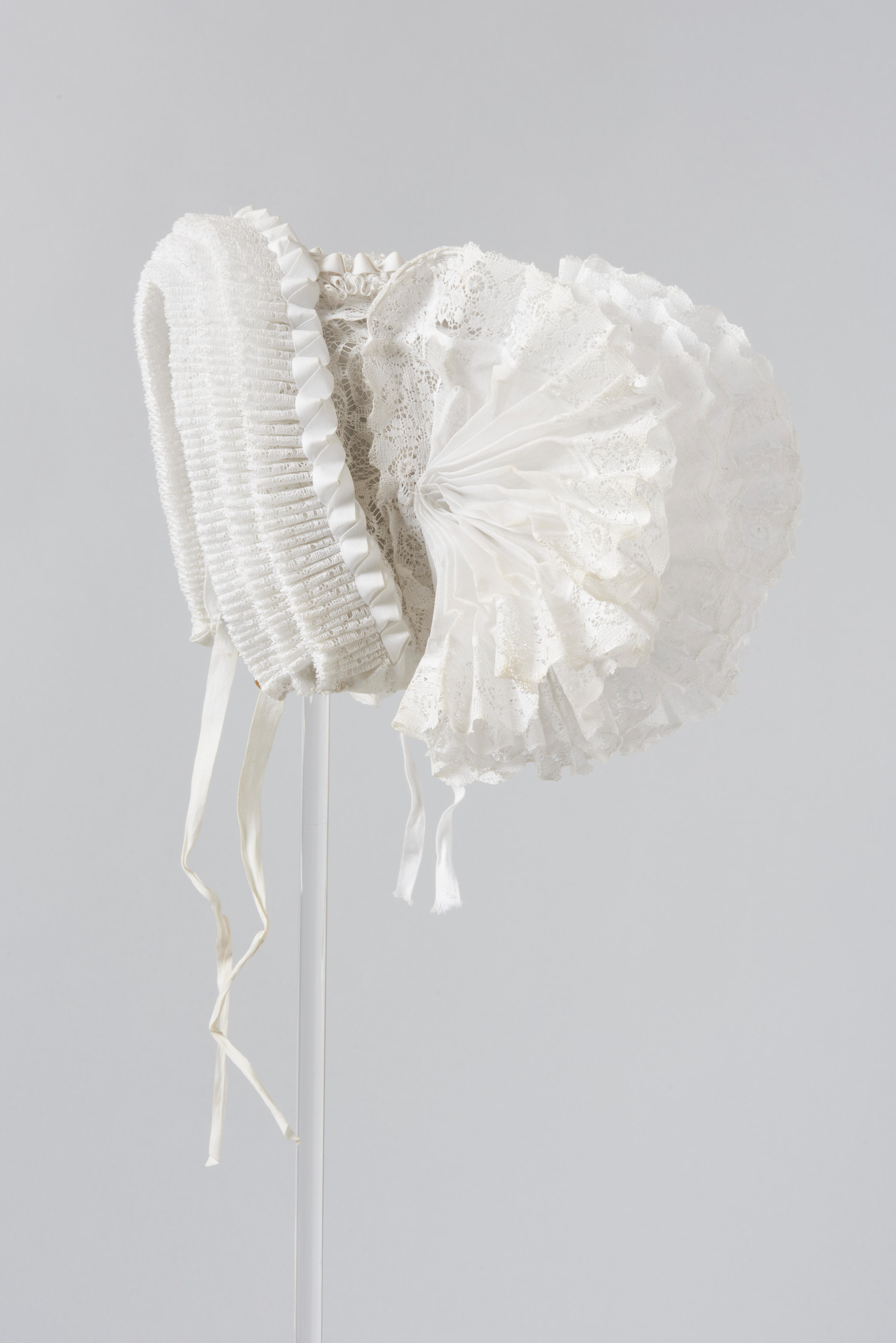 Daagse opknapmuts of zogenaamde driestrookjesmuts met een bol van broderie anglaise, doorgestopte tule en kant. De muts is opgemaakt met gepijpte kanten voorstroken, met daarachter een garnering van tot 'slakkedopjes' gevouwen band en een waaiervormig gevouwen strook op het achterhoofd van witte katoen, afgezet met kant. De muts heeft koperen oogjes waarin een losse sierstrik ...