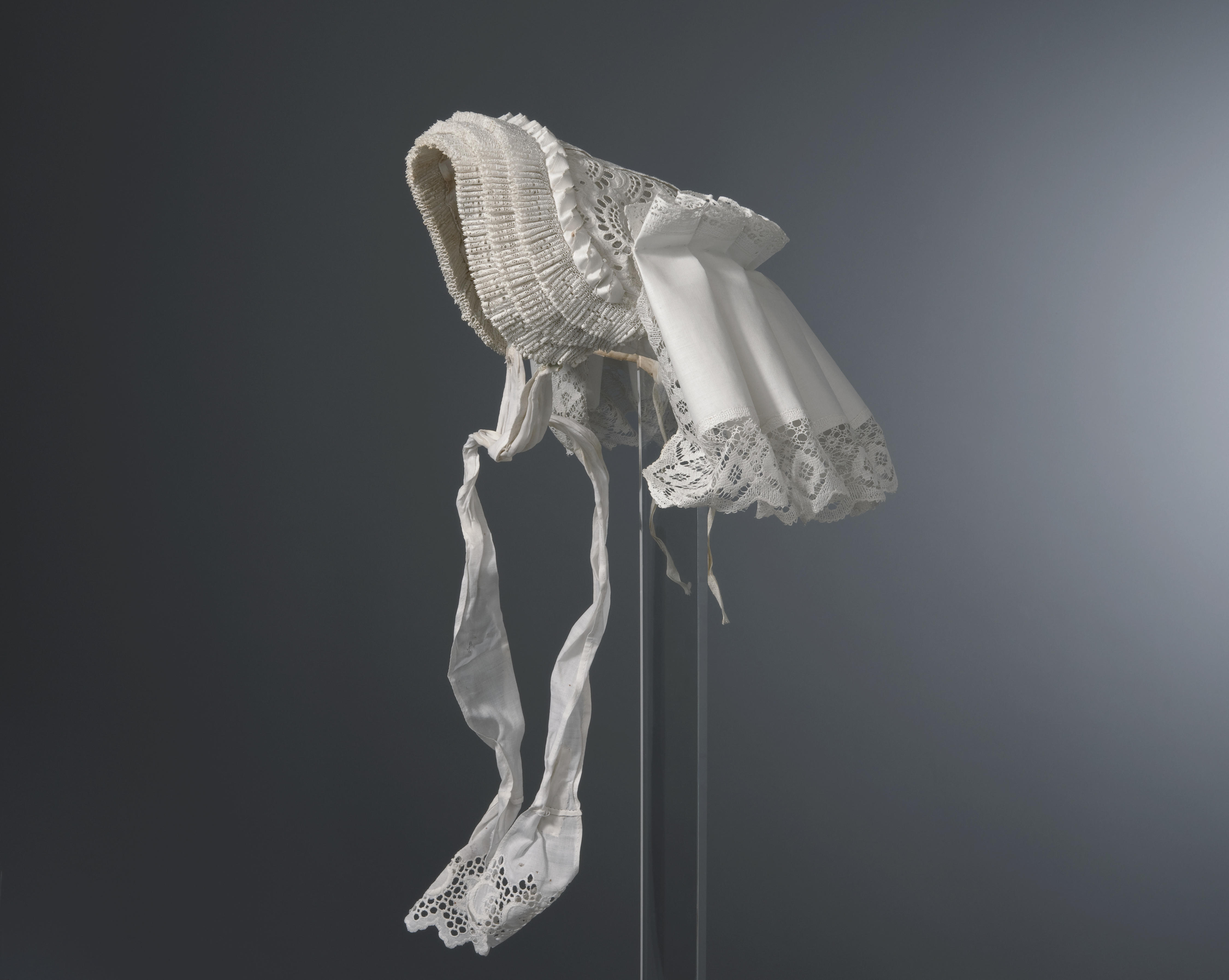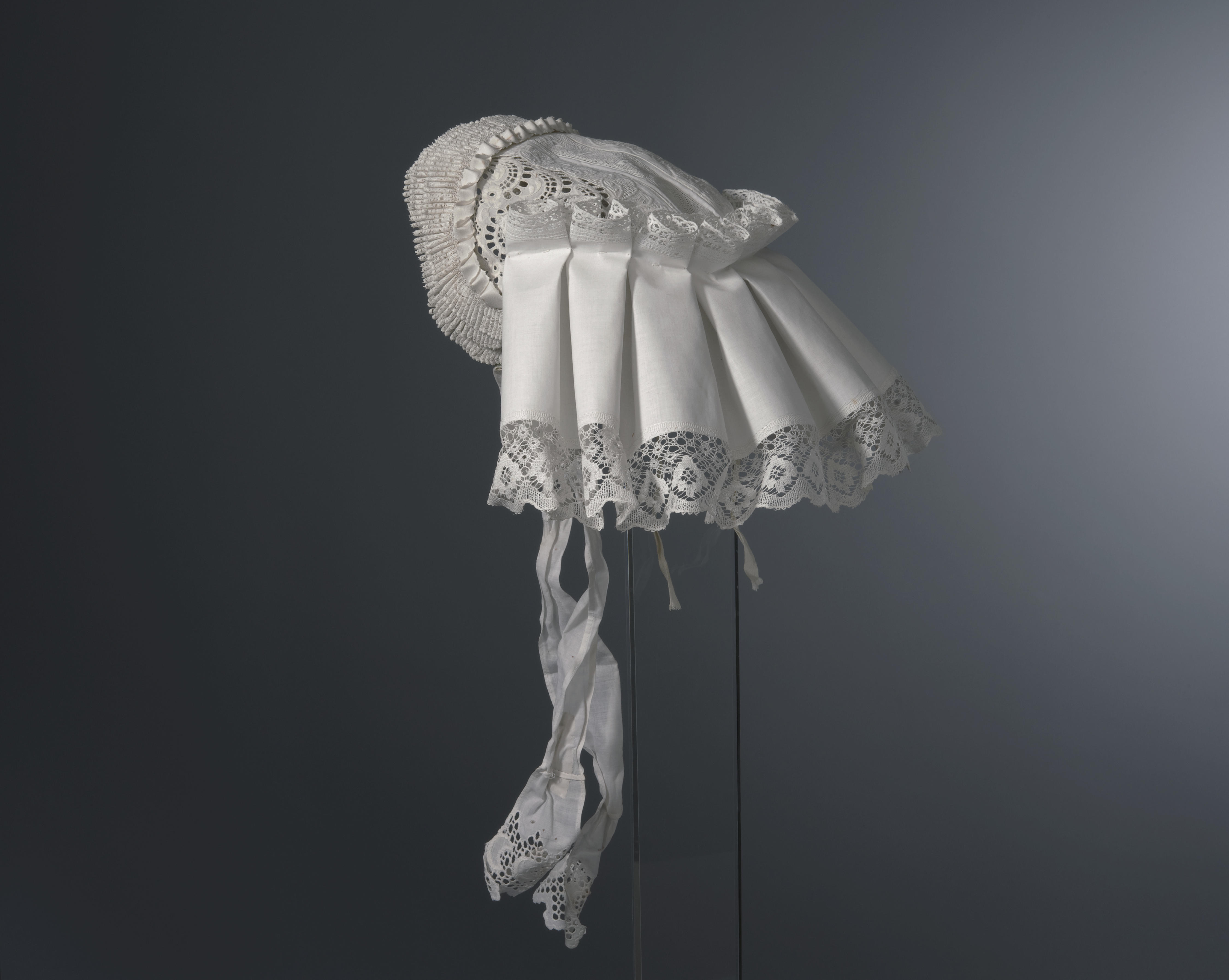 Opknapmuts van katoen met broderie anglaise en kant, met bijbehorende linten. De muts is afkomstig uit Elspeet.