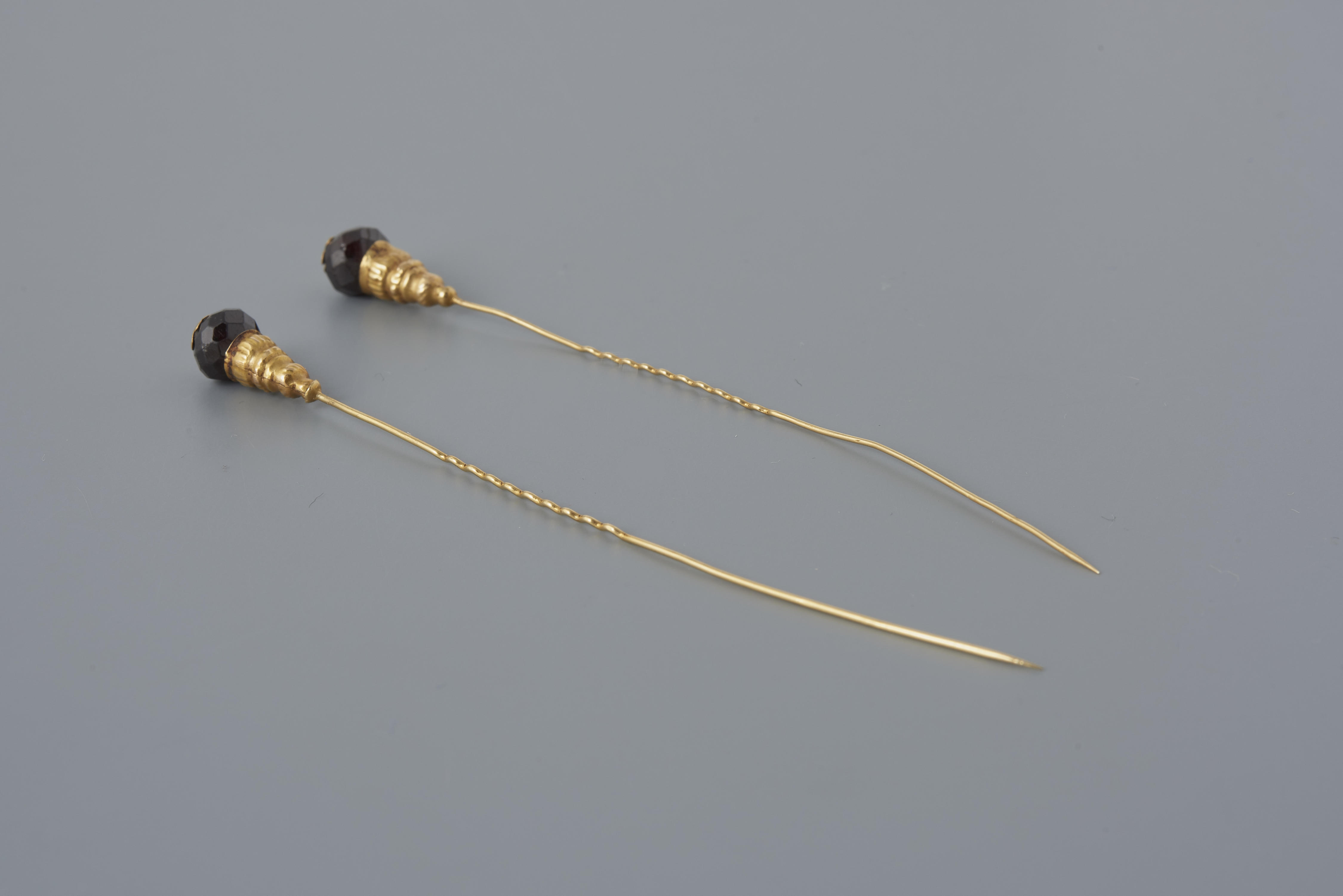 Paar mutsspelden uit omstreeks 1850, gedragen in de provincie Groningen. Deze spelden werden in de muts gestoken, achter de uiteinden van het oorijzer. De vervaardiger is onbekend.