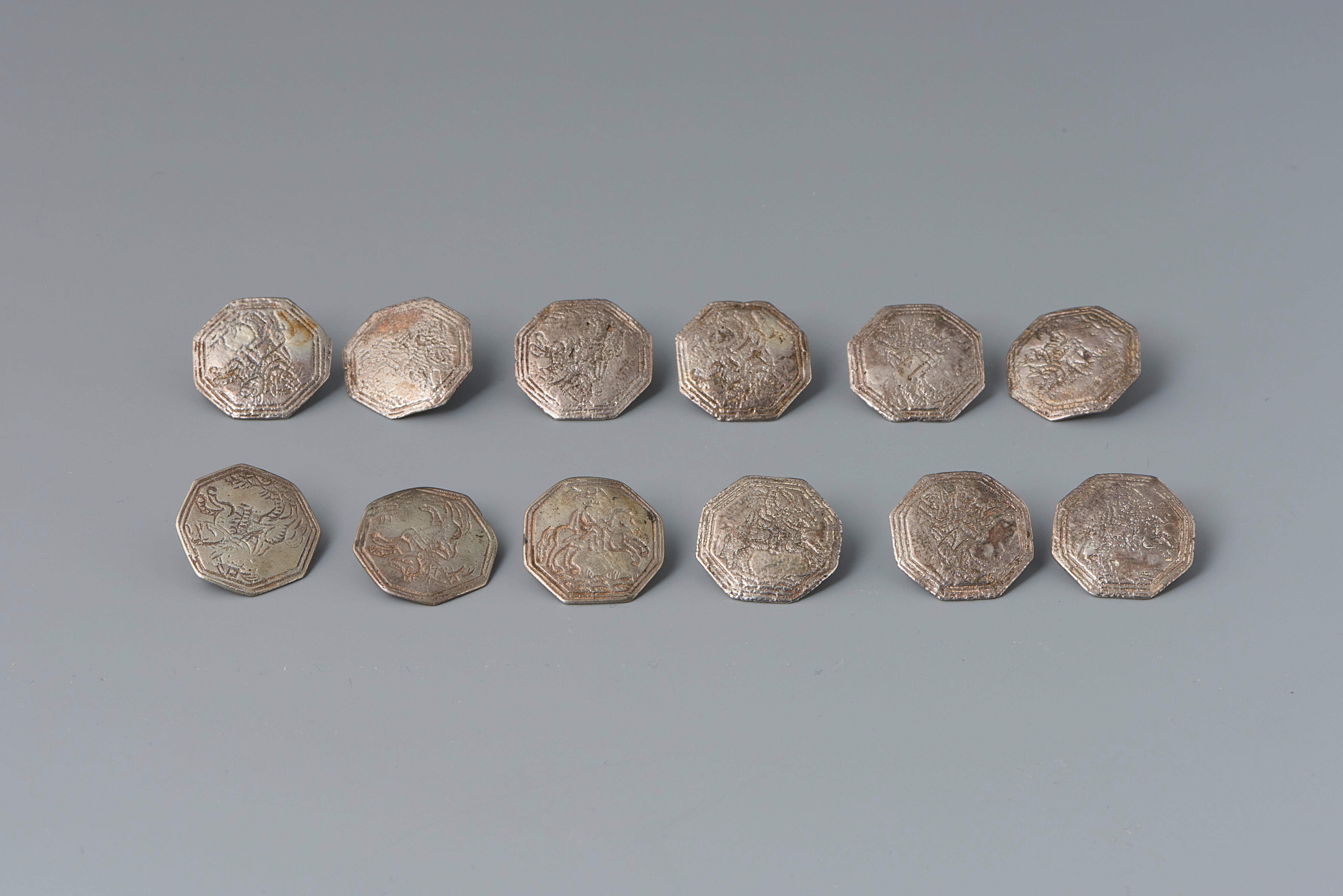 Een samengestelde set van twaalf achthoekige zilveren knopen. Op de voorzijde van de gegoten knopen staat de voorstelling van een ruiter. Op drie van de twaalf knopen staat het meesterteken van Jan Jonker, werkzaam in Meppel tussen 1890 en 1893. Op negen van de twaalf knopen staat het meesterteken van H. van Rijnbach, werkzaam in ...