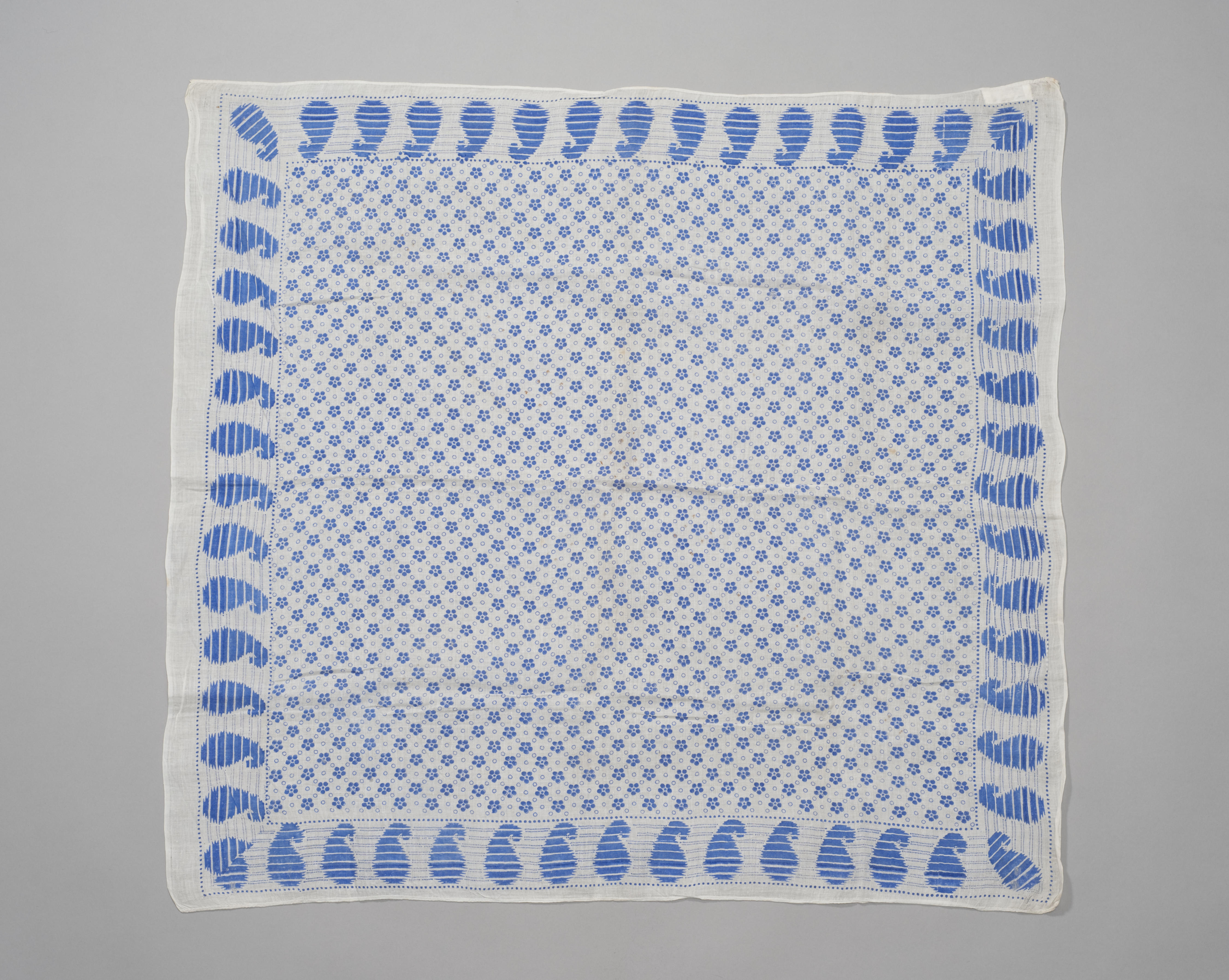 Vierkante fichu van witte katoenen batist, bedrukt met een strooimotief van blauwe bloemen en aan vier zijden een brede rand met paisley- of druppelmotief in blauw.