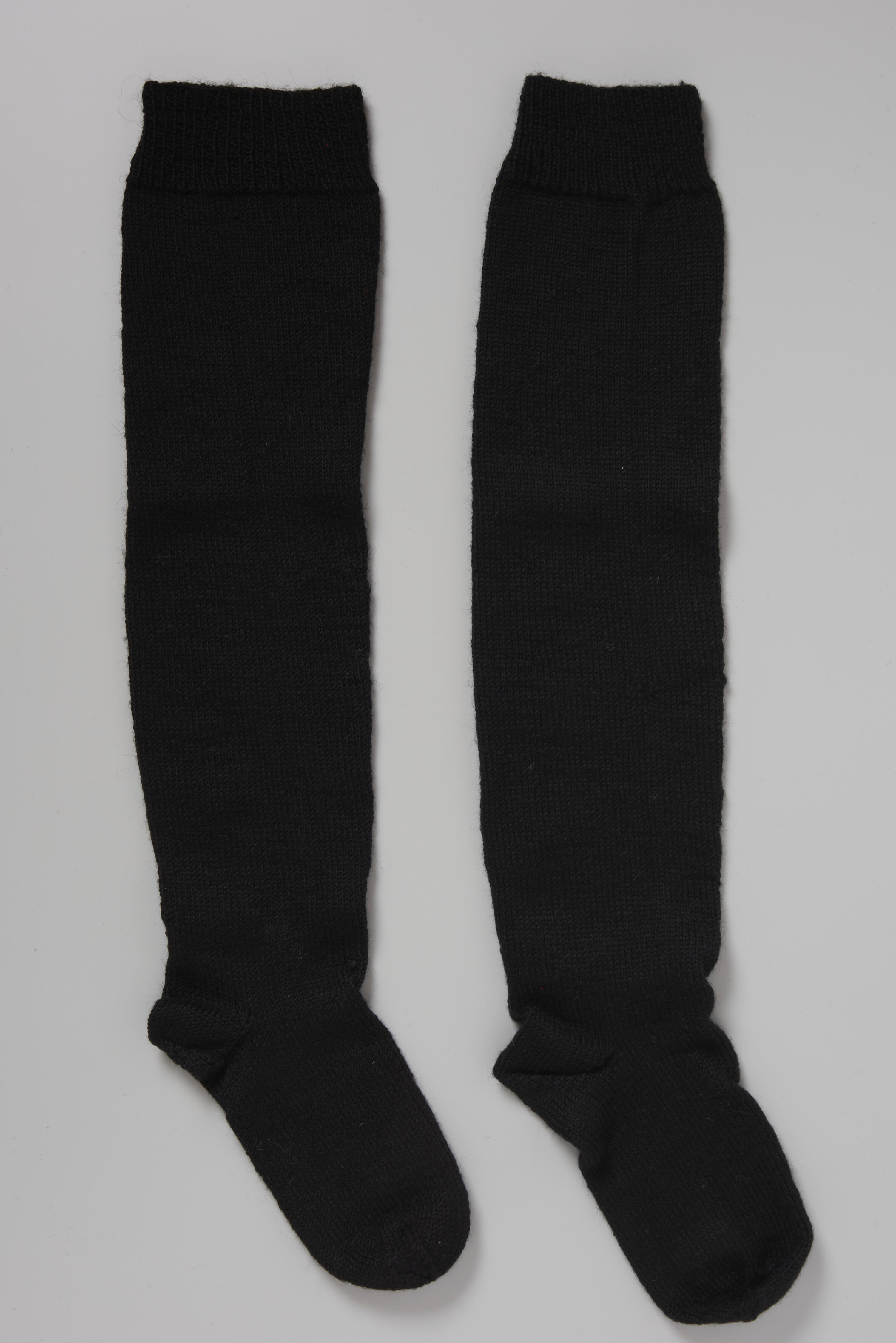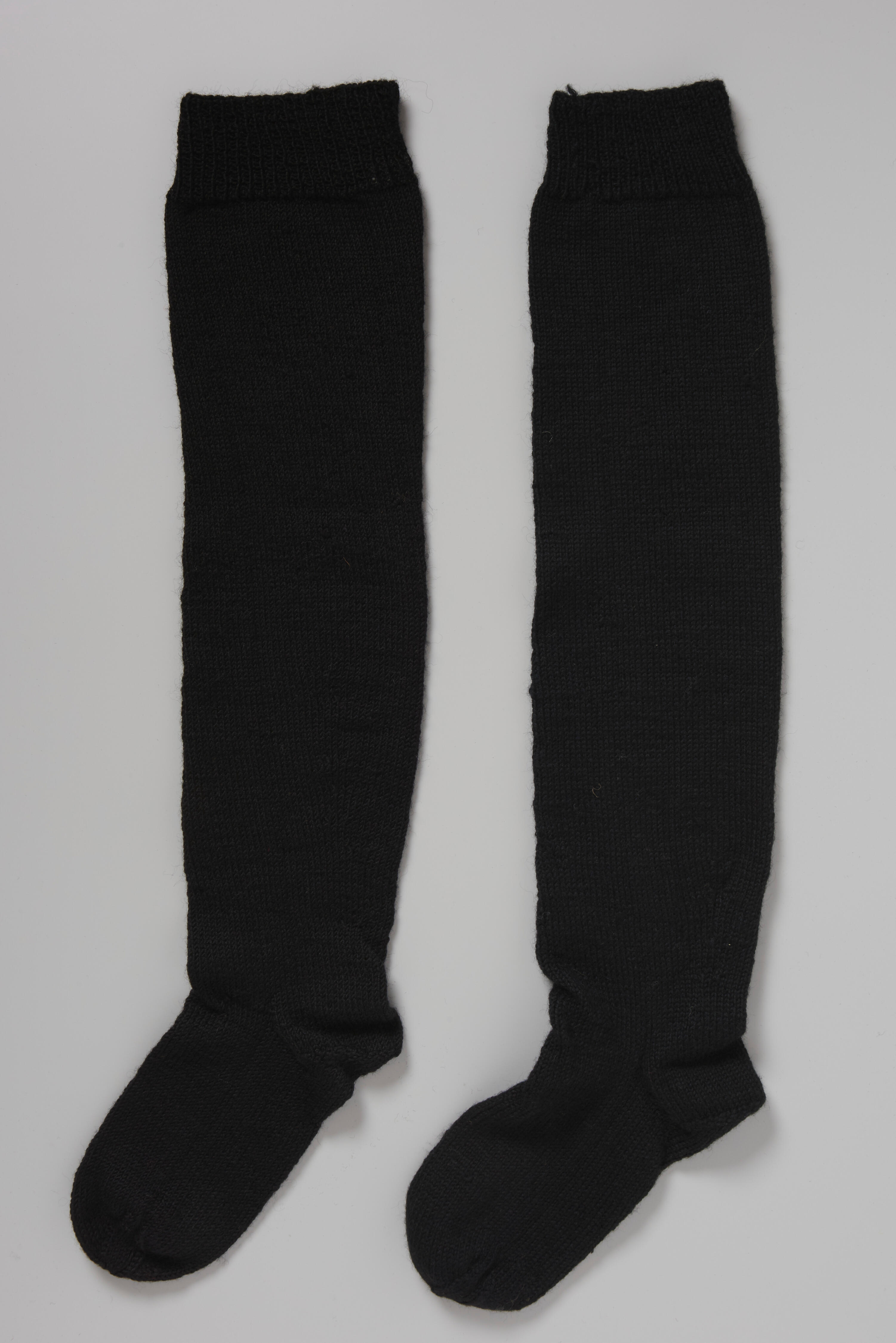 Een paar handgebreide zwarte wollen kousen, gedragen door een vrouw in streekdracht uit Bunschoten. De kousen zijn rondgebreid in rechte steken. Aan de bovenzijde hebben ze een boord, gebreid in één recht/één averecht. De kousen hebben een lengte van circa 75 centimeter.