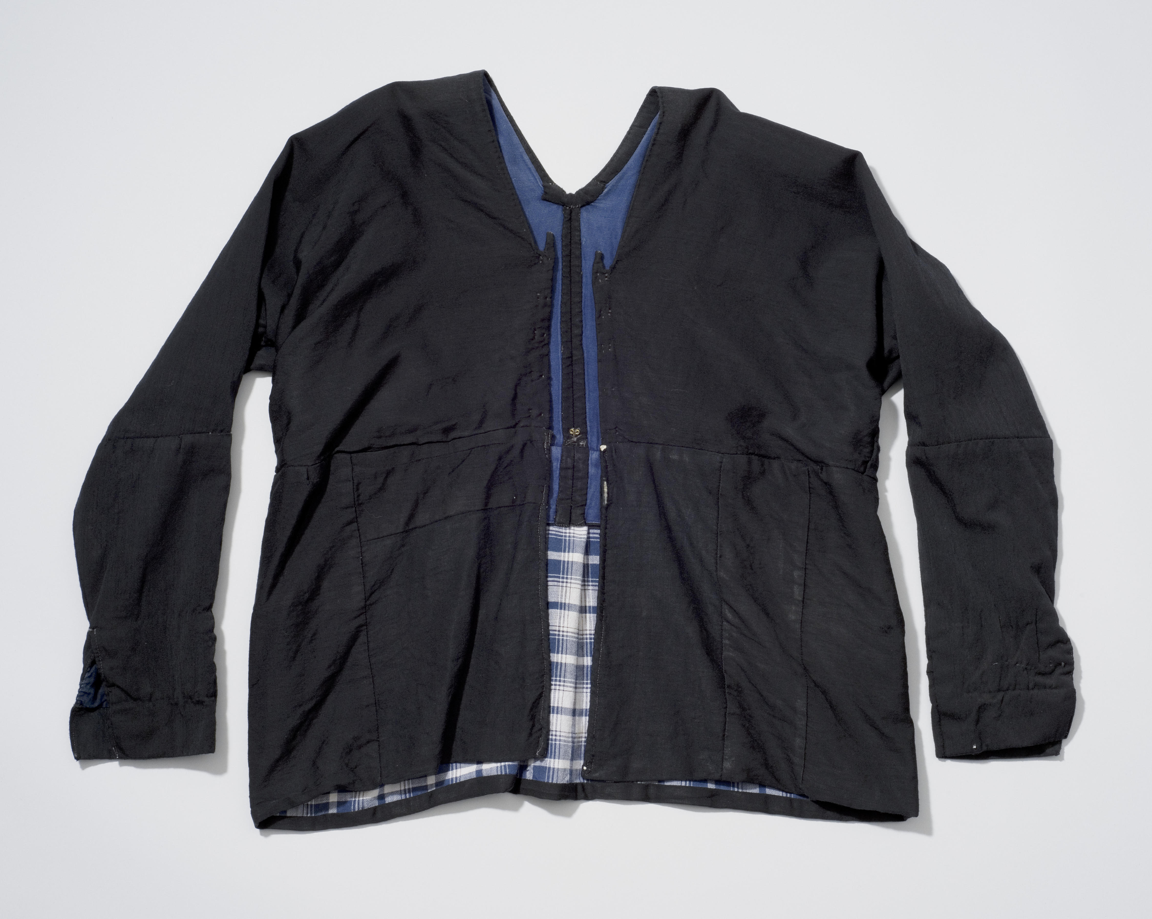 Schootjak van zwarte wollen stof, zogenaamde 'saai'. Het jak heeft lange mouwen en is gevoerd met effen blauwe katoen en geruit 'vries'. Het is afkomstig uit Bunschoten.