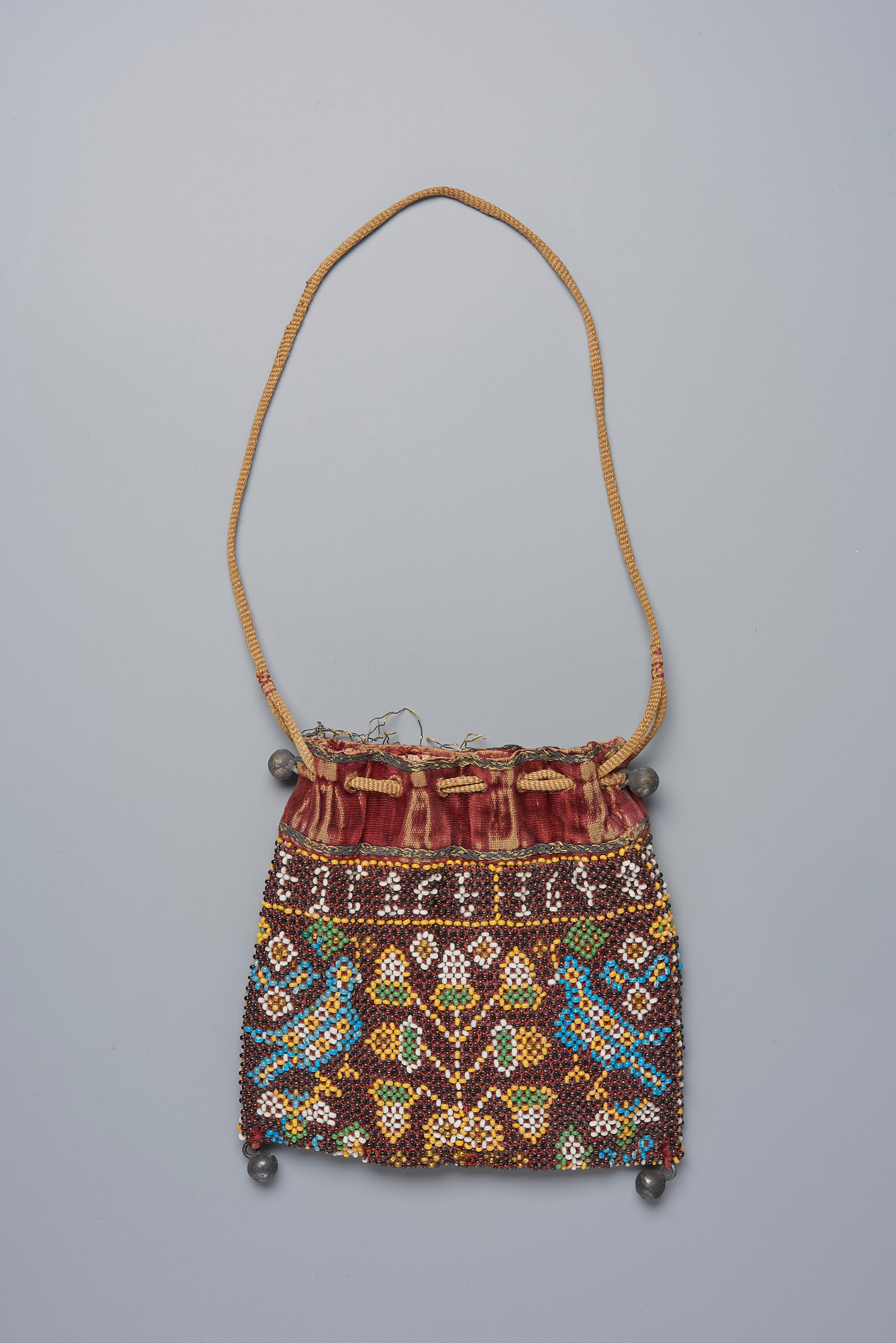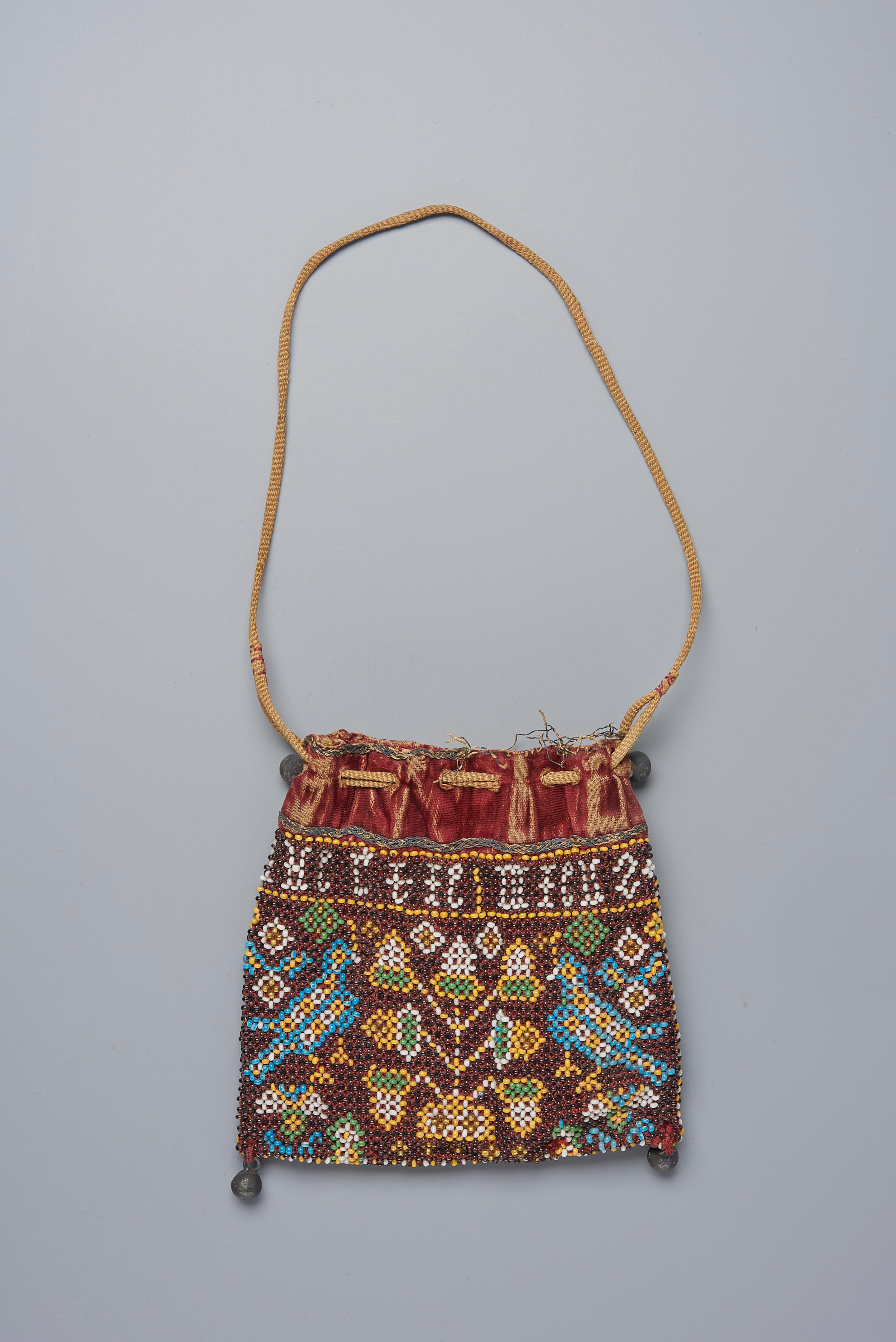 Een tasje of reticule van glaskralen, vervaardigd in een soort knooptechniek. Witte kraaltjes vormen de tekst: 'Ghertie Mieus / 't Graft / 1648'. Langs de bovenzijde is het tasje voorzien van een strook fluweel met een rode zijden pool. Op het fluweel zijn twee gevlochten bandjes genaaid. Het tasje is gevoerd met naturelkleurig zeemleer. Het ...