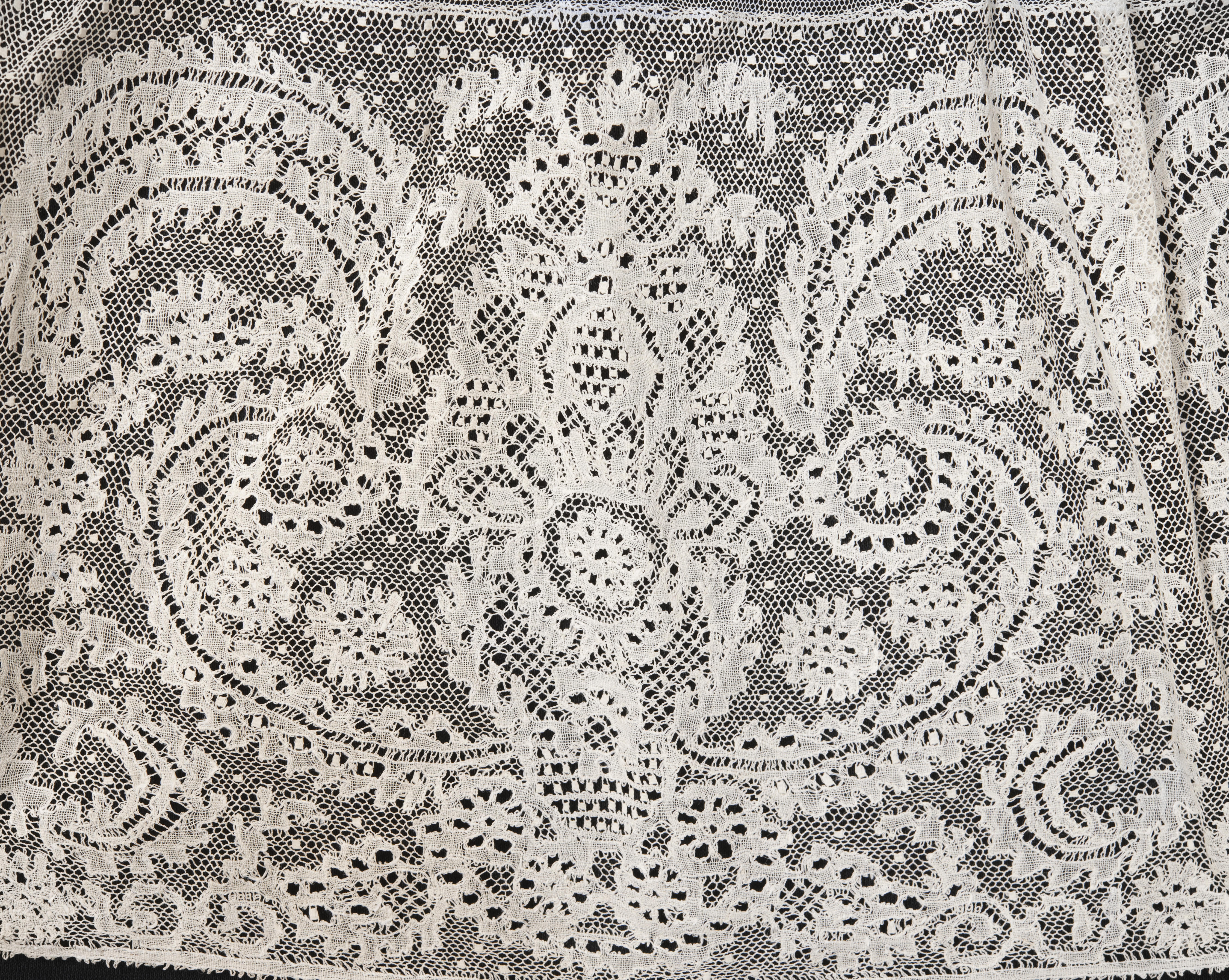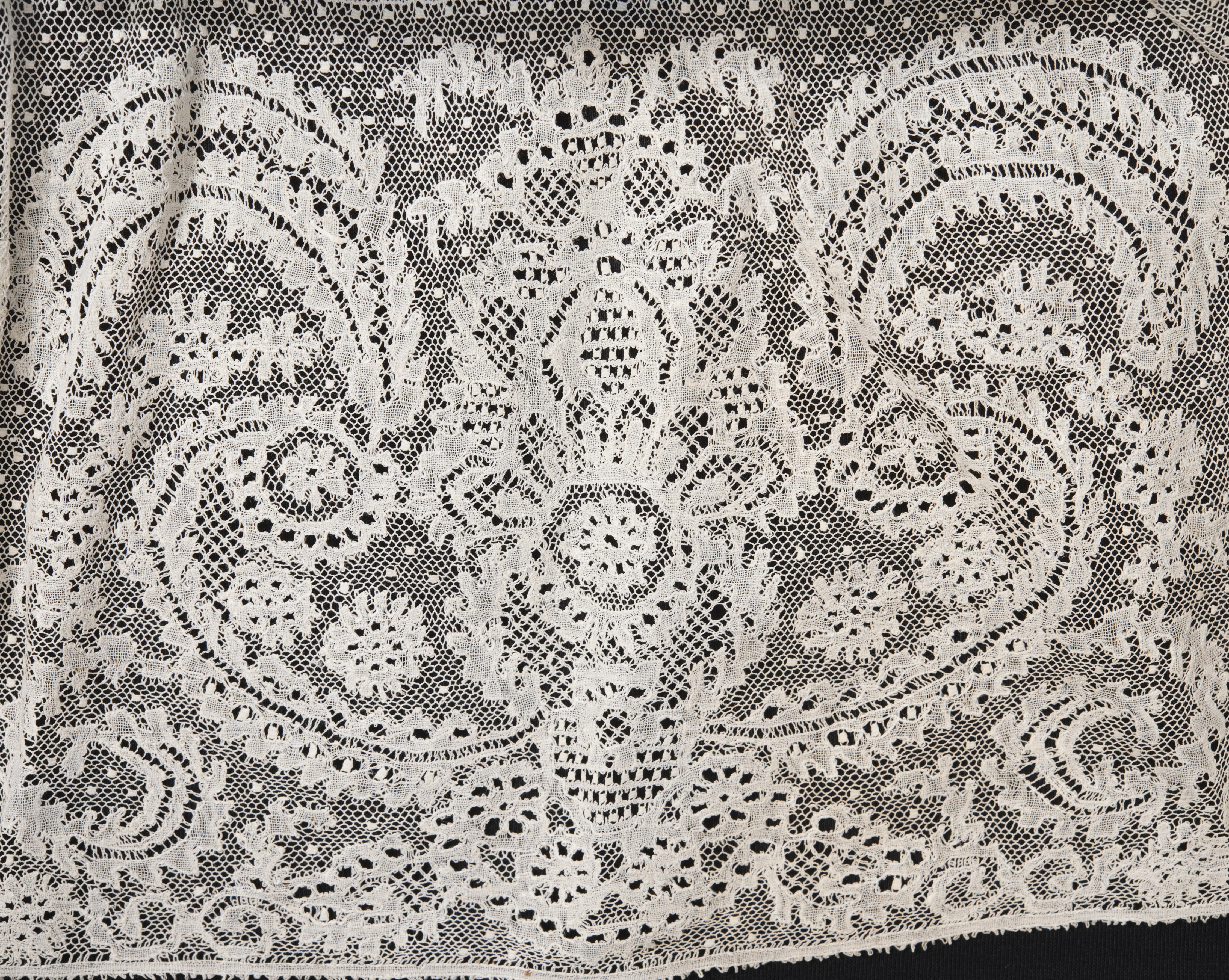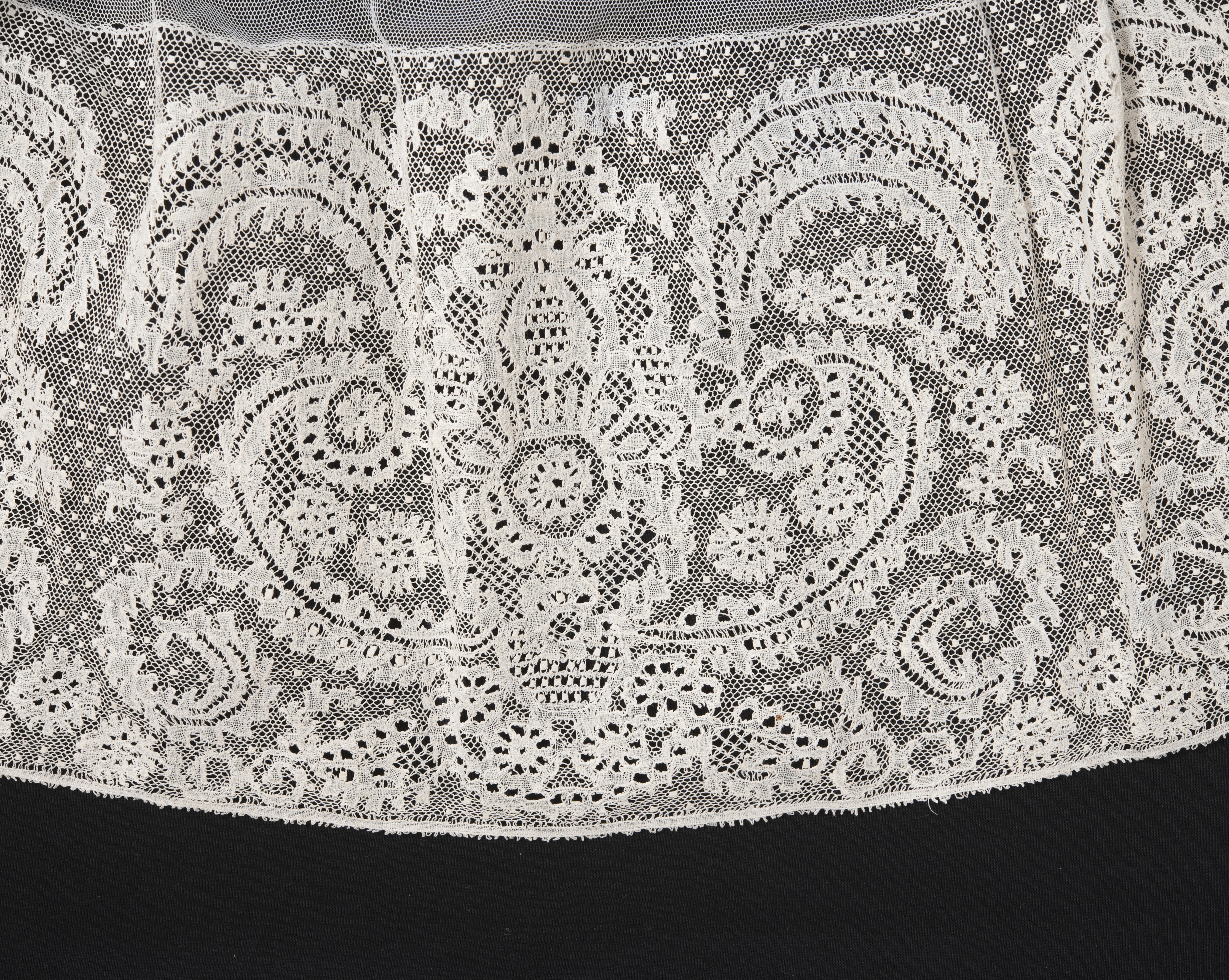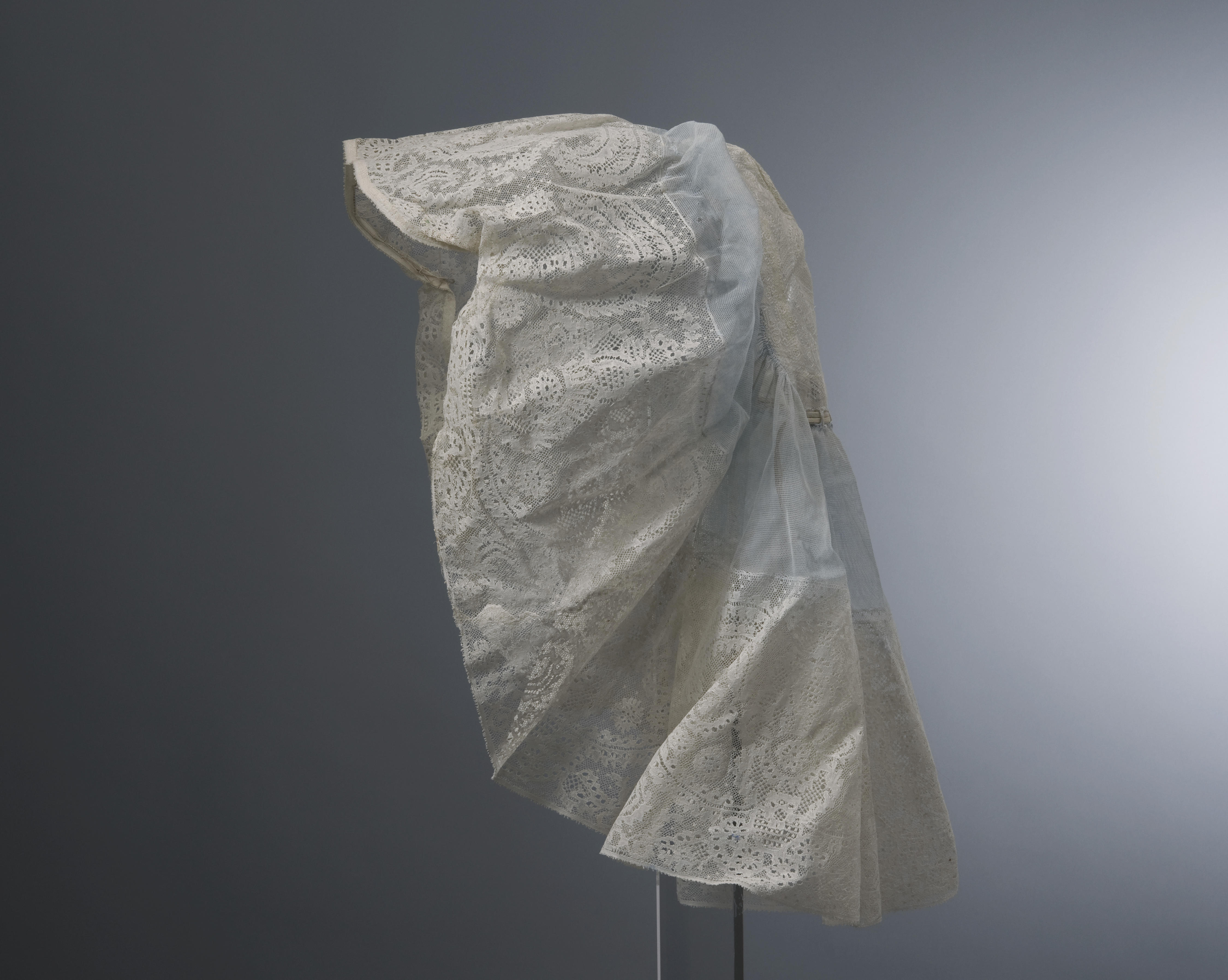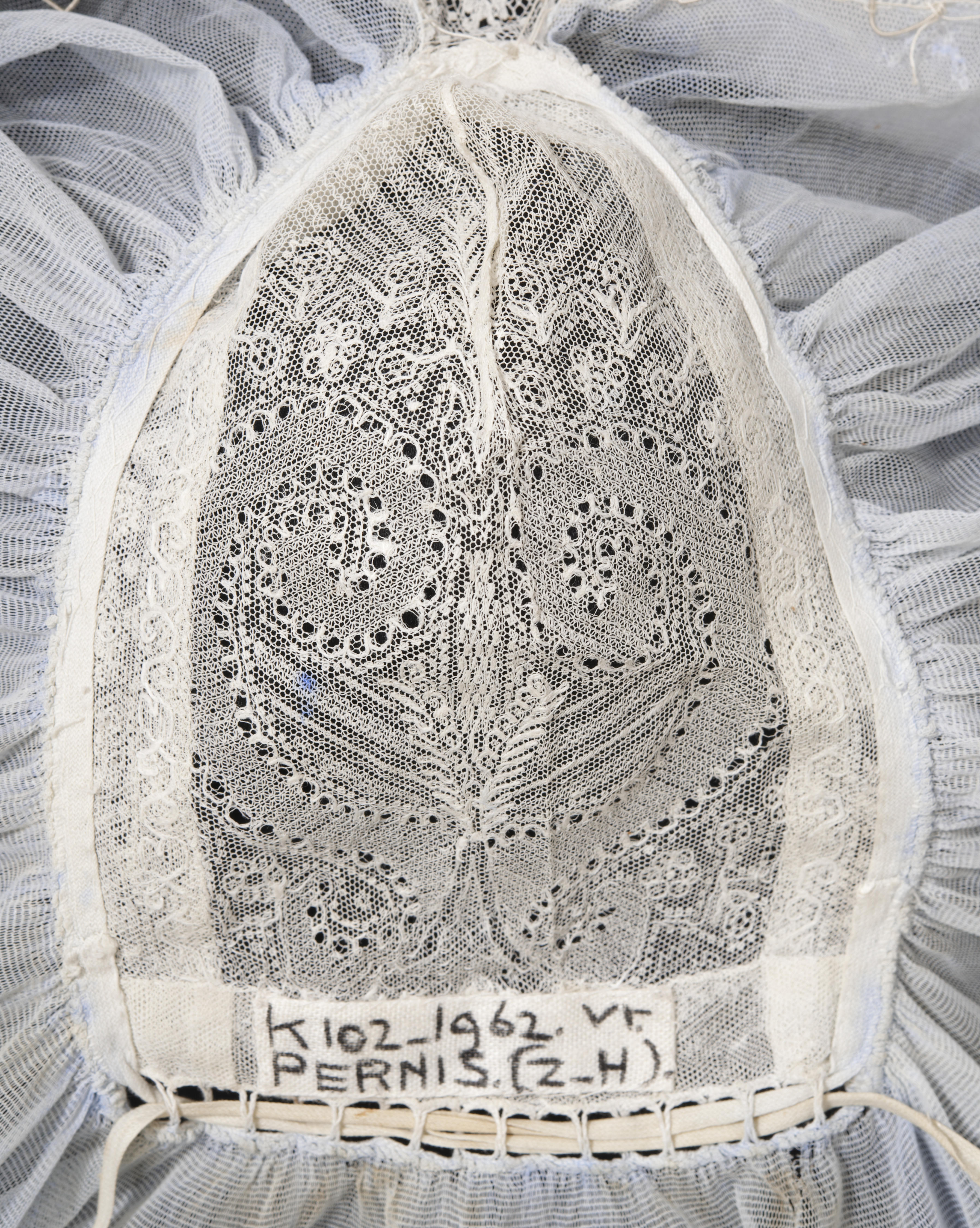 Sluiermuts met een bol van geborduurde tule en een sluier van machinale tule die geblauwd is. Aan de sluier zit een brede strook driebloemskant, voorzien van een tulen grond met symmetrisch en gestileerd bloem- en bladmotief in linnenslag. De contour van de motieven is met een dikkere draad geaccentueerd.
