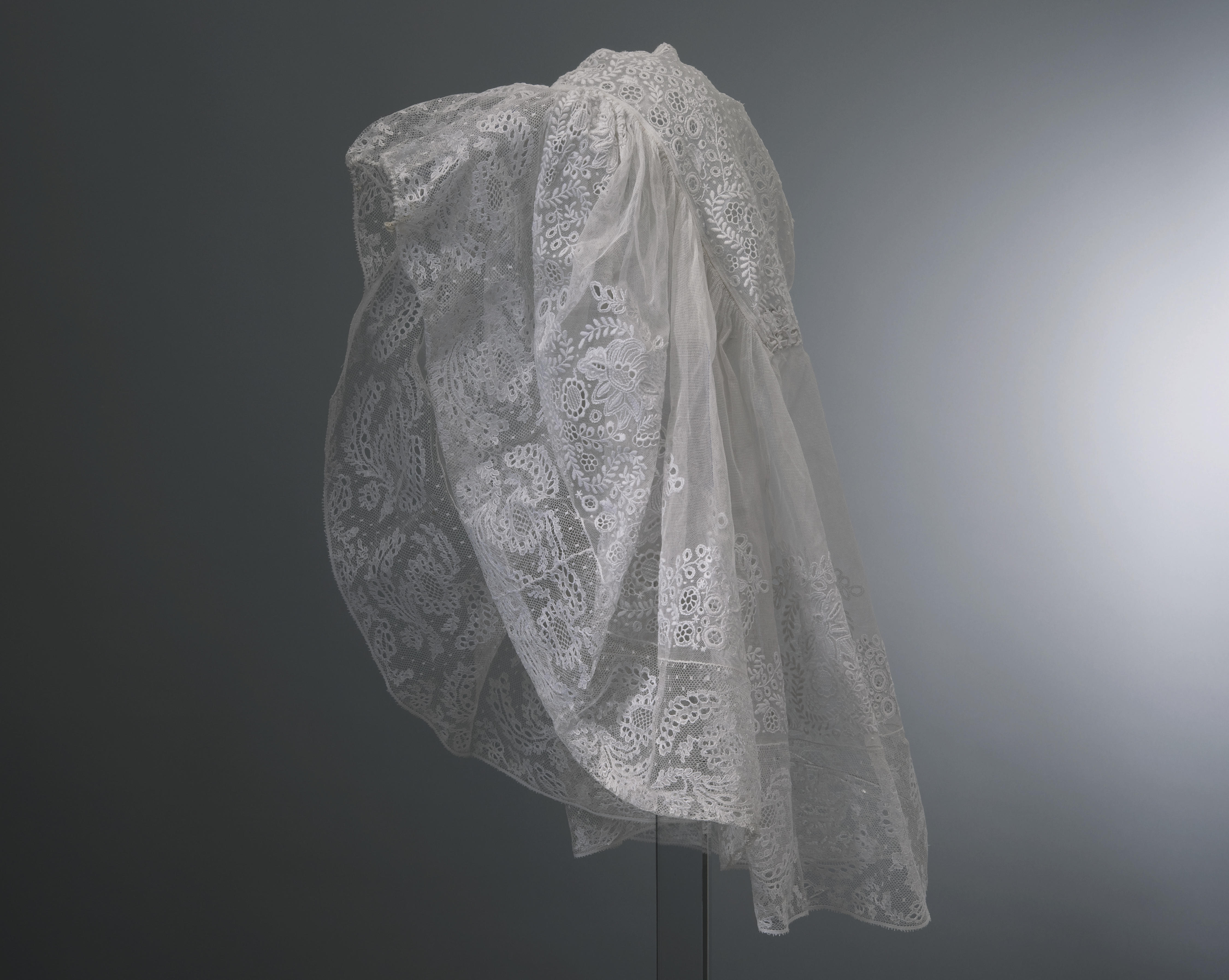 Lange muts of sluiermuts met een bol en strook van versierde tule. De kantstrook is van Rijselse kant. De muts is afkomstig uit Brielle.