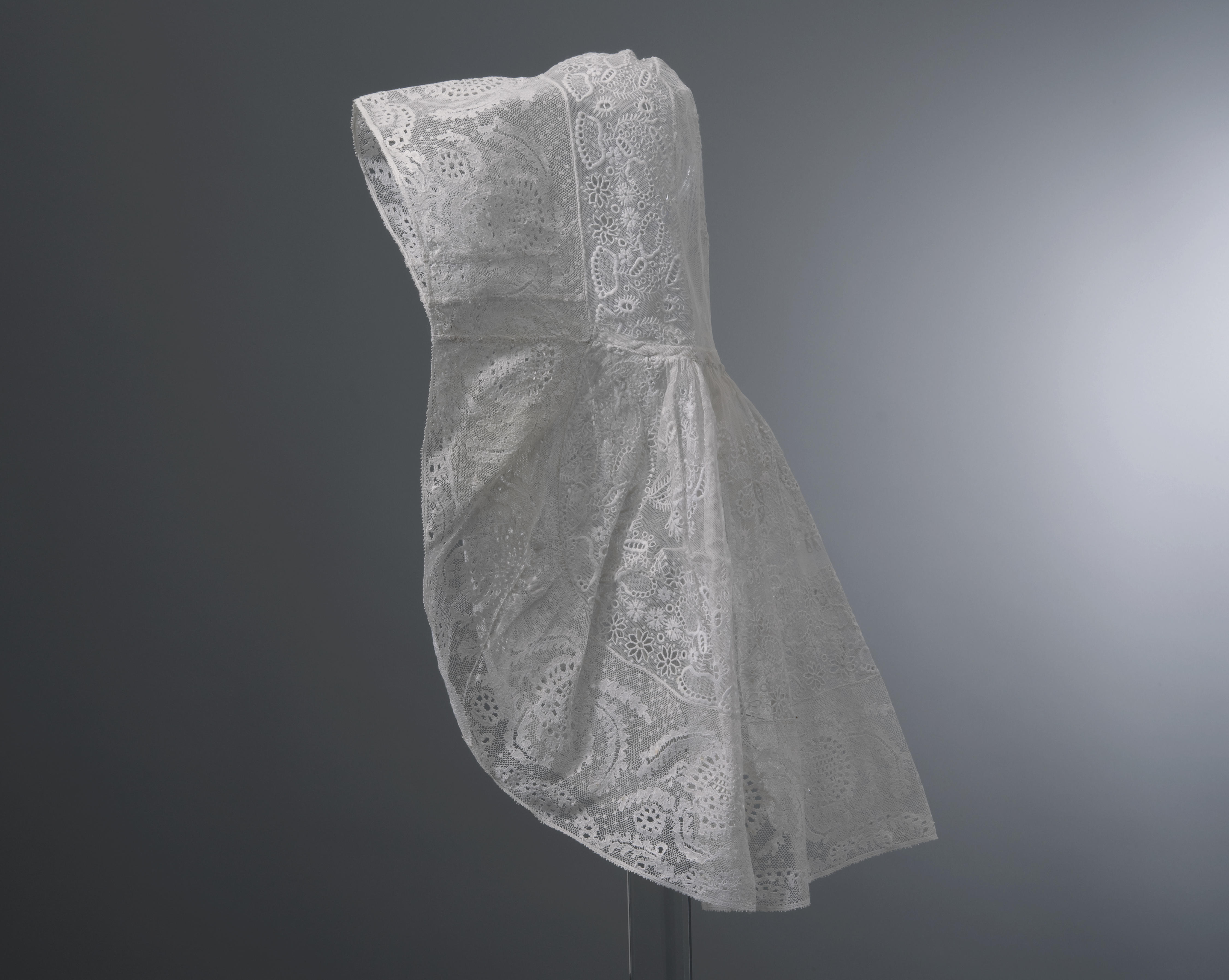 Lange muts met een bol en een sluier van geborduurde tule en een 11 centimeter brede strook van Rijselse kant.