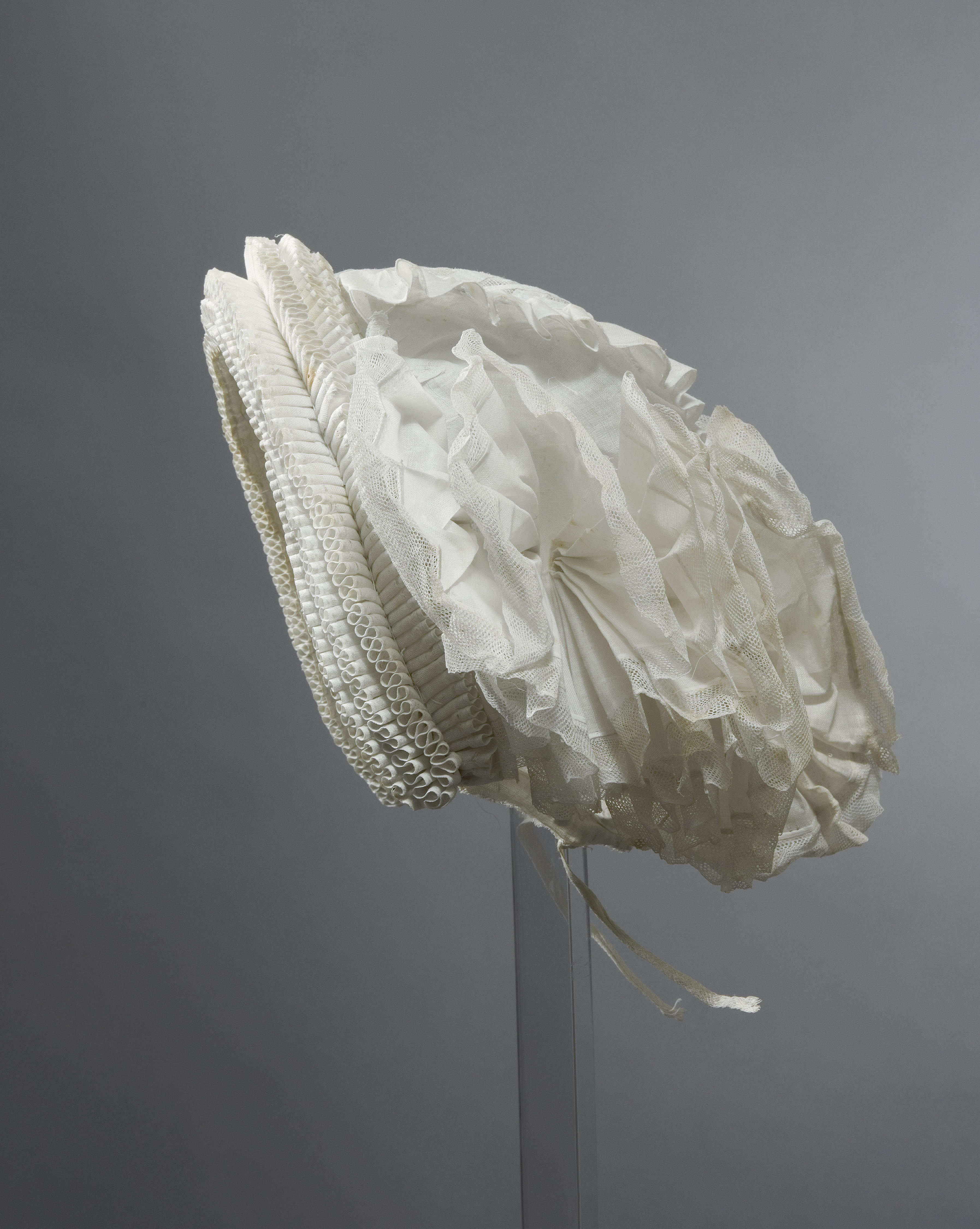 Katoenen opknapmuts voor in de rouw, afkomstig uit Overijssel. Aan weerszijden van de muts zijn koperen oogjes genaaid waarin de haakjes van de keellinten kunnen worden gehaakt.
