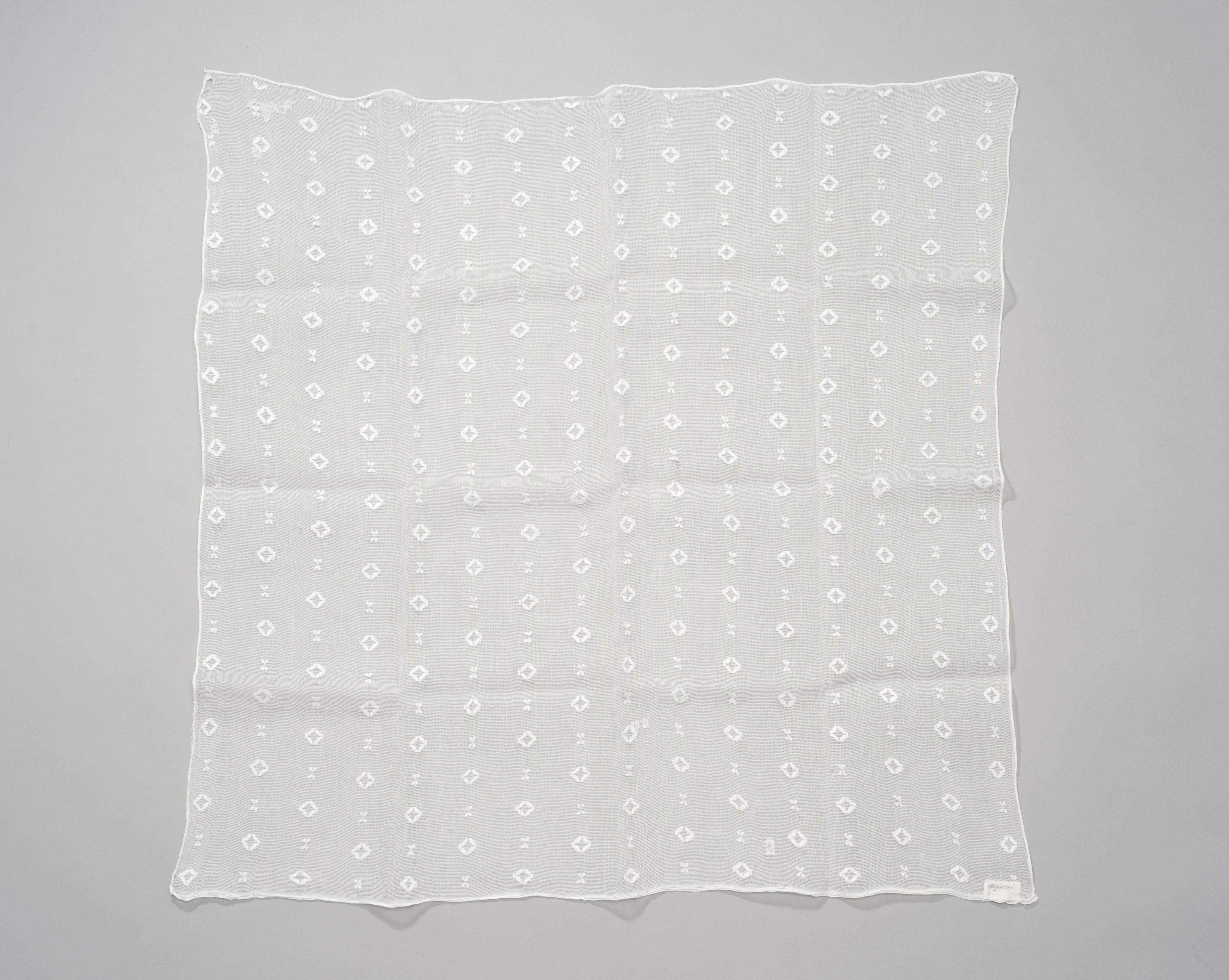 Vierkante schouderdoek van witte katoenen batist met ingeweven motiefjes, afkomstig uit Volendam.