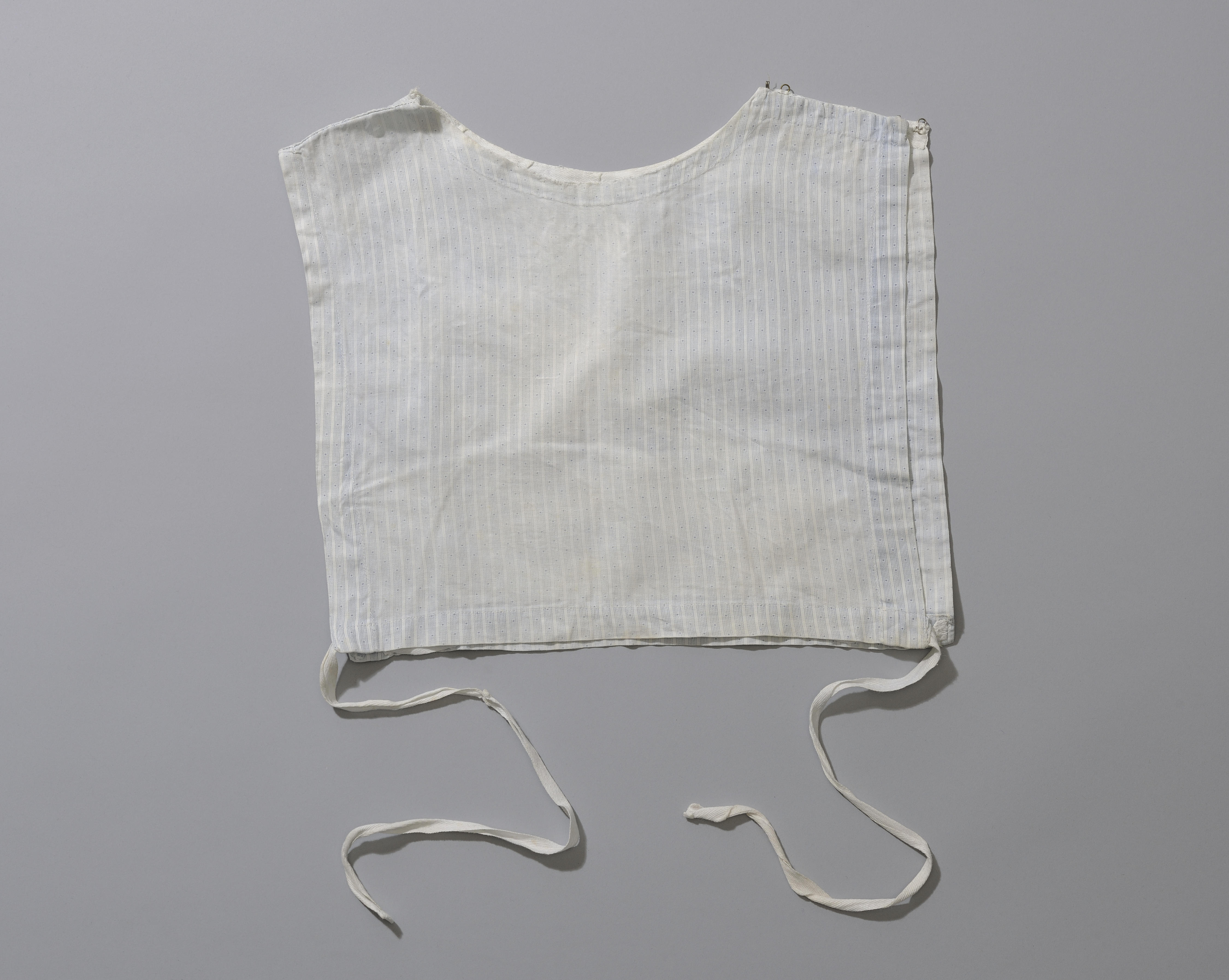 Witte katoenen kraplap. De banden van de kraplap worden in Huizen aan de voorkant onder de boezem gestrikt.
