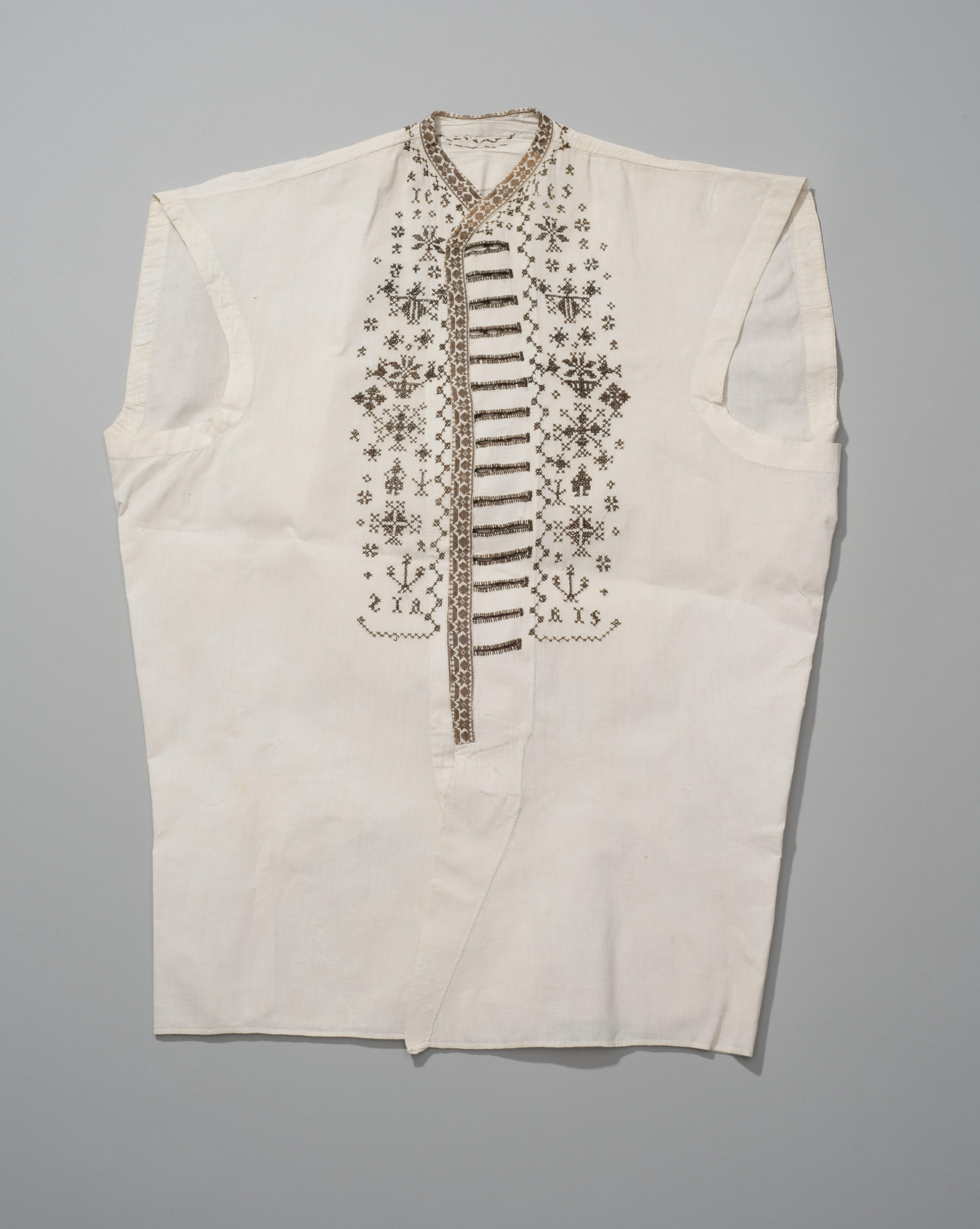 Wit blempt of mouwloos vest voor een Volendammer man of jongen. Nog in het eerste kwart van de twintigste eeuw droeg de Volendammer jongen bij zijn Heilige Communie dit hemd. Hij deed communie wanneer hij elf á twaalf jaar oud was. Het witte katoenen blempt is met zwart garen geborduurd in kruissteekmotieven en langs de ...