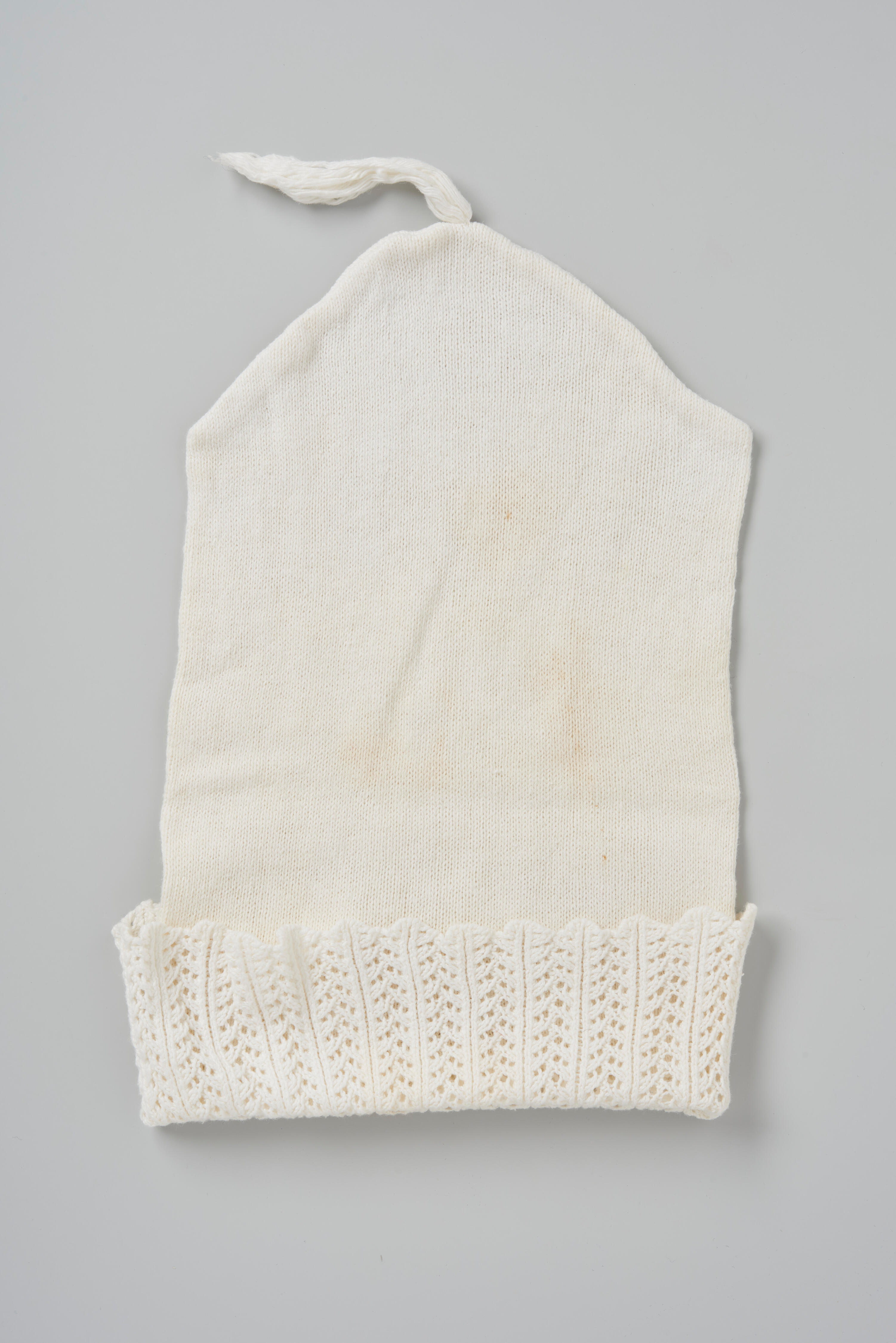 Slaapmuts van een algemeen model, gebreid op vier pennen in tricotsteek, met een rand in ajourbreiwerk.