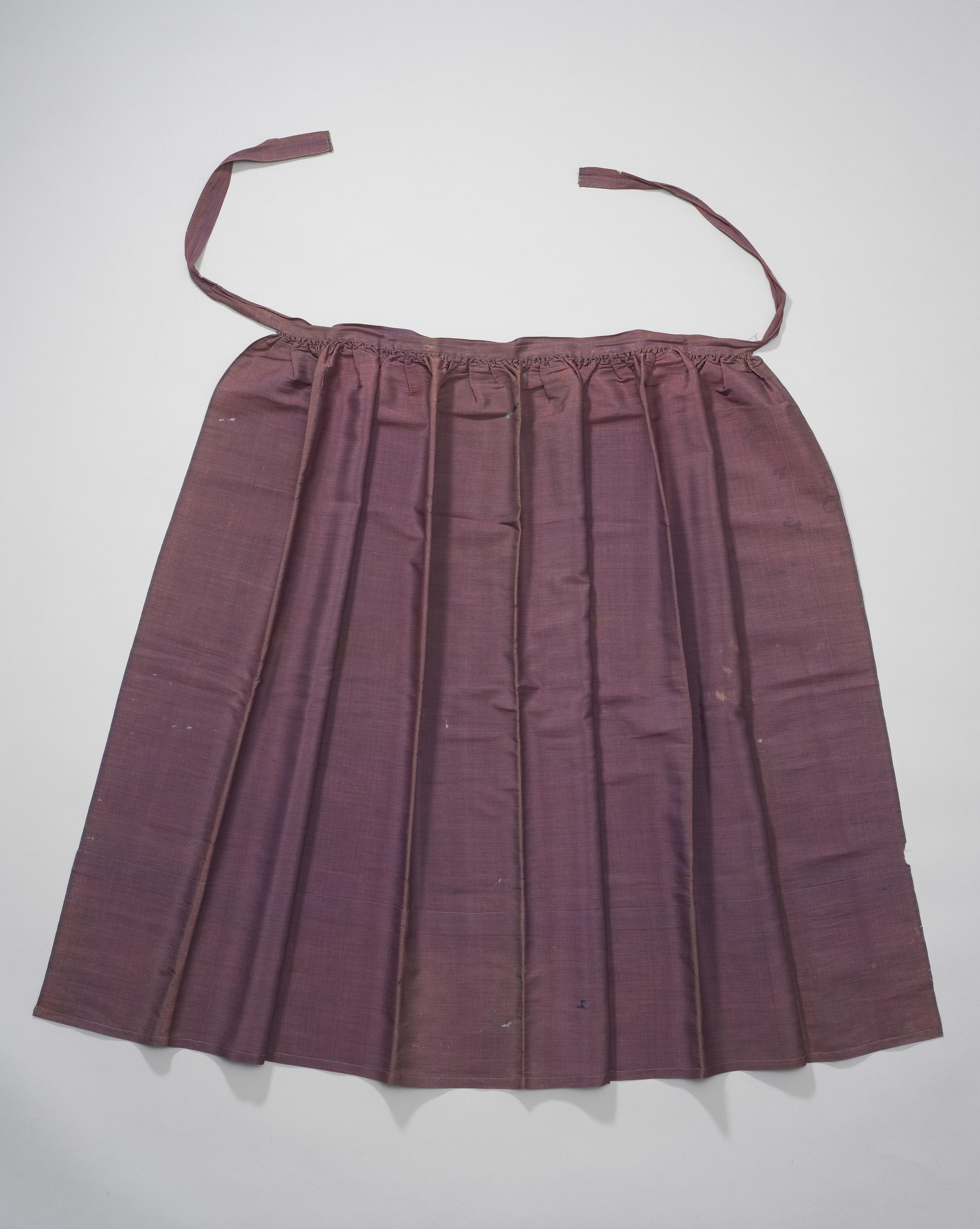 Schort, gemaakt van een changeant stof met een blauwe katoenen ketting en een rode wollen inslag. Het schort is afkomstig uit Oost-Brabant.